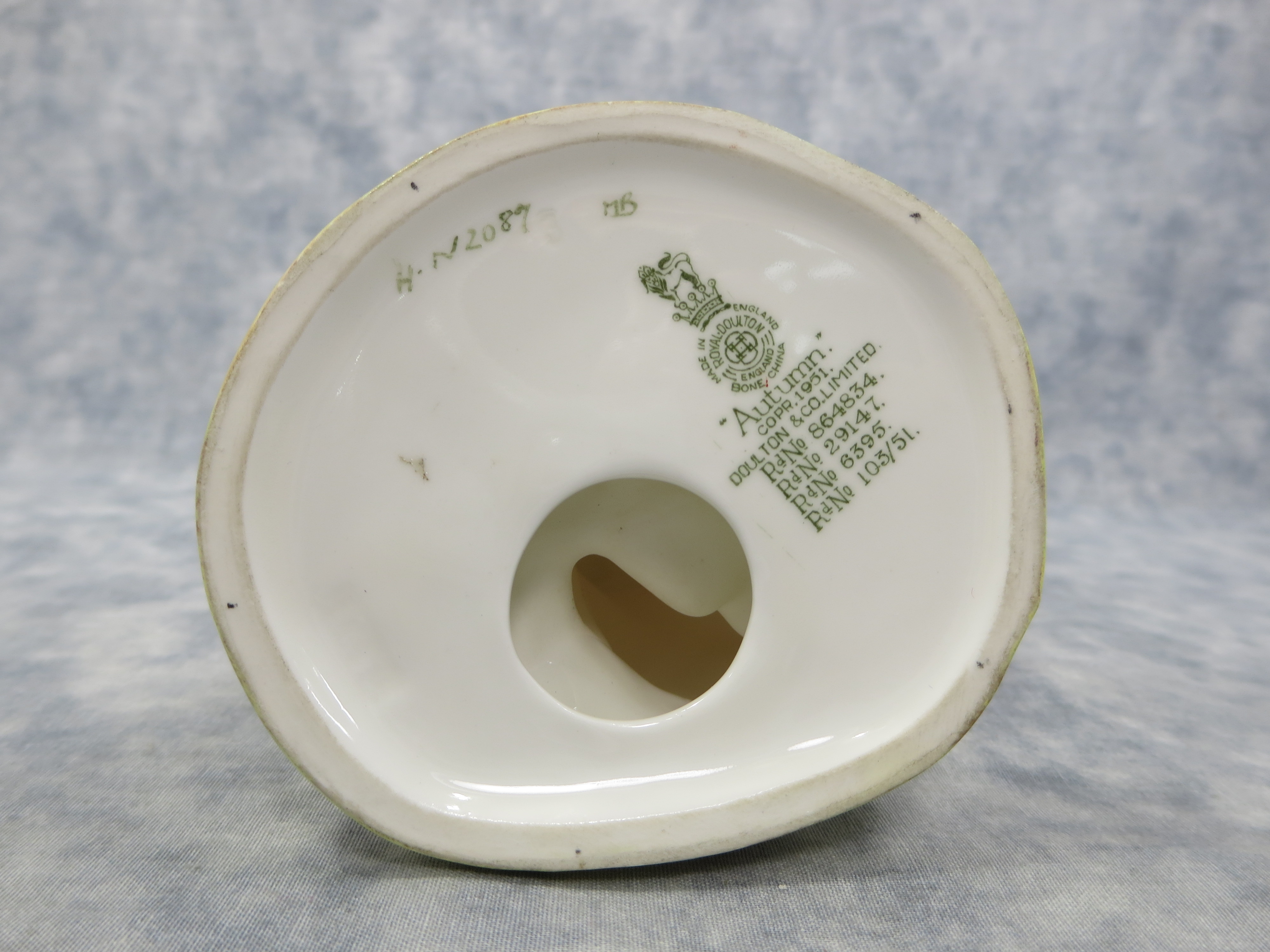 December 14, 2025 - 7-1/2 inches tall. 4-1/2 inches wide. Base is imprinted: HN 2087. Fully Marked with the Royal Doulton Lion and Crown in green on bottom of base with copyright 1951.
