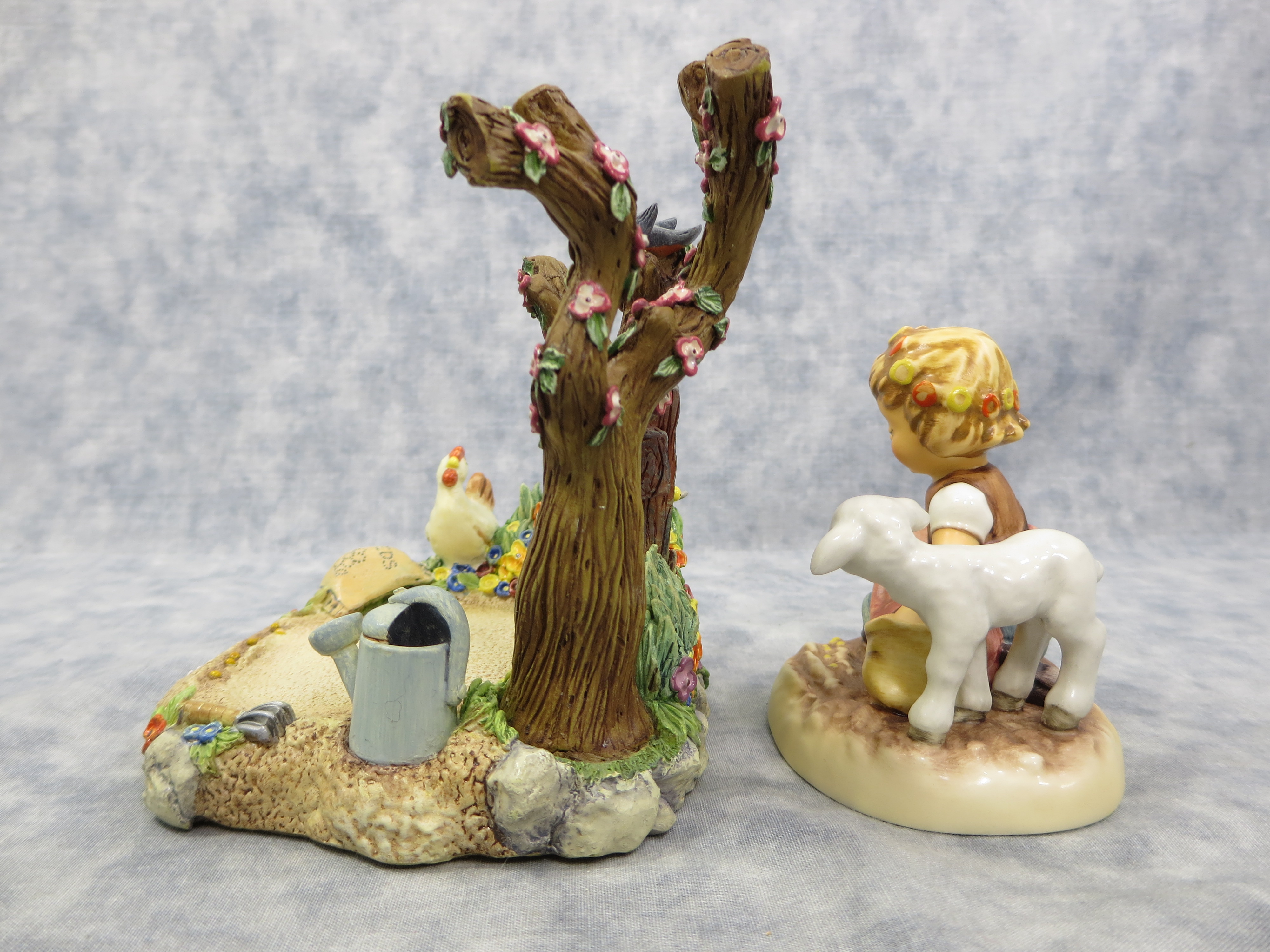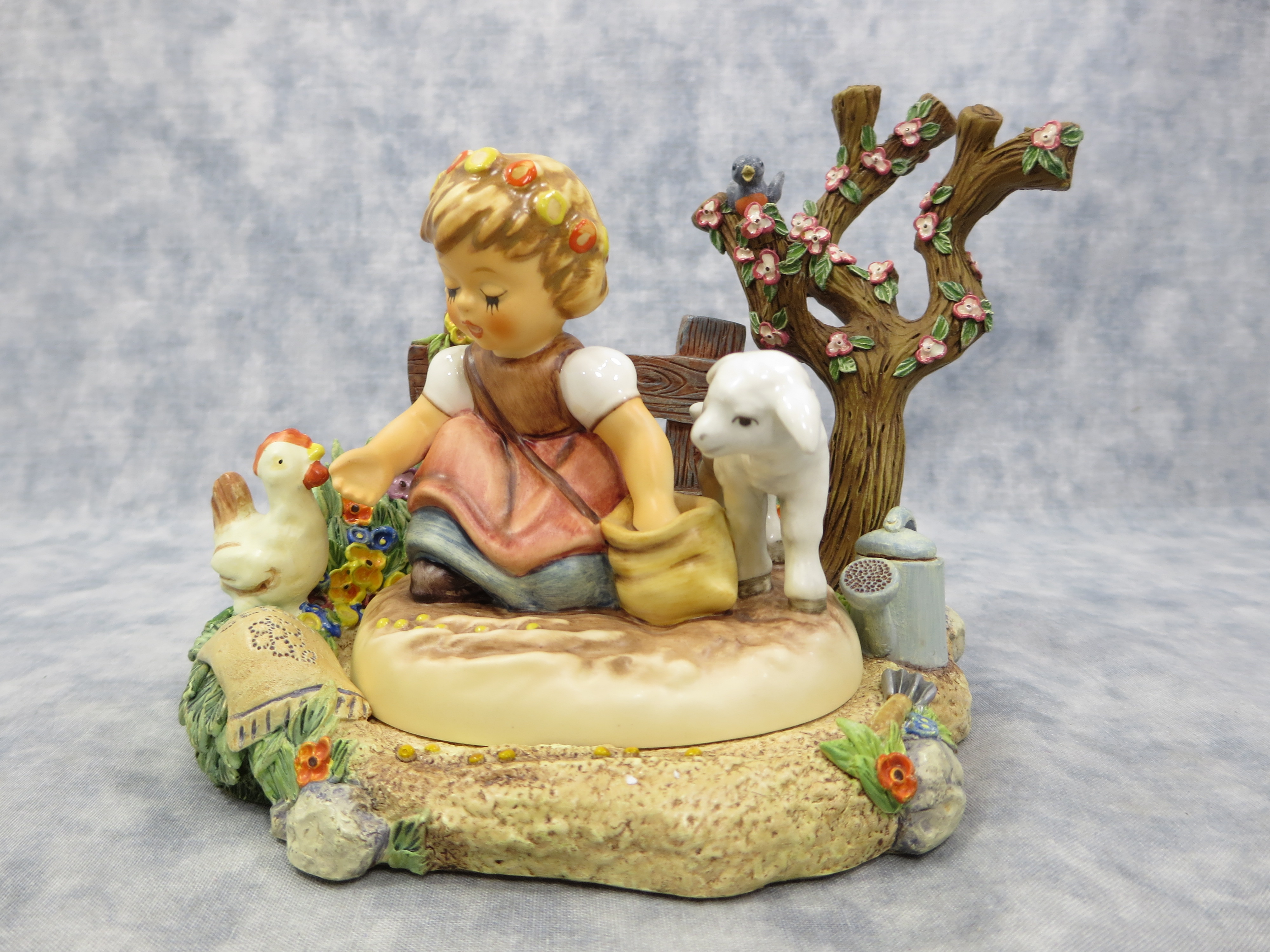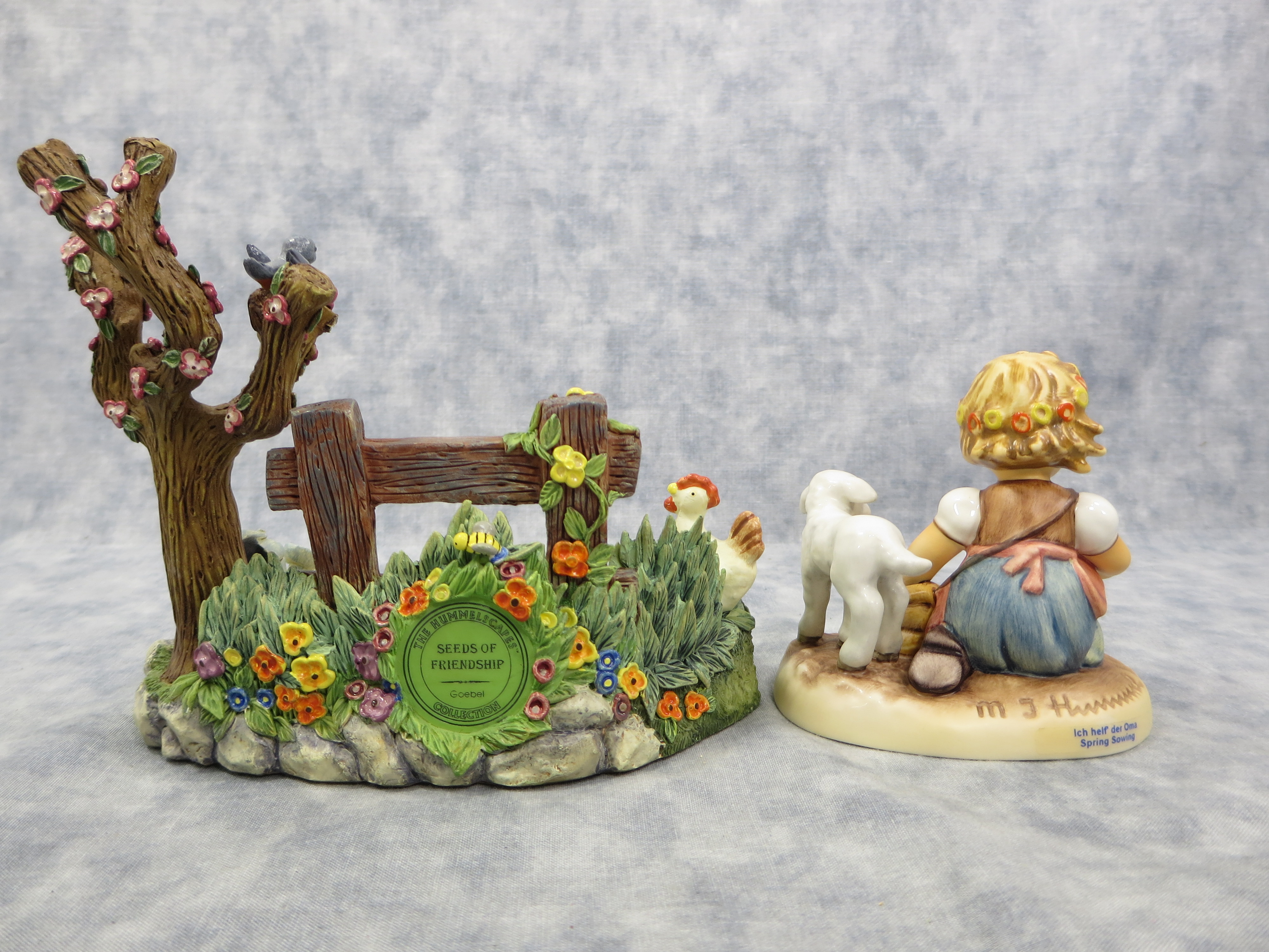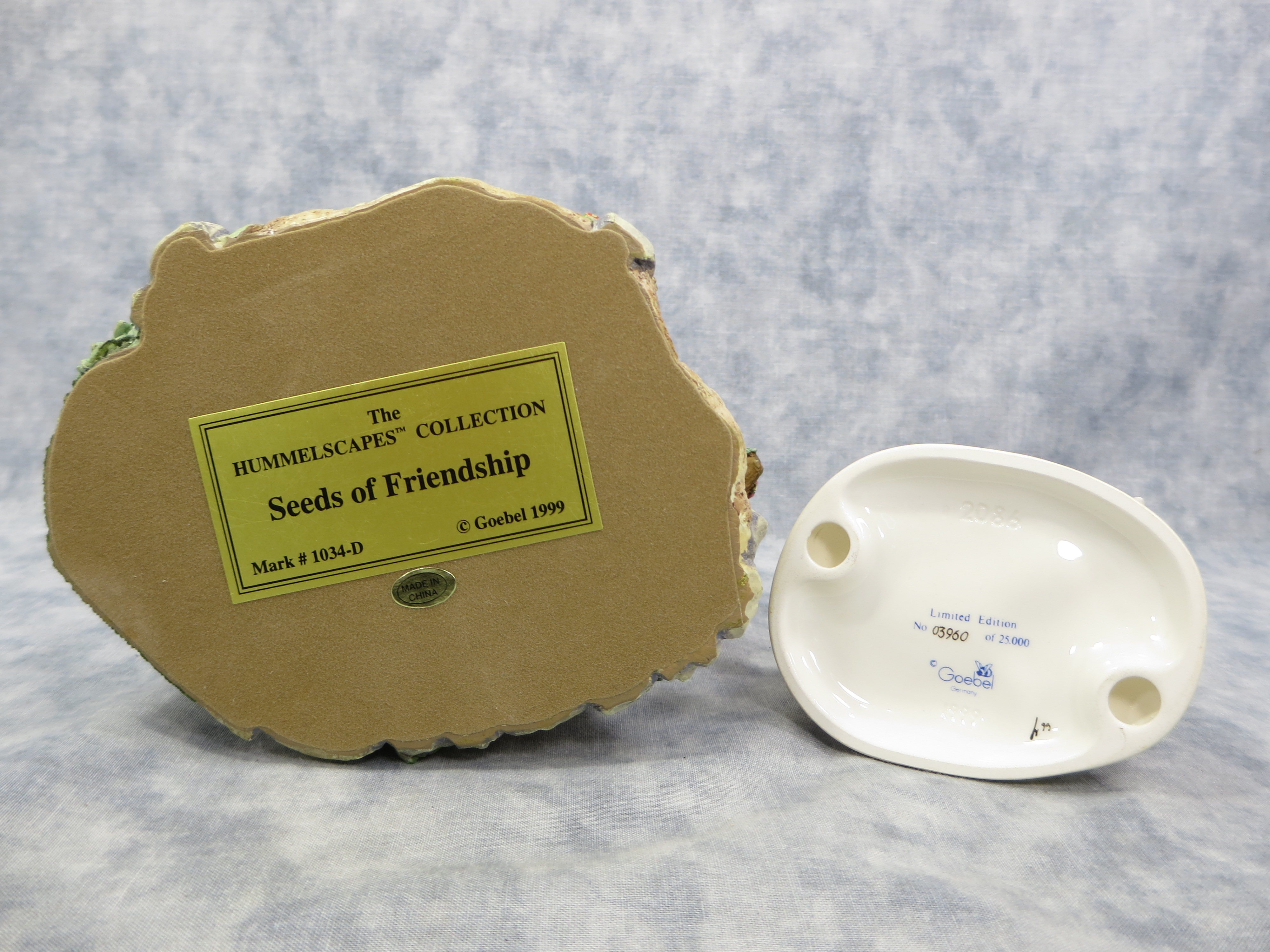 SEEDS OF FRIENDSHIP hummelscape is 5 inches tall by 6-1/4 inches wide. Base nameplate reads The Hummelscape Collection / Seeds of Friendship / Mark #1034-D / Goebel 1999.