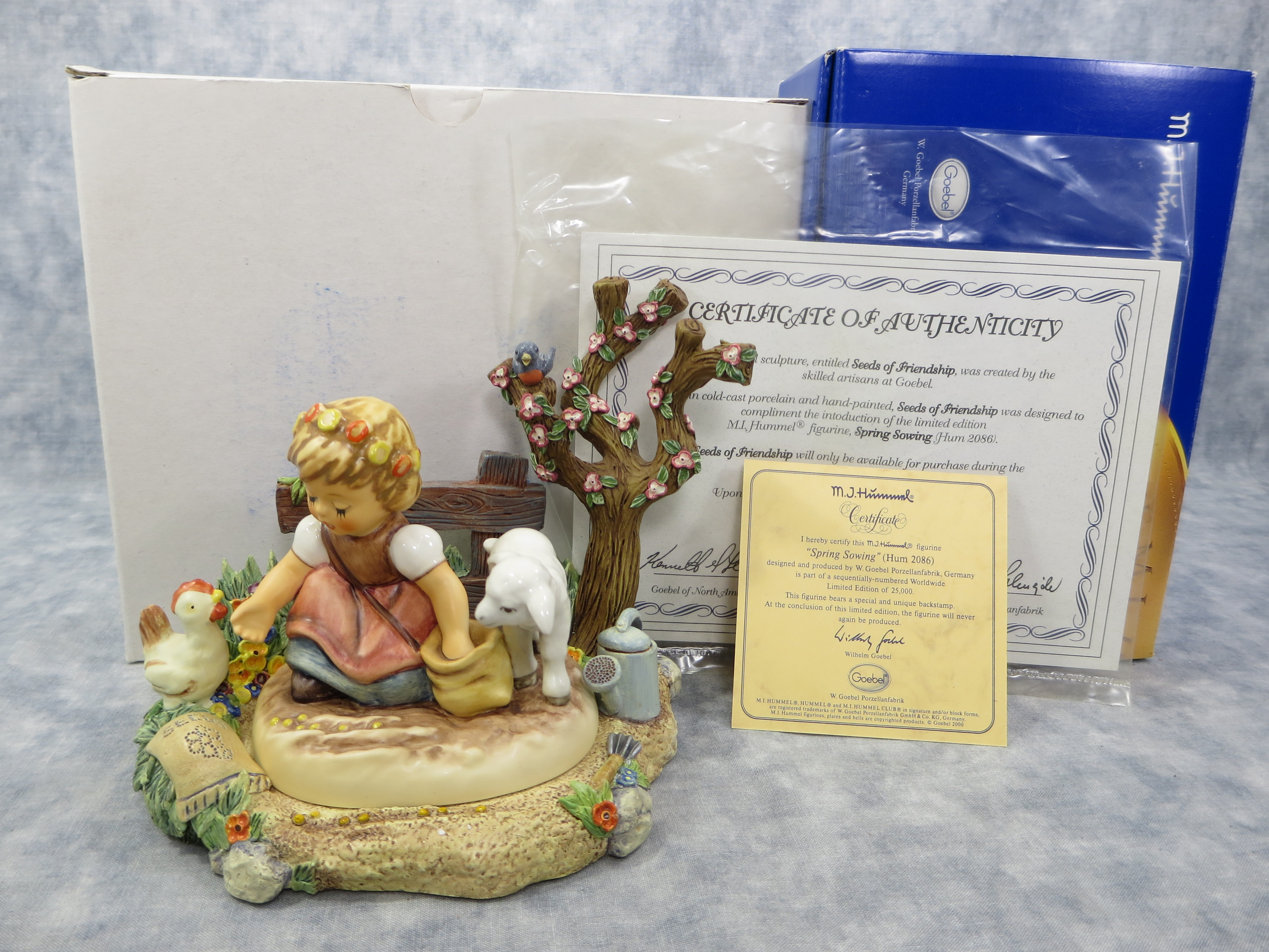 January 16, 2026 - SPRING SOWING figurine is 3-1/2 inches tall. Base is incised 2086 and 1999. Goebel TMK 8 trademark and 'Limited Edition No. 03960 of 25,000' imprinted in blue on bottom of base. Artist hand initialed and dated in black ink.