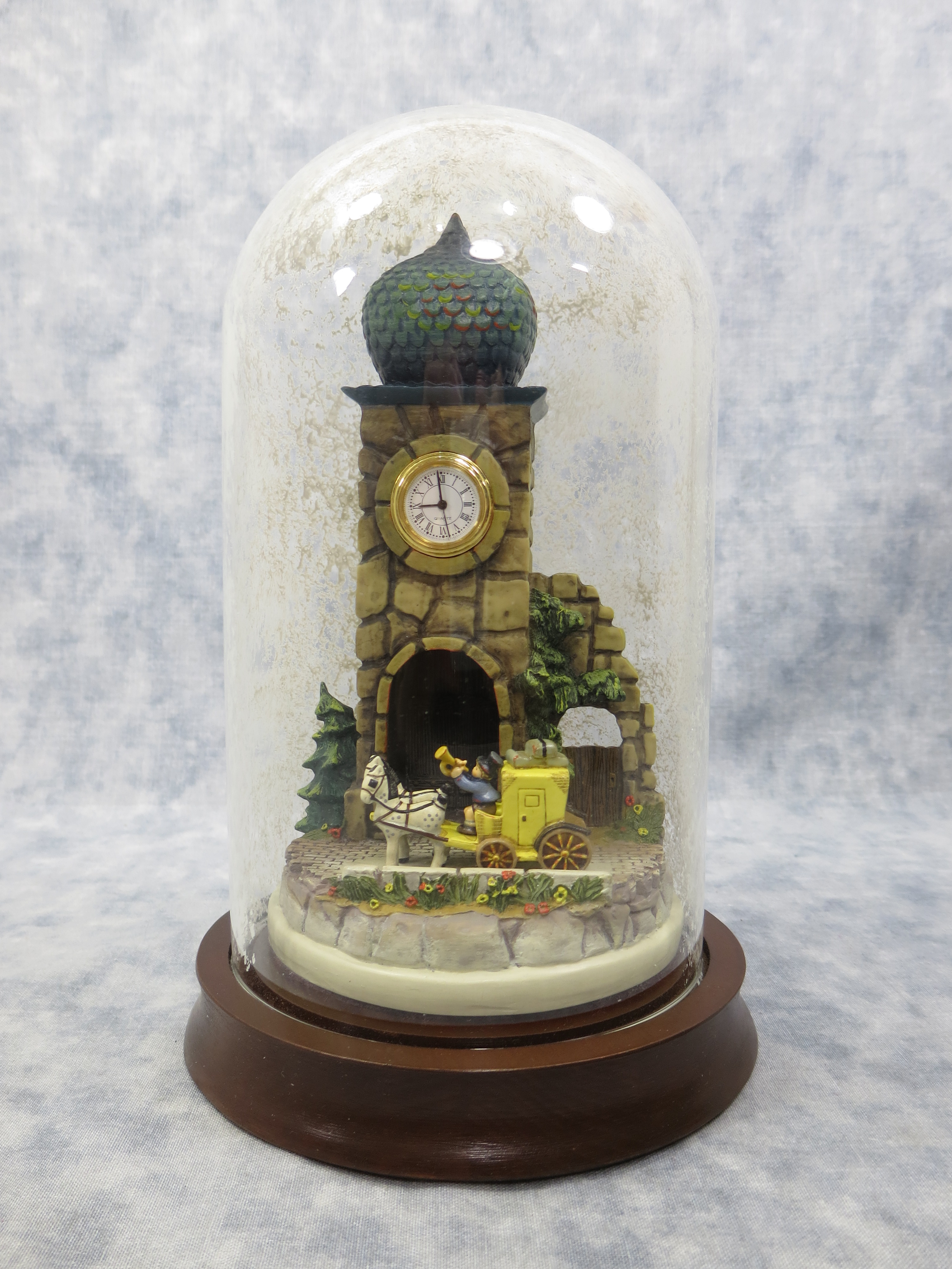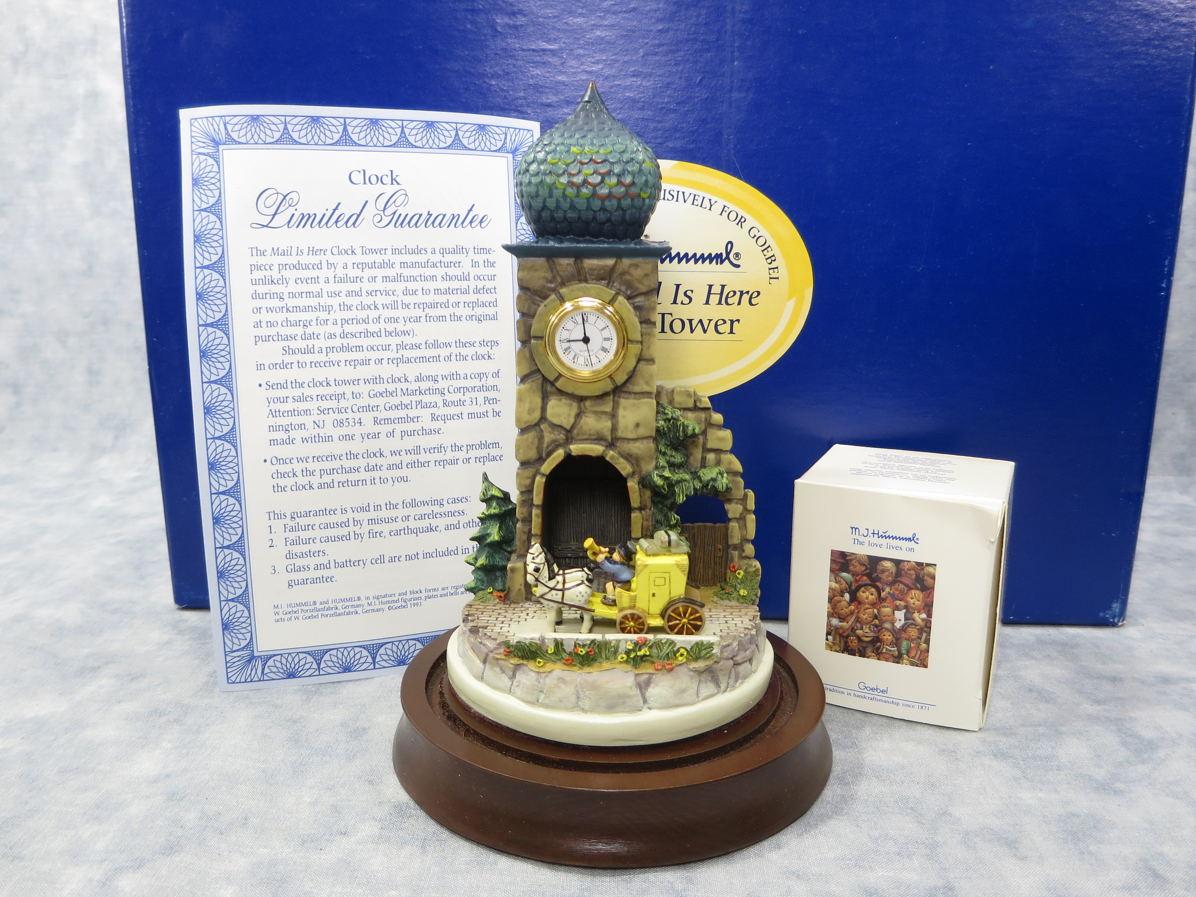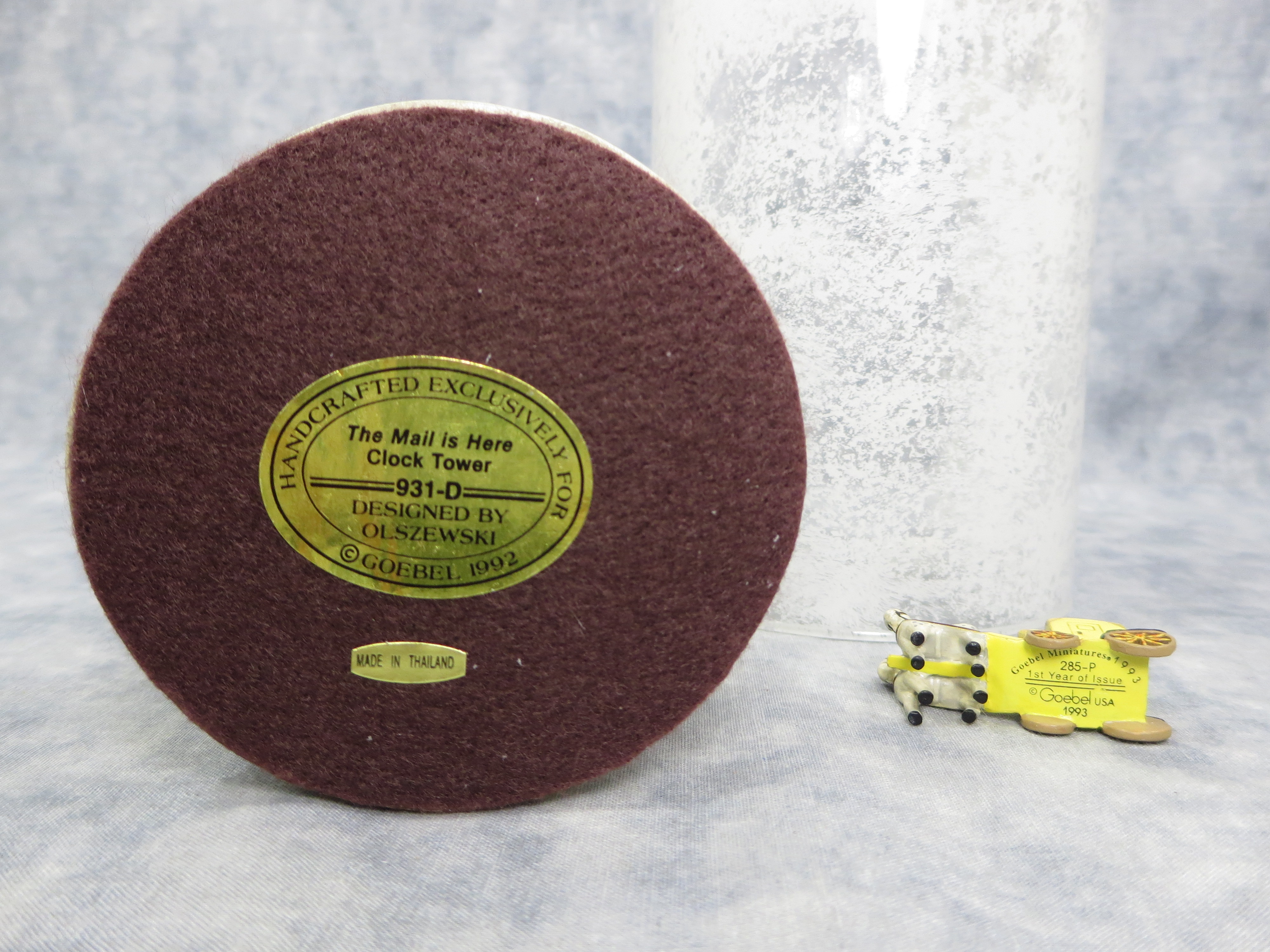 CLOCK TOWER is 6-1/2 inches tall. Wooden base with glass globe is 7-1/2 inches tall by 4-7/8 inches wide. Base nameplate is stamped HANDCRAFTED EXCLUSIVELY FOR GOEBEL 1992/ The Mail is Here Clock Tower / 931-D / DESIGNED BY OLSZEWSKI.