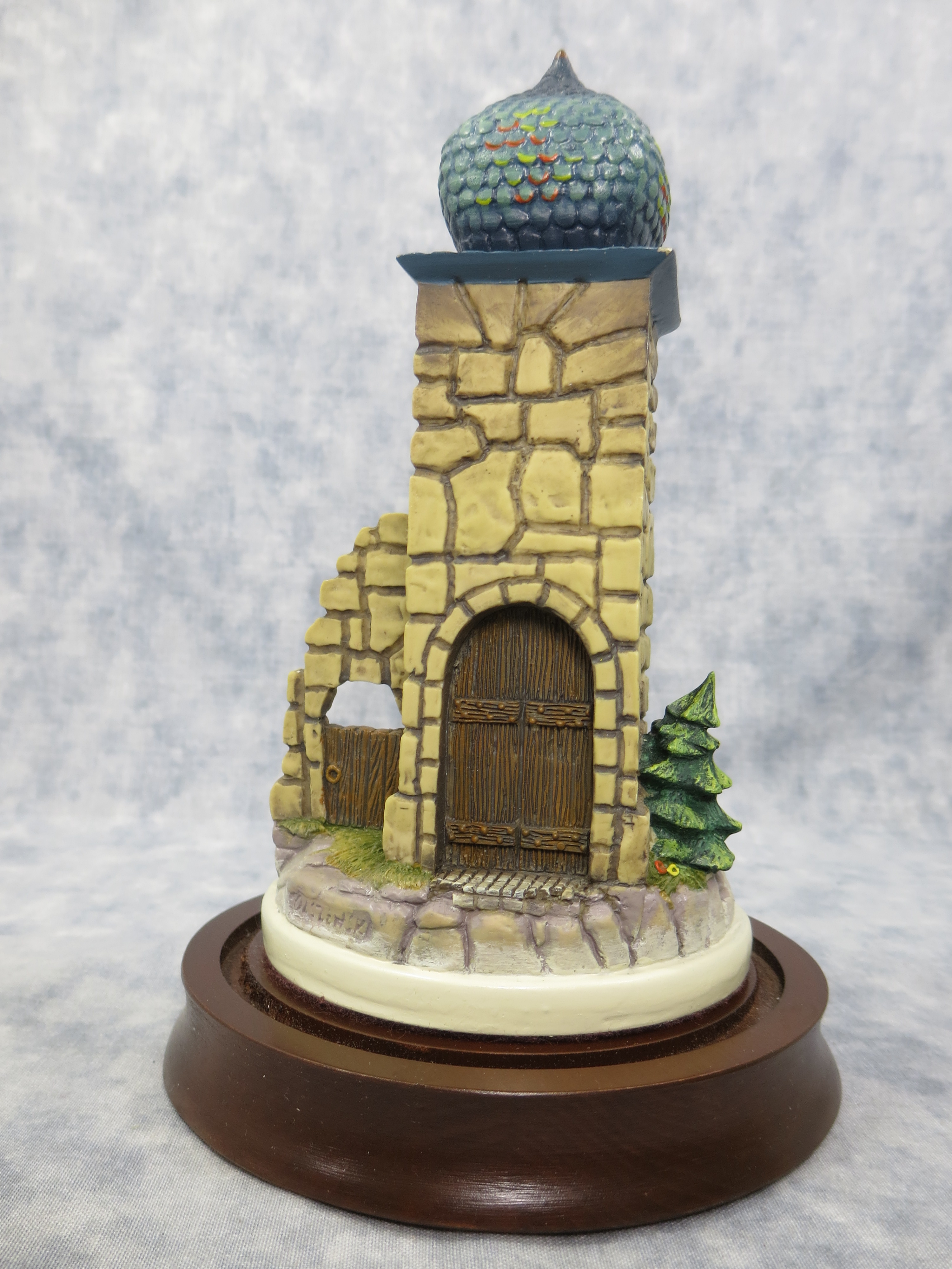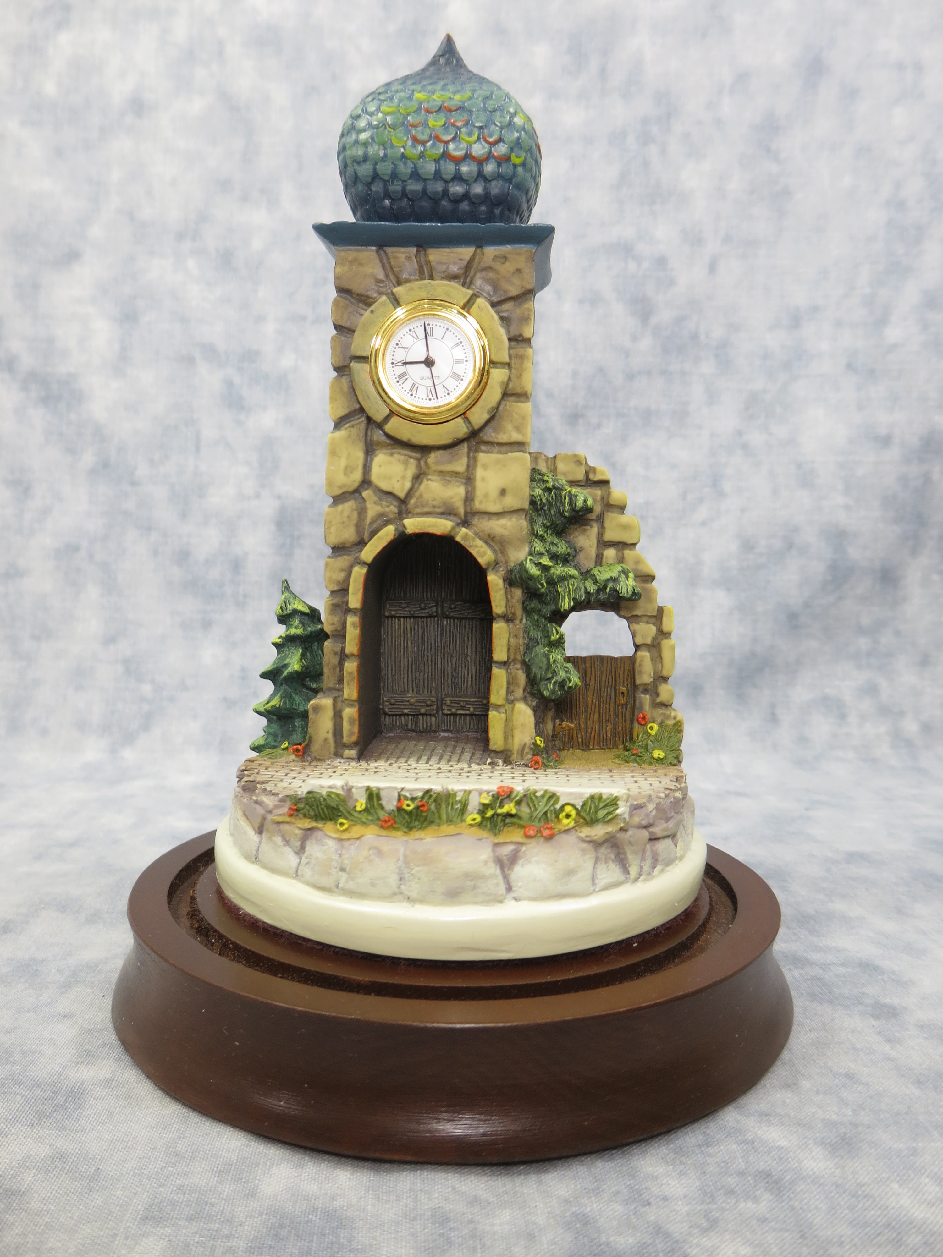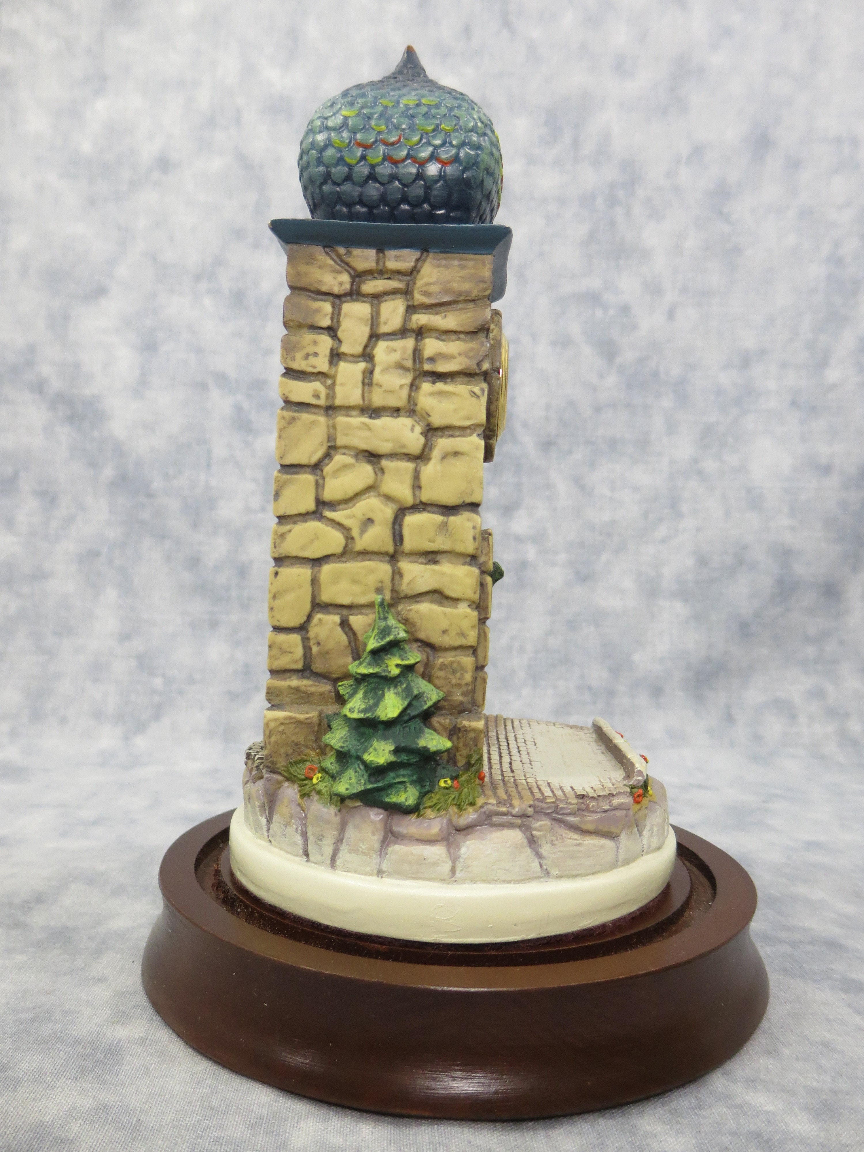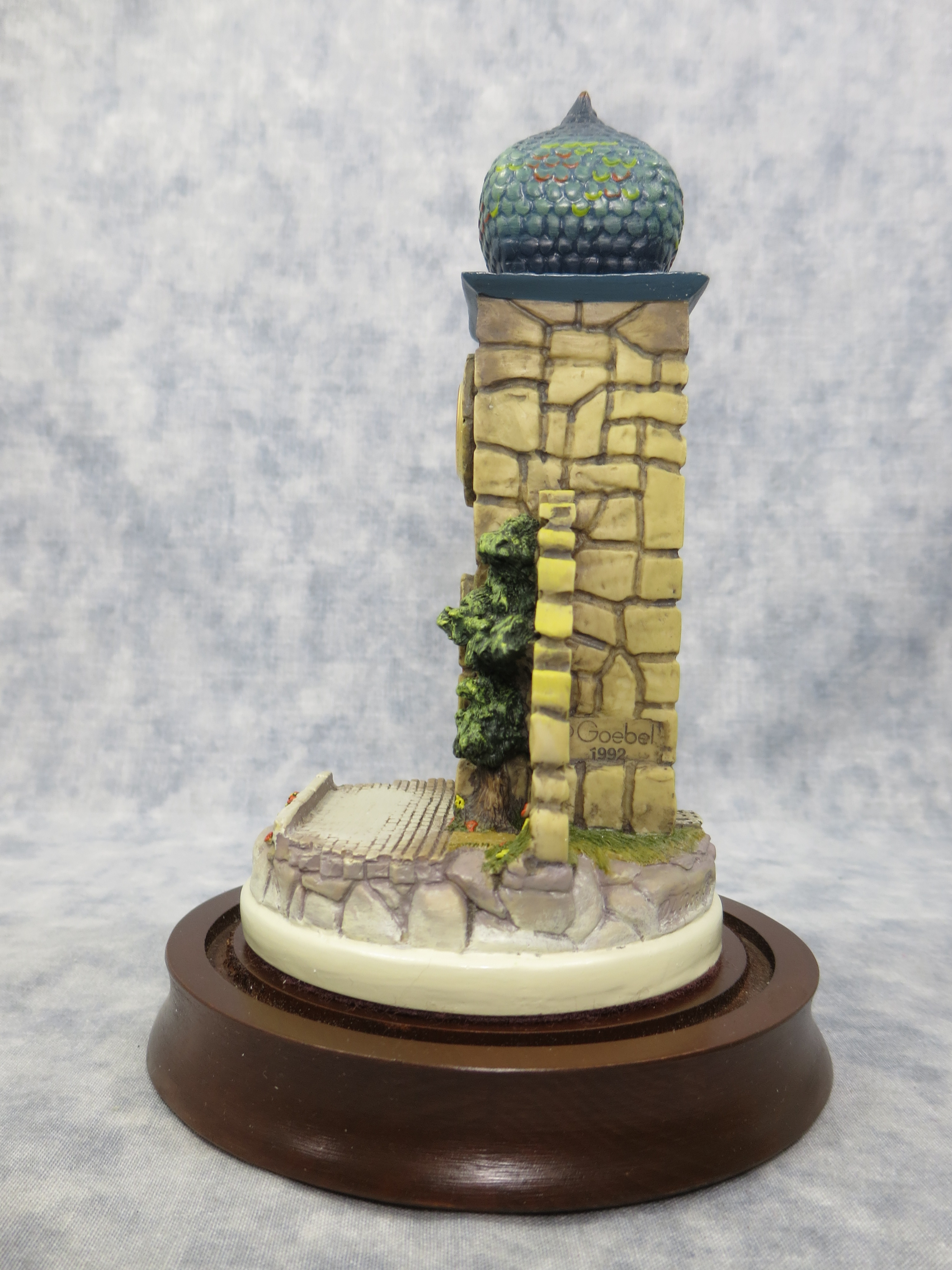 CLOCK TOWER is 6-1/2 inches tall. Wooden base with glass globe is 7-1/2 inches tall by 4-7/8 inches wide. Base nameplate is stamped HANDCRAFTED EXCLUSIVELY FOR GOEBEL 1992/ The Mail is Here Clock Tower / 931-D / DESIGNED BY OLSZEWSKI.