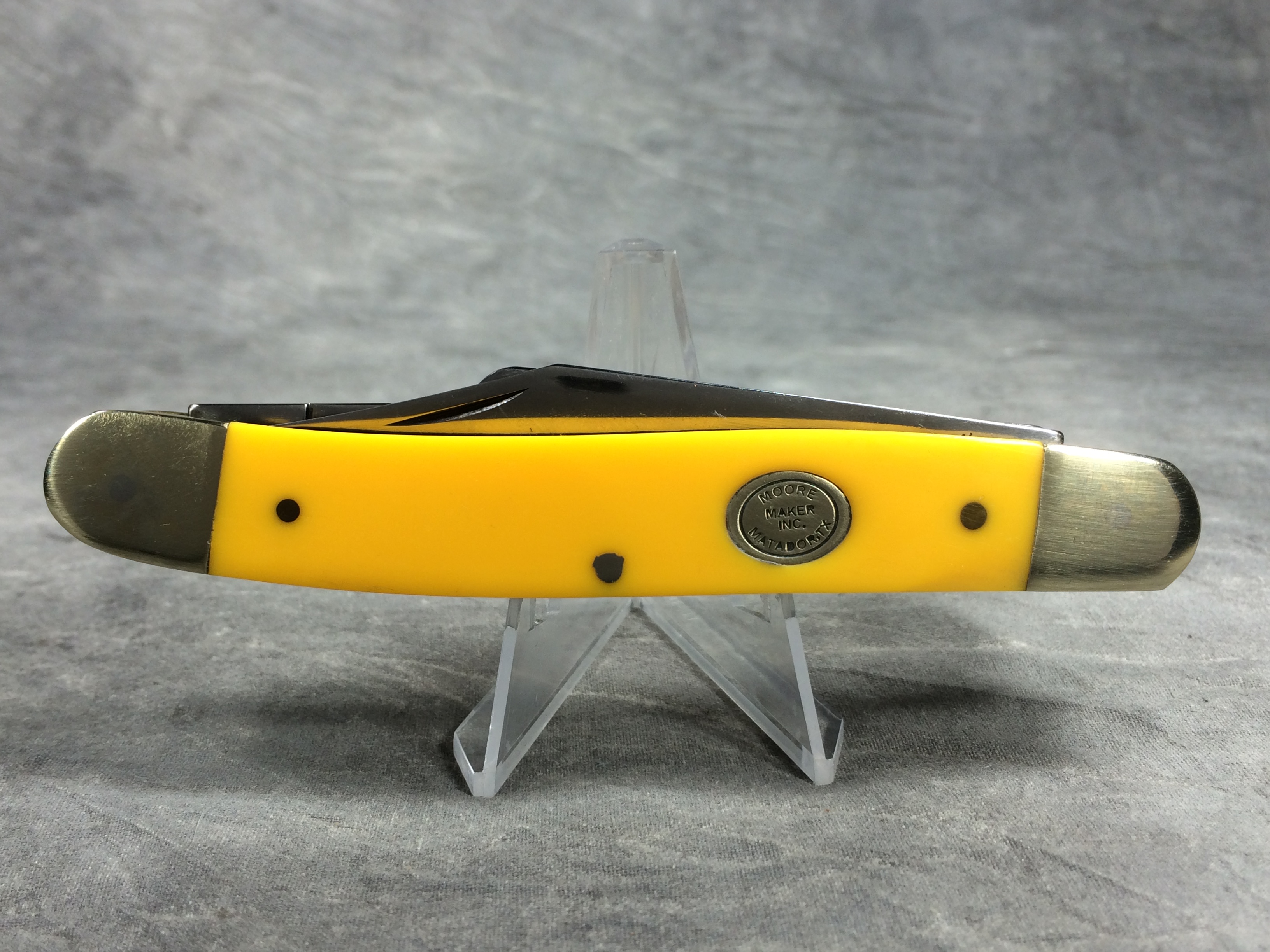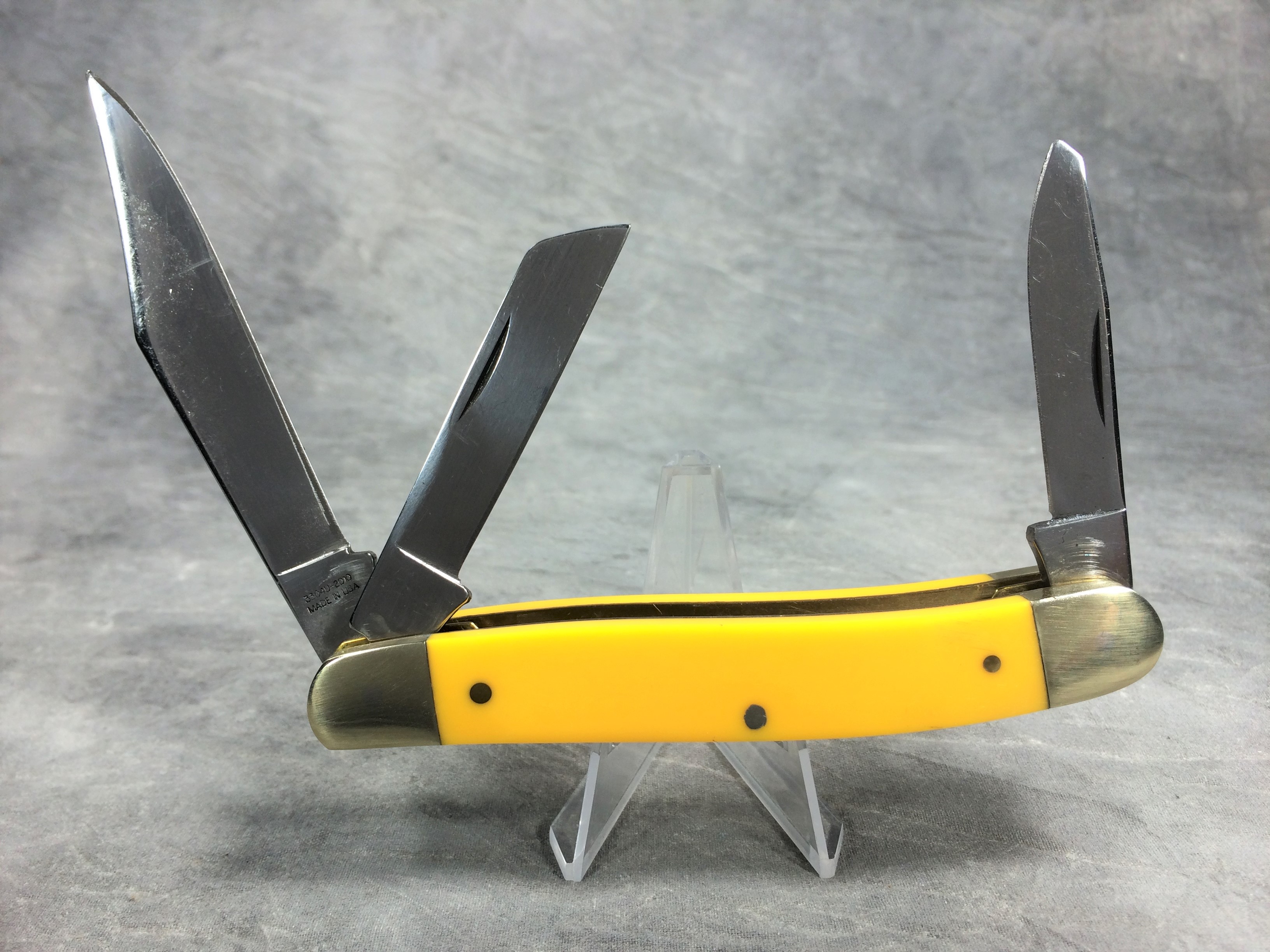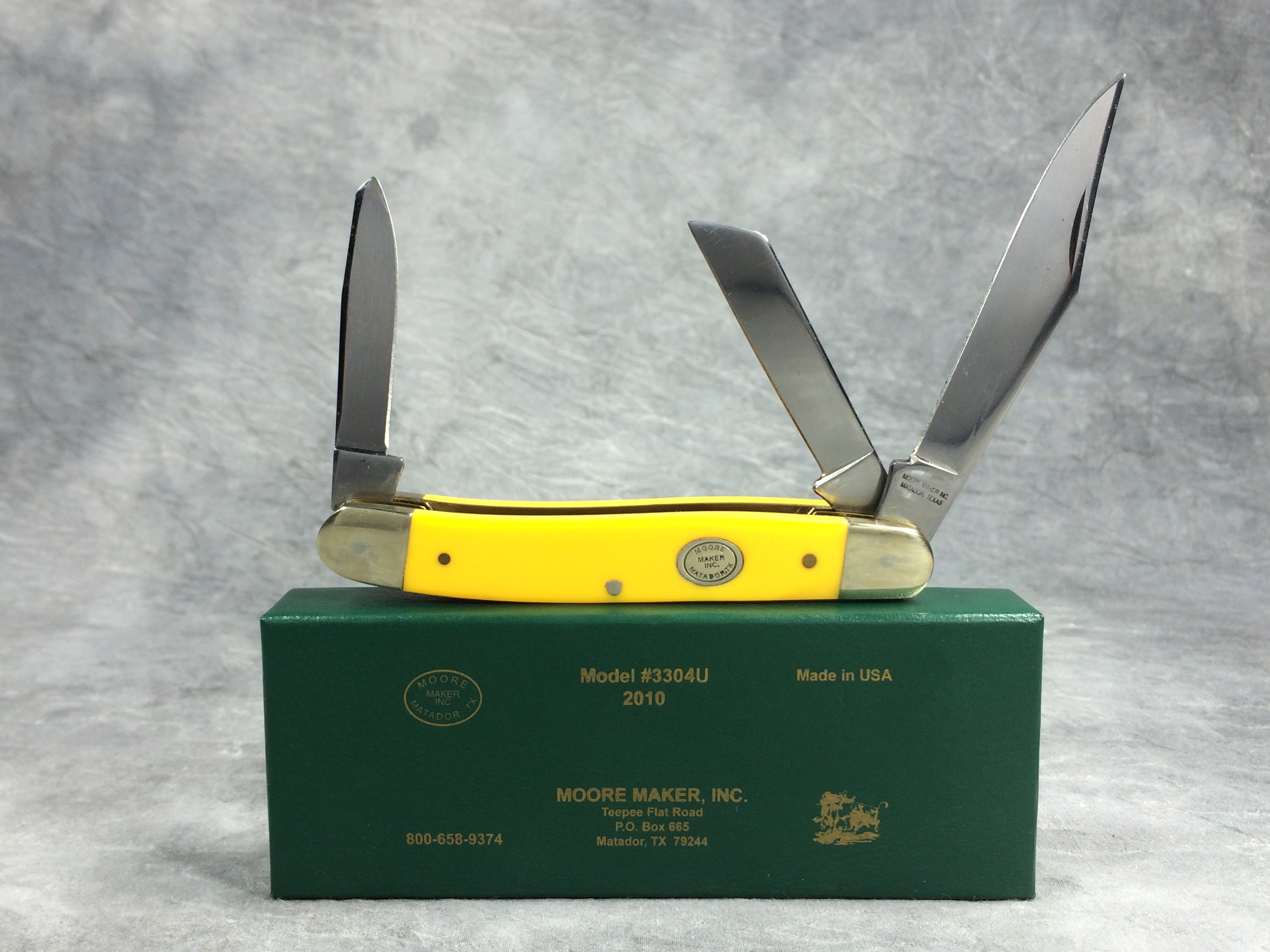 April 24, 2026 - 3-Blade large stockman knife. 4-1/2 inches closed. 8 inches open. Made in USA. "3304 U - 2010 MADE IN USA" and "MOORE MAKER, INC. MATADOR, TEXAS" tang stamps. Stainless steel blades. Smooth yellow composition handle. Oval MOORE MAKER shield. Nickel silver bolsters and brass liner. With original box.