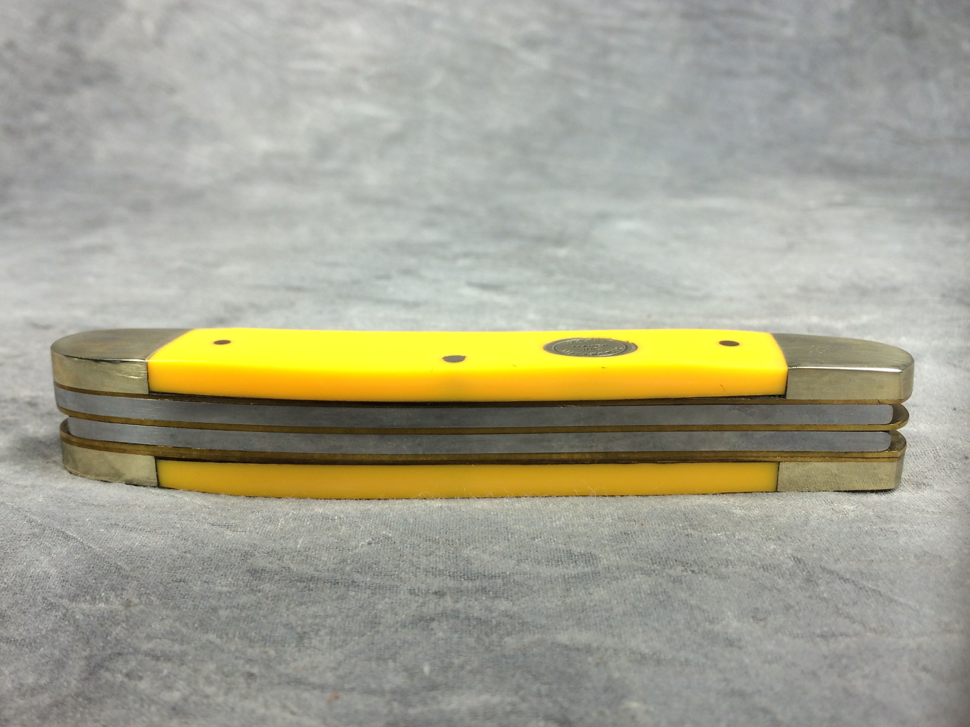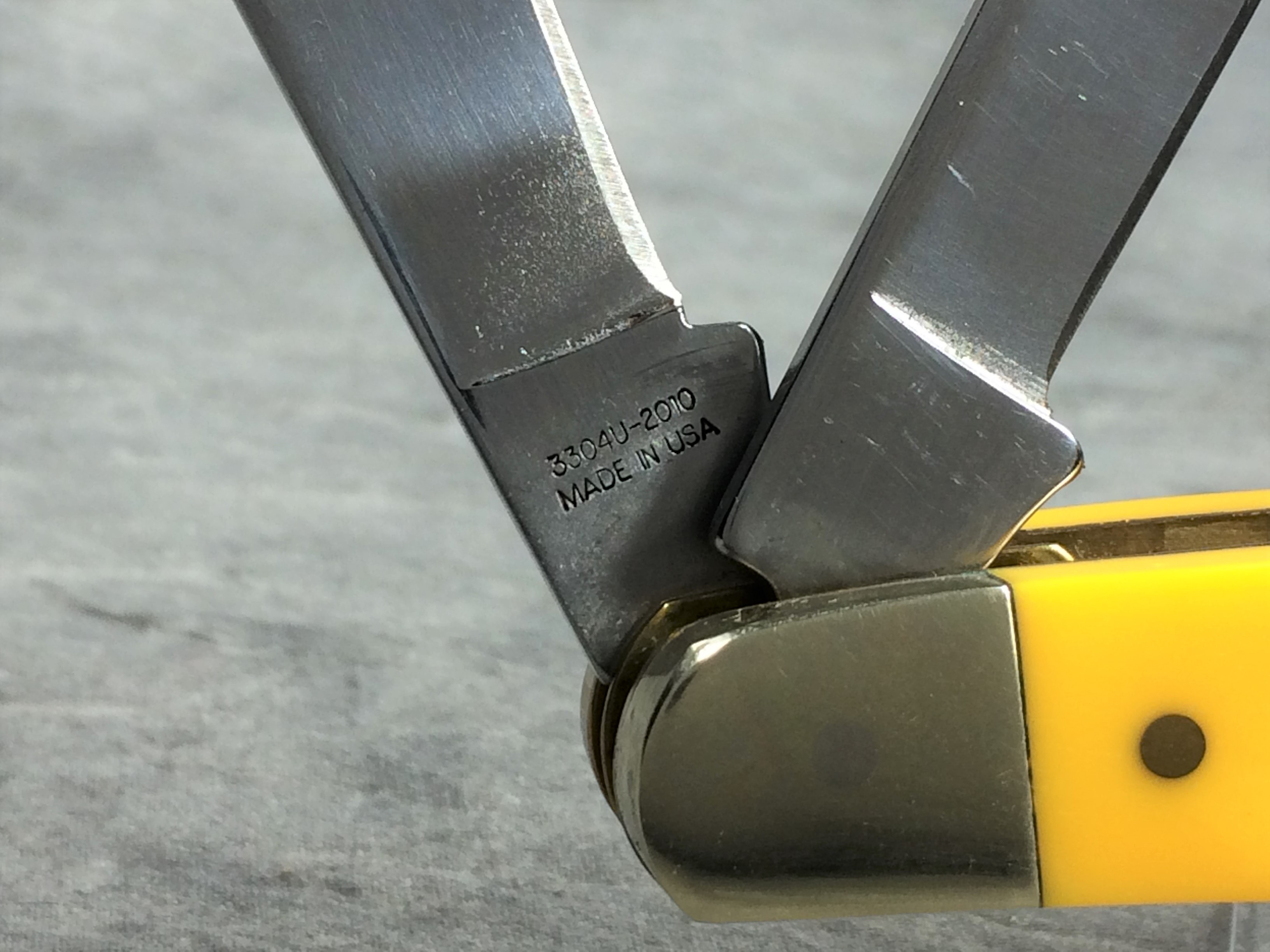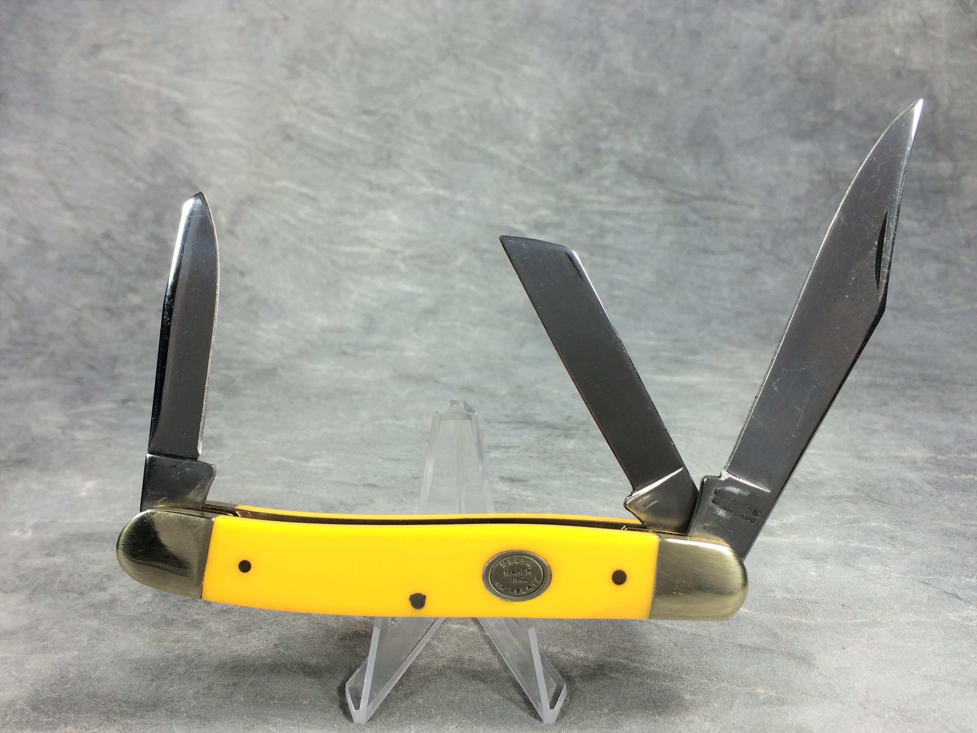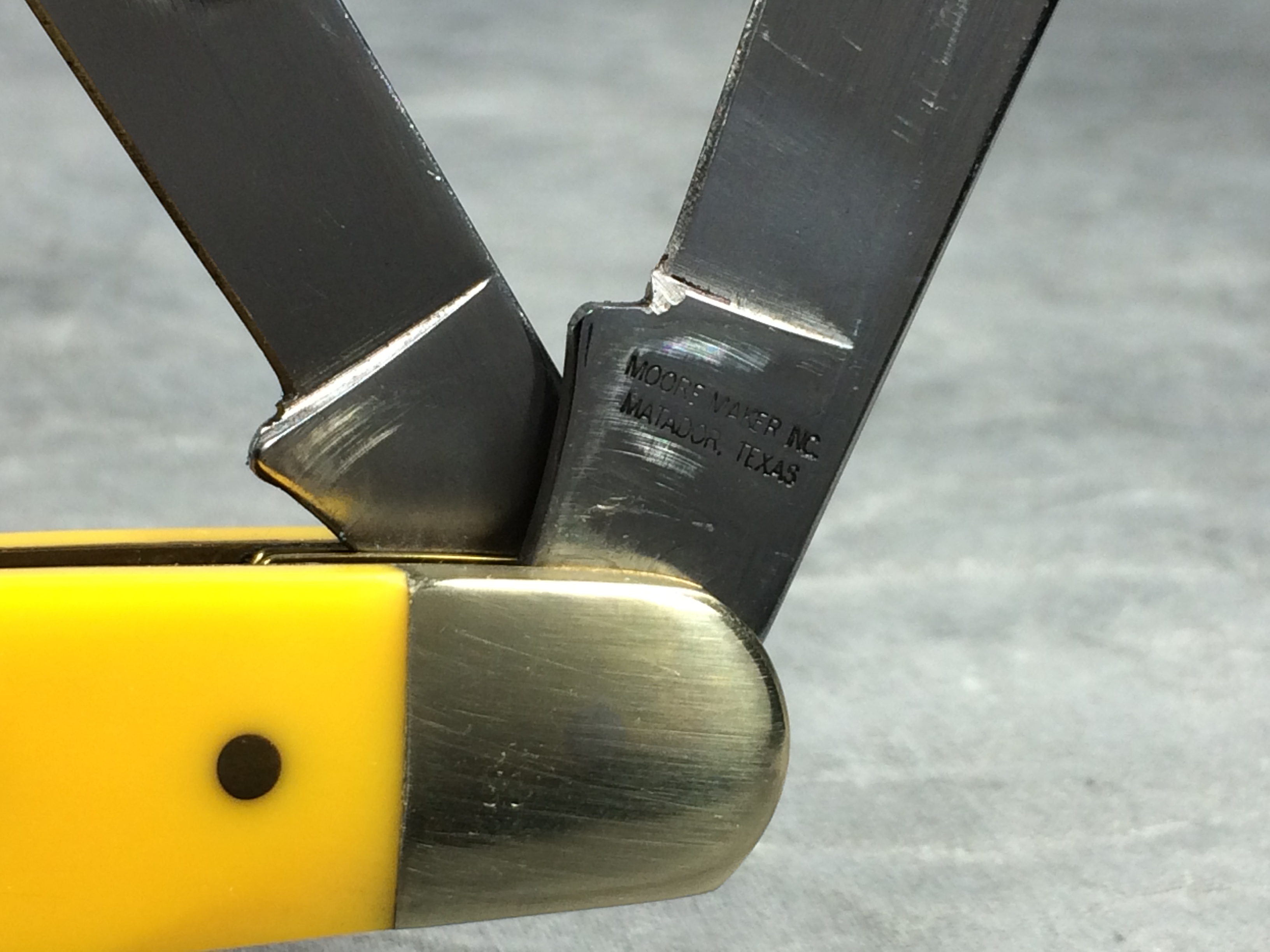 April 24, 2026 - 3-Blade large stockman knife. 4-1/2 inches closed. 8 inches open. Made in USA. "3304 U - 2010 MADE IN USA" and "MOORE MAKER, INC. MATADOR, TEXAS" tang stamps. Stainless steel blades. Smooth yellow composition handle. Oval MOORE MAKER shield. Nickel silver bolsters and brass liner. With original box.