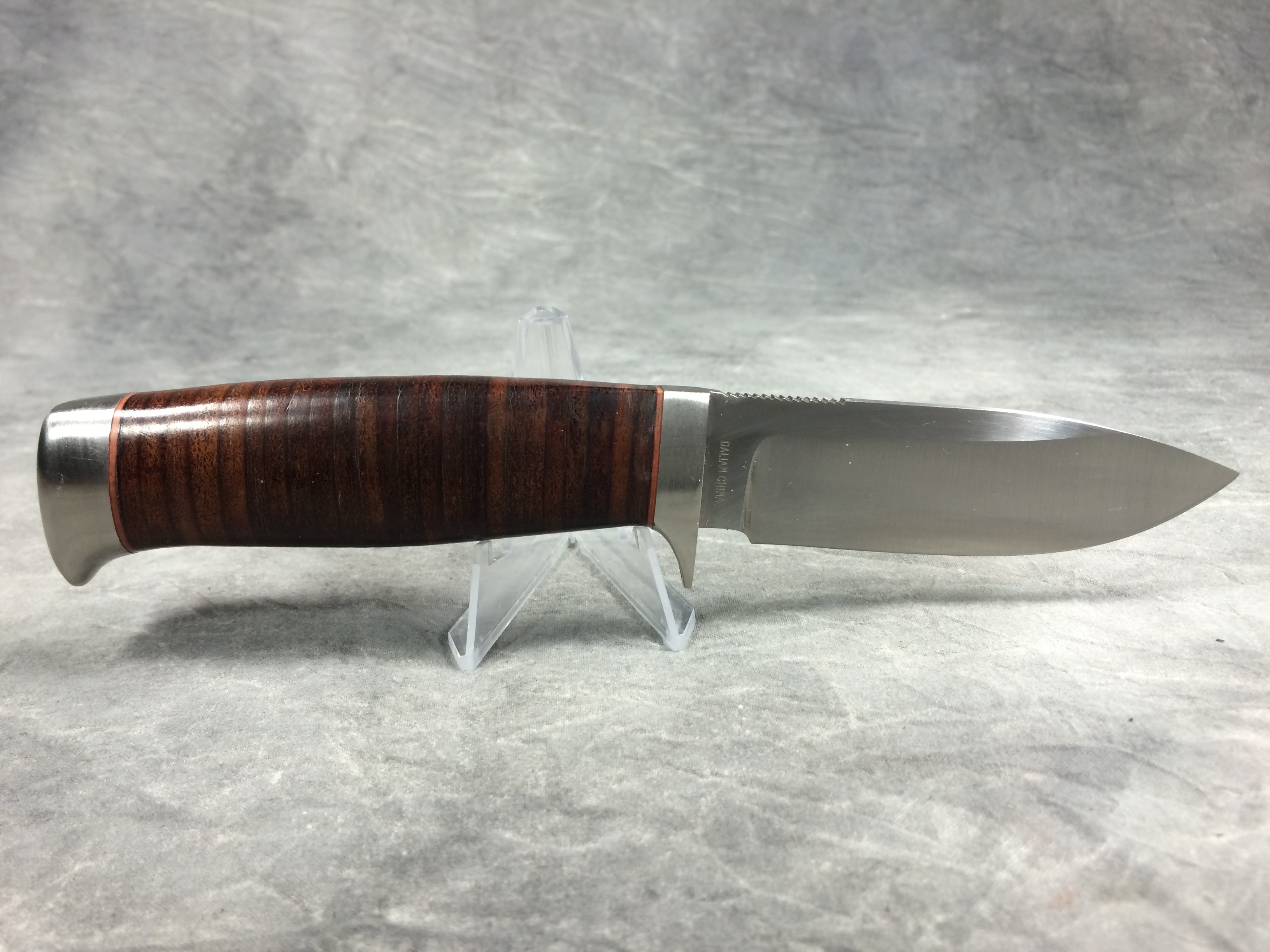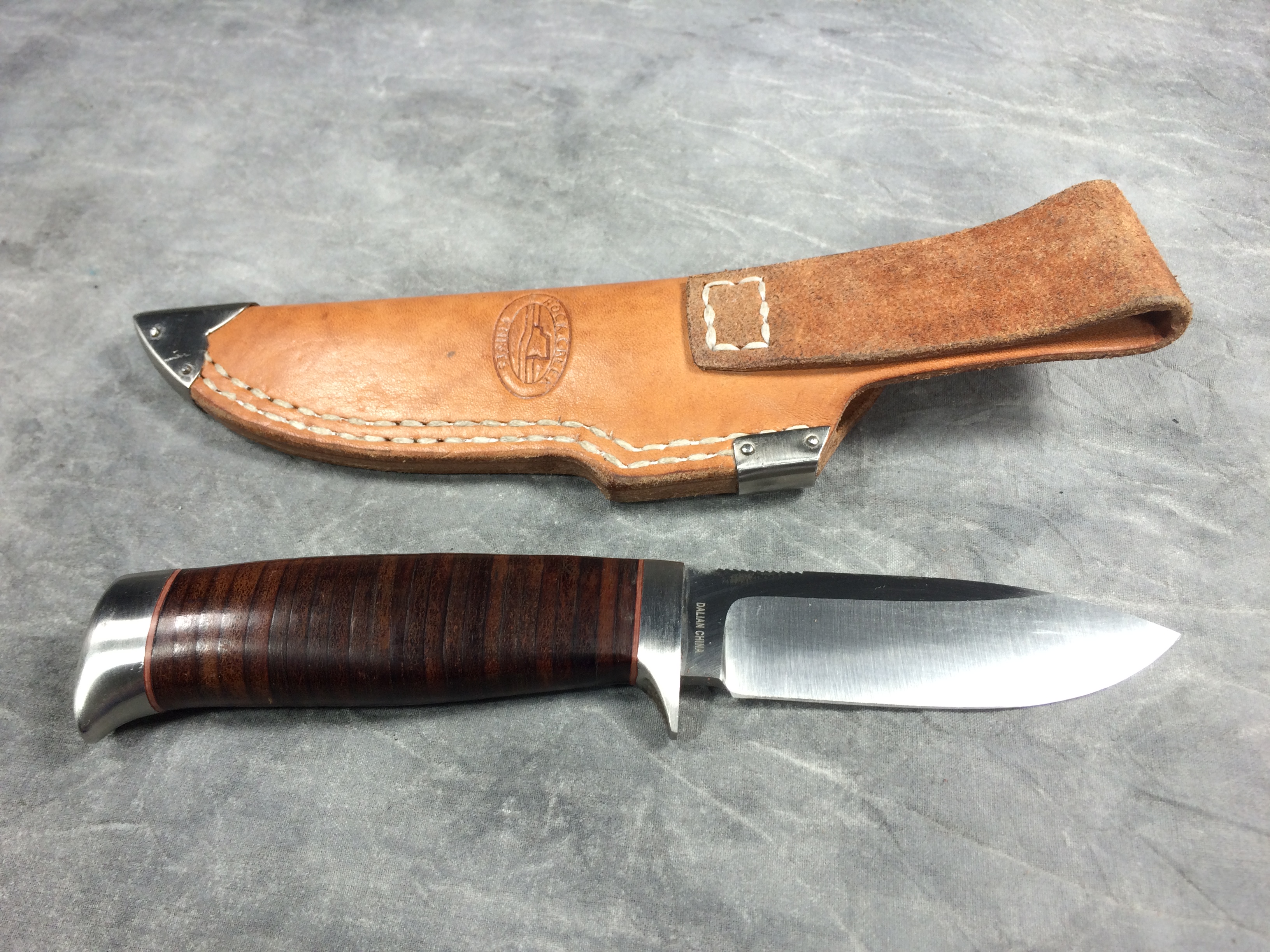 January 08, 2026 - Fixed Blade Knife. 3-5/8 inch blade, 7-7/8 inches overall length. HWS-1K high-alloy steel blade etched with Rock Creek Knives logo.  "HWS-1K" and "DALIAN CHINA" tang stamps. Stacked leather handle. With leather sheath.