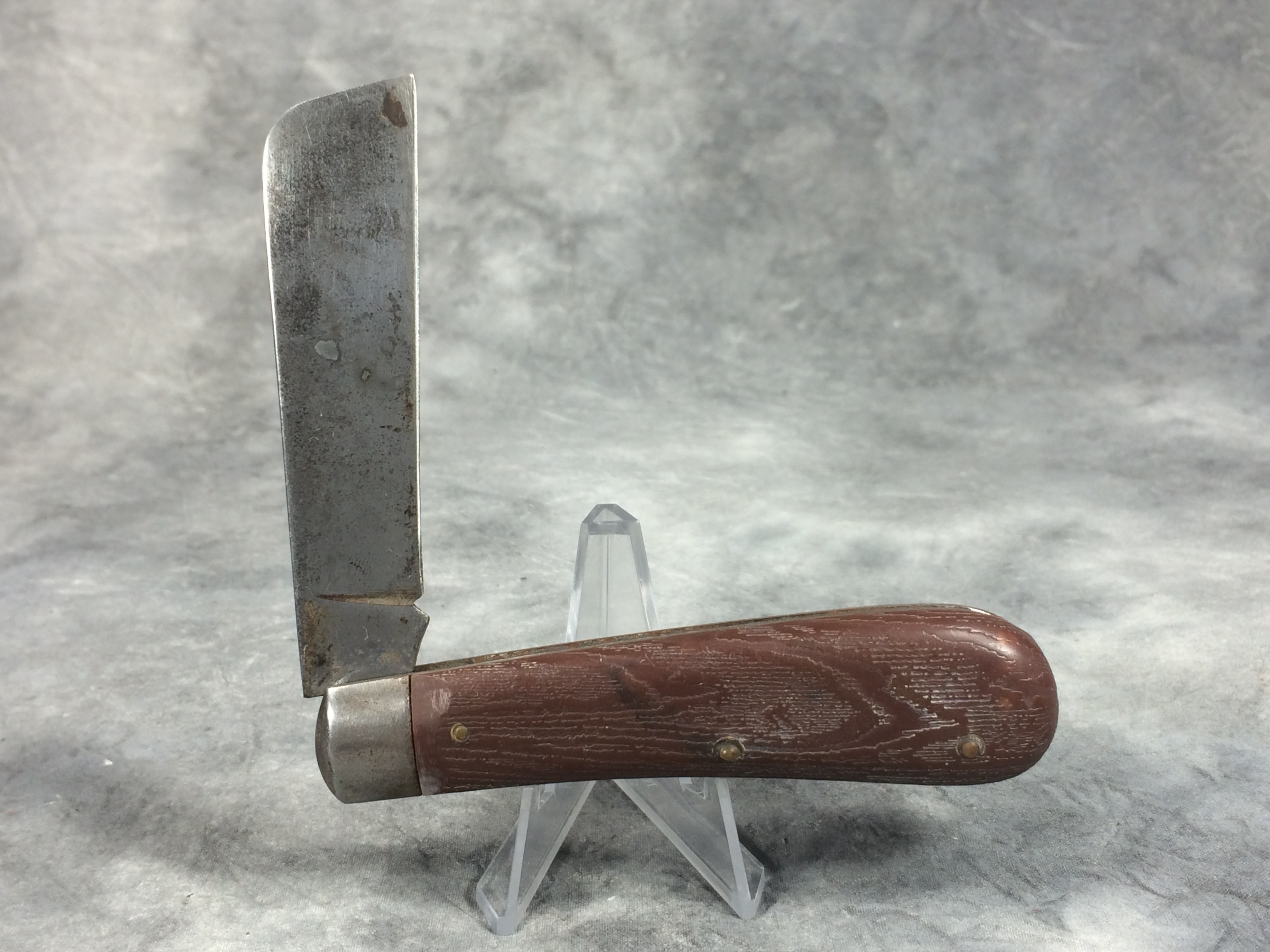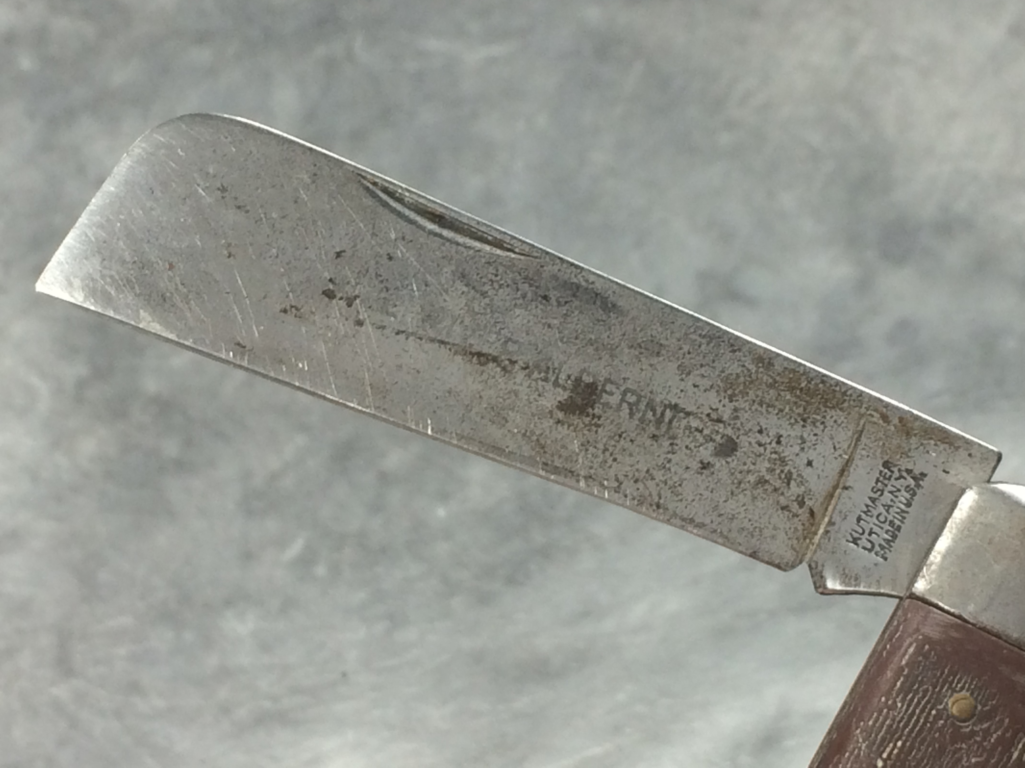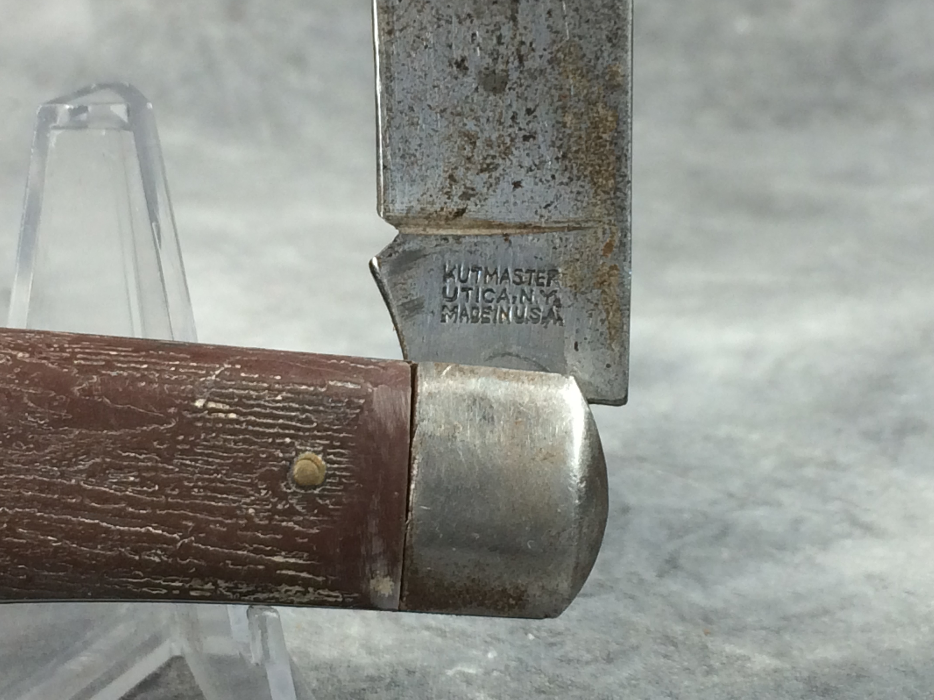 November 03, 2025 - 4-1/4 inches closed. 7-1/2 inches open. Made in USA. "KUTMASTER UTICA, N.Y. MADE IN USA" tang stamp. Blade etched "POWELL RIVER - ALBERNI". Imitation wood handle.