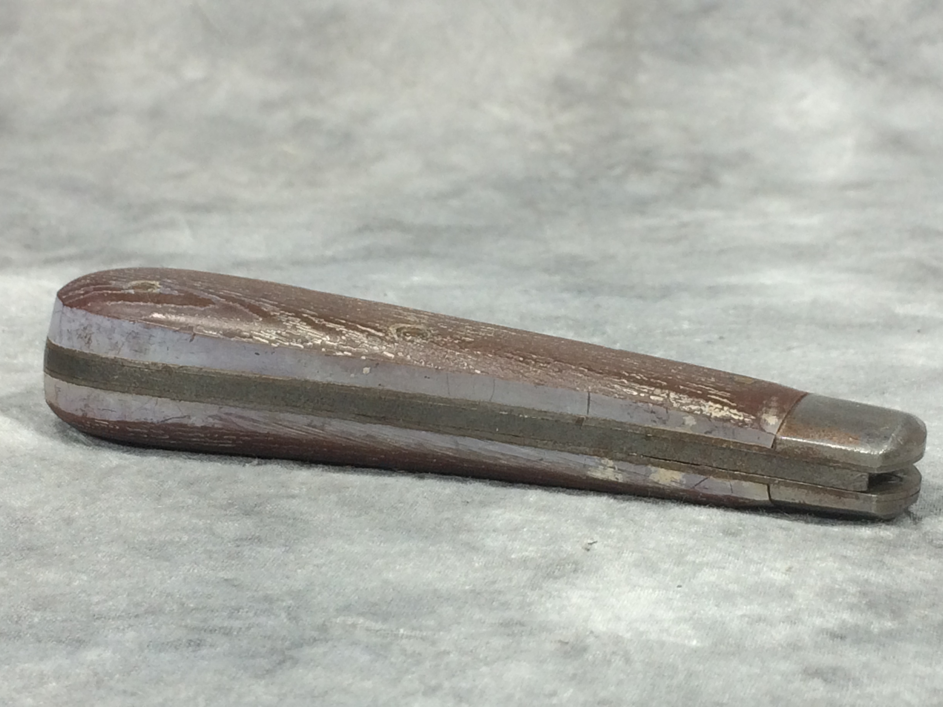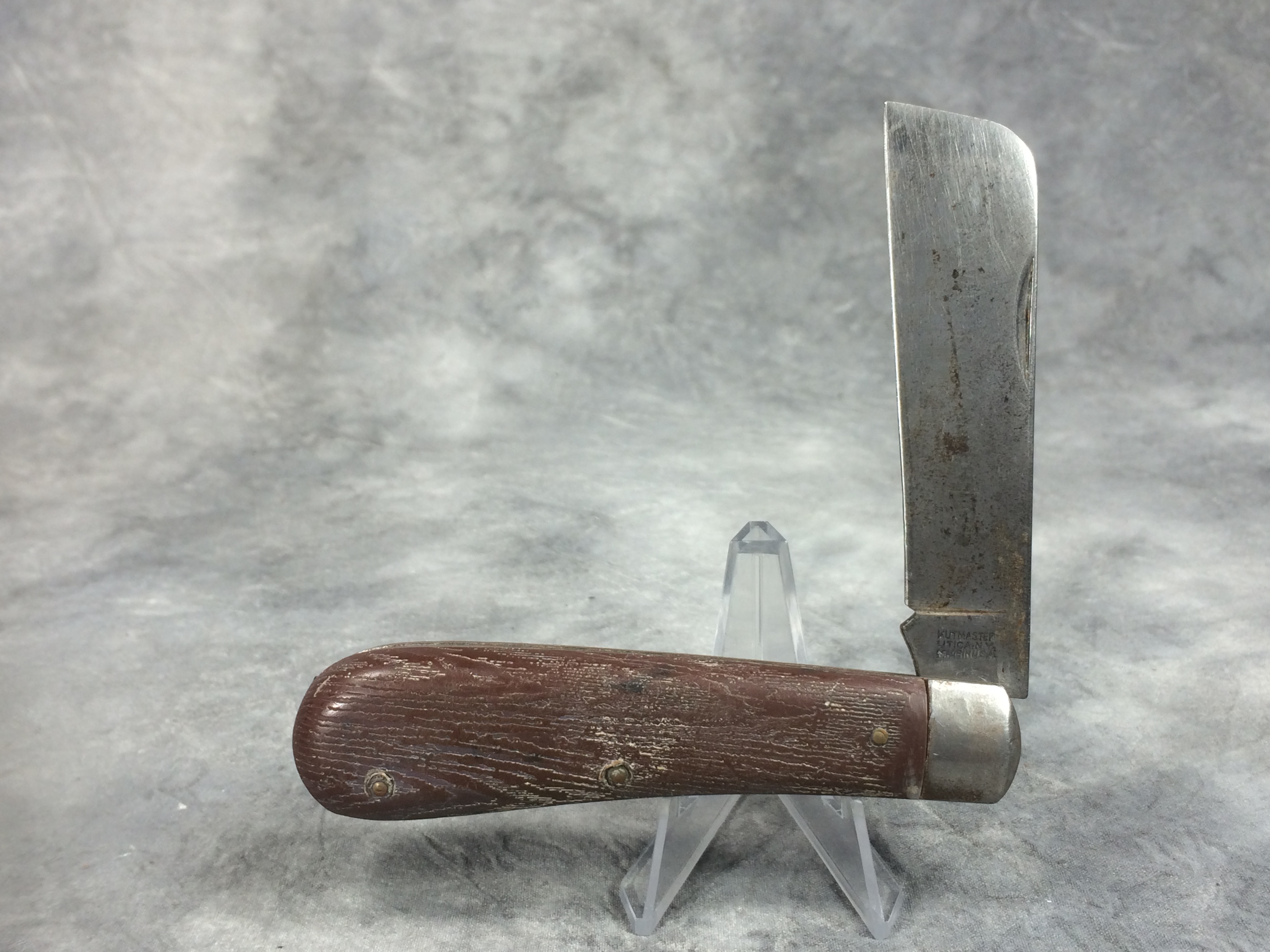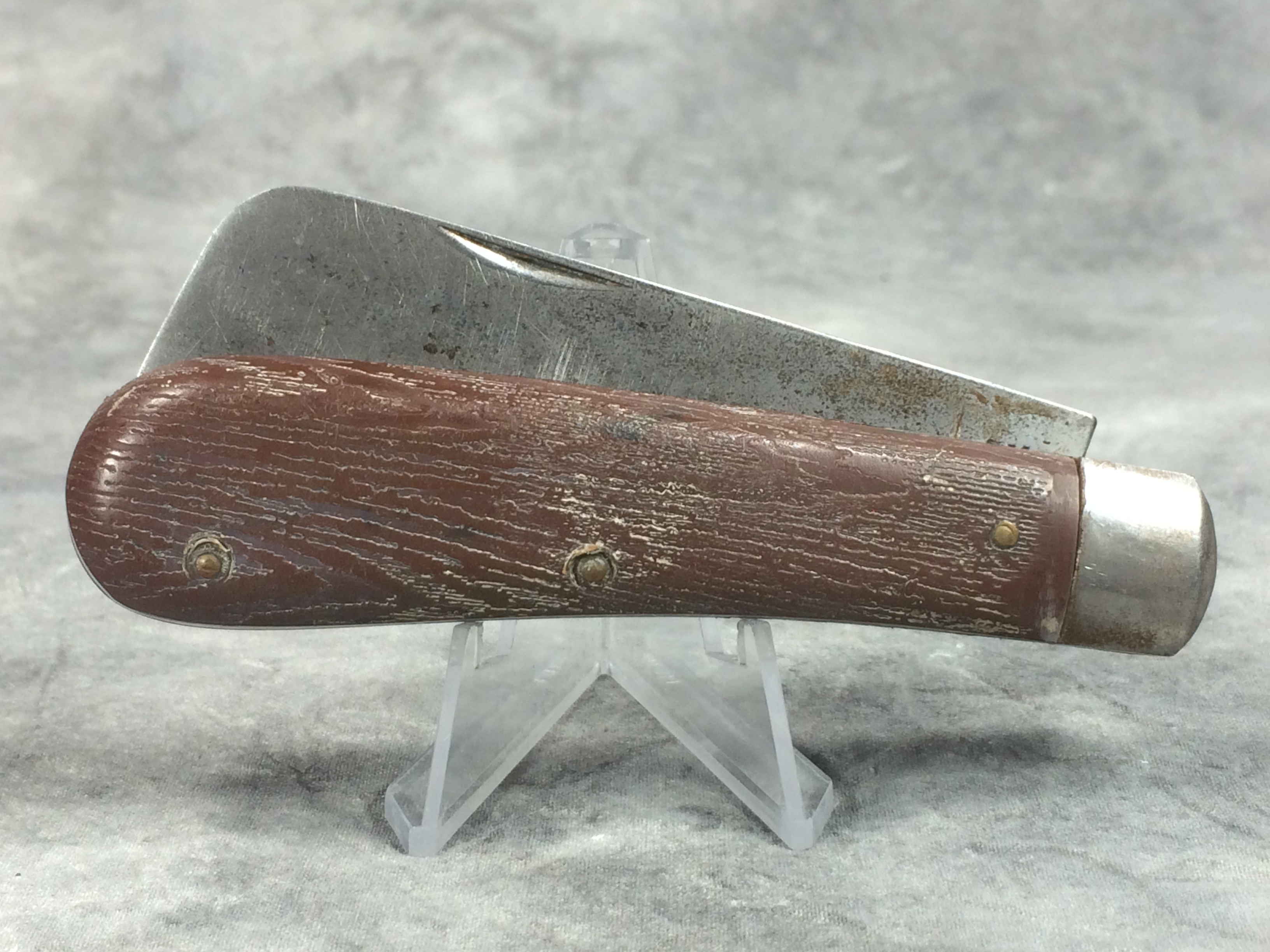 November 03, 2025 - 4-1/4 inches closed. 7-1/2 inches open. Made in USA. "KUTMASTER UTICA, N.Y. MADE IN USA" tang stamp. Blade etched "POWELL RIVER - ALBERNI". Imitation wood handle.