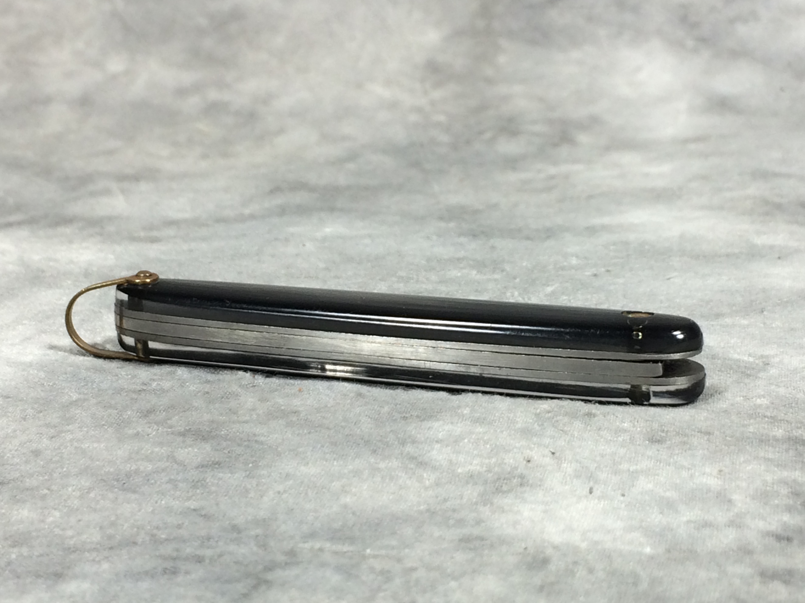 January 08, 2026 - 3-1/4 inches closed. 5-5/8 inches open. "STAINLESS BRASIL" tang stamp. Stainless steel blade and liner. Black composition handle. Brass ring in left end.