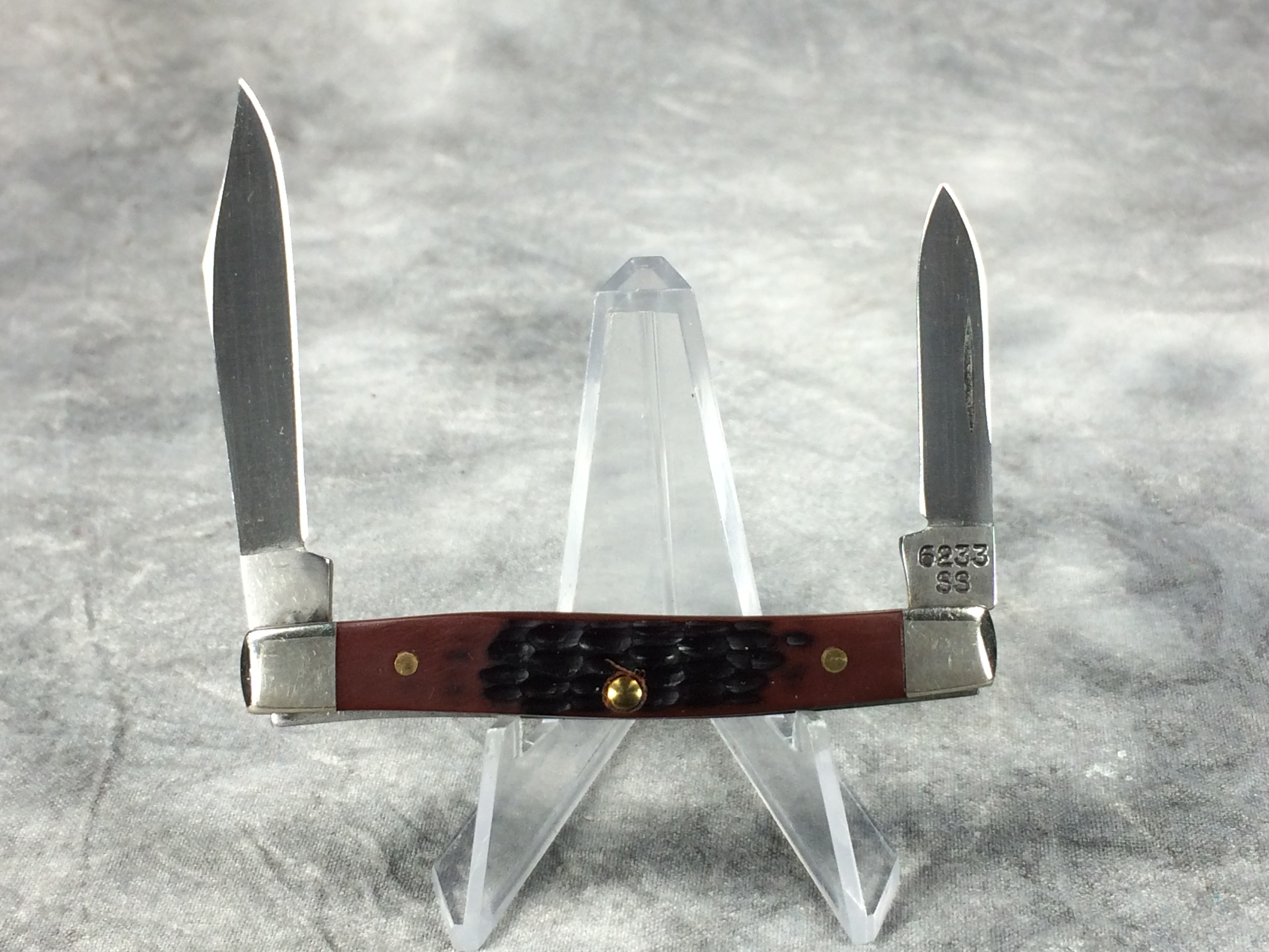 March 06, 2026 - 2-5/8 inches closed. 4-5/8 inches open. Made in USA. "CASE XX USA ** " (2 dot with lightning bolt S) and "6233 SS" tang stamps. Double Oval 'Open C' CASE shield. Stainless Steel blades. Jigged Delrin handle. Nickel Silver bolsters. Brass liner.