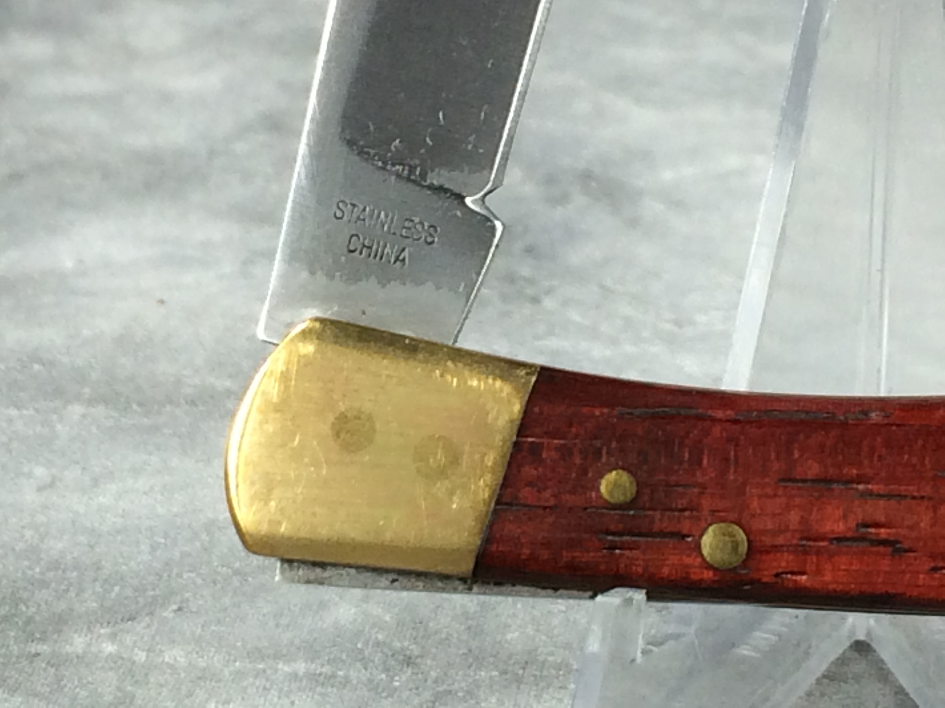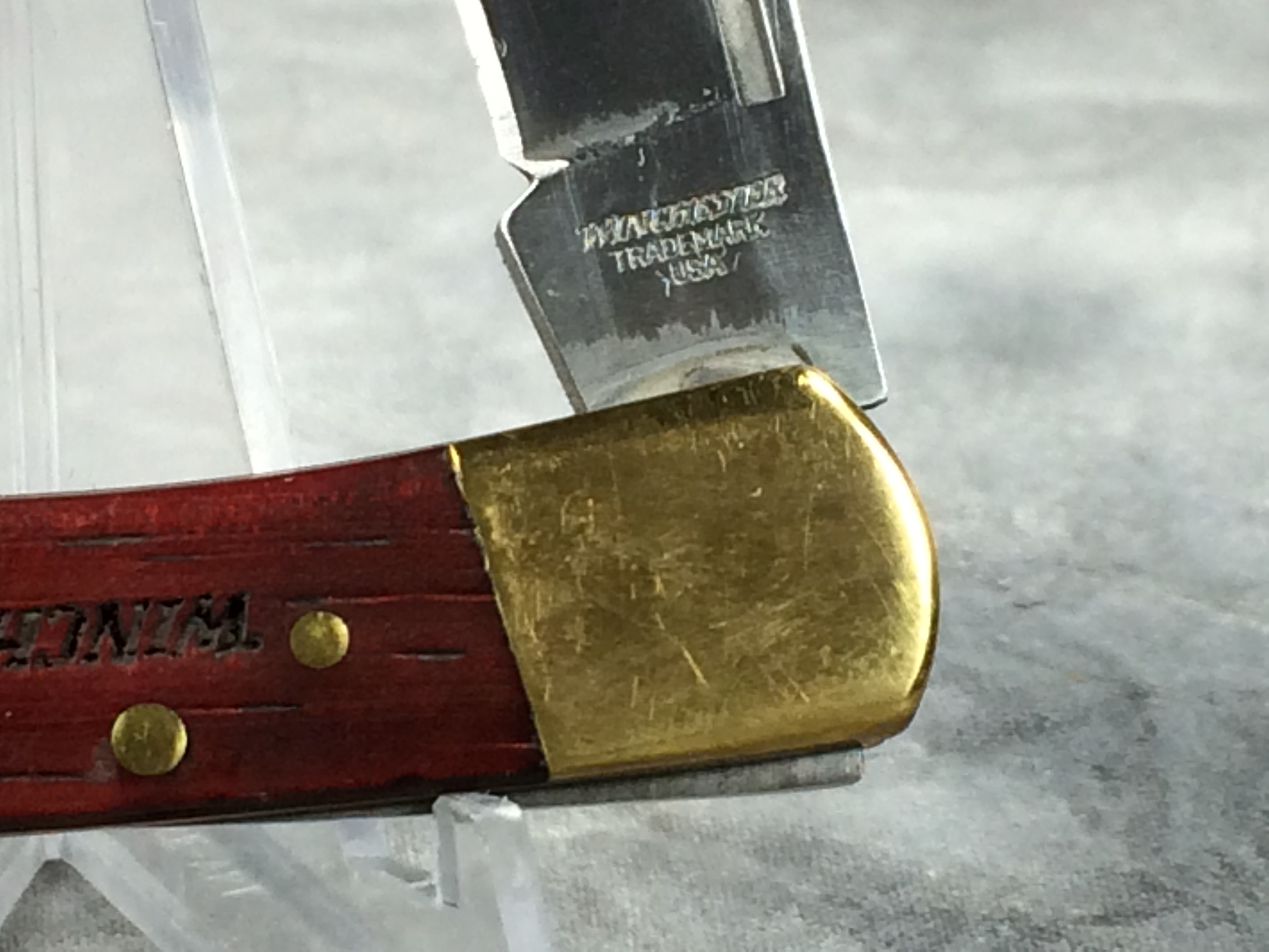 December 22, 2025 - 3 inches closed. 5-1/8 inches open. "WINCHESTER TRADEMARK USA" and "STAINLESS CHINA" tang stamps. Stainless Steel blade etched "WINCHESTER TRADEMARK". Wood handle etched "WINCHESTER". Brass bolsters. Brass liner.
