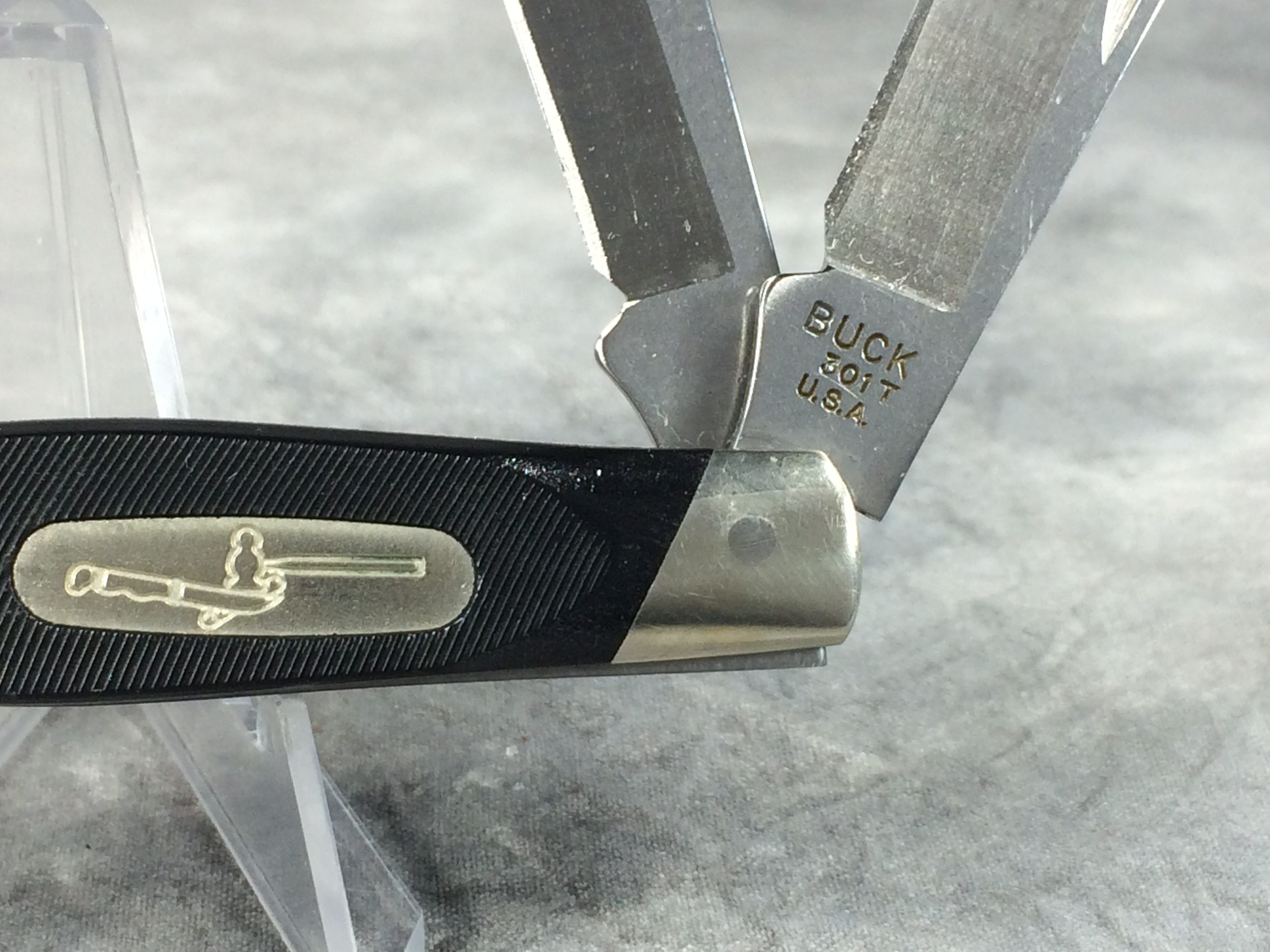 December 22, 2025 - 4 inches closed. 6-7/8 inches open. Made in USA. "BUCK 301 T U.S.A." tang stamp. Hammer & Blade shield. Stainless Steel blades. Black injection-molded handle. Nickel silver bolsters and liner. With original box and paperwork.