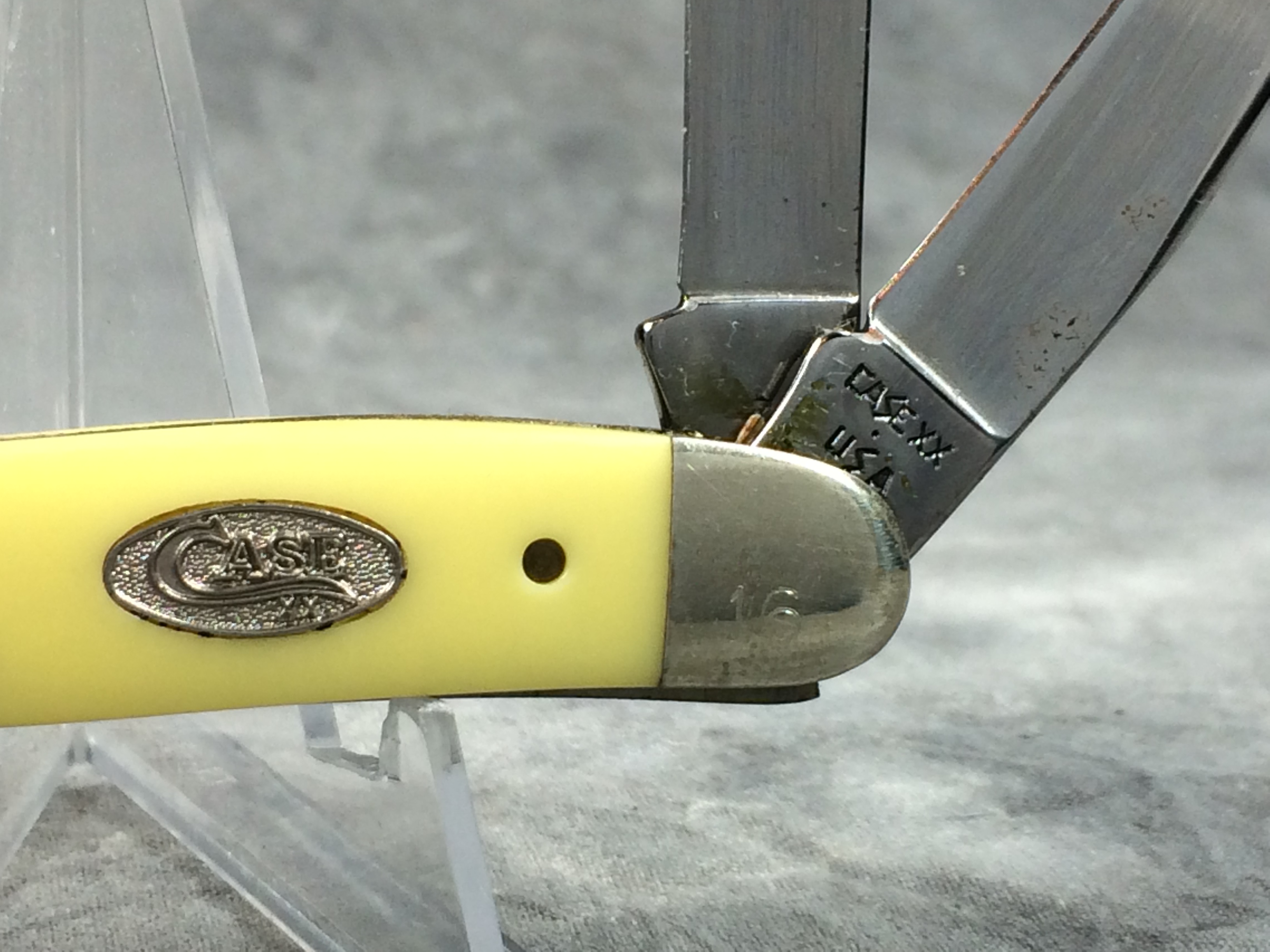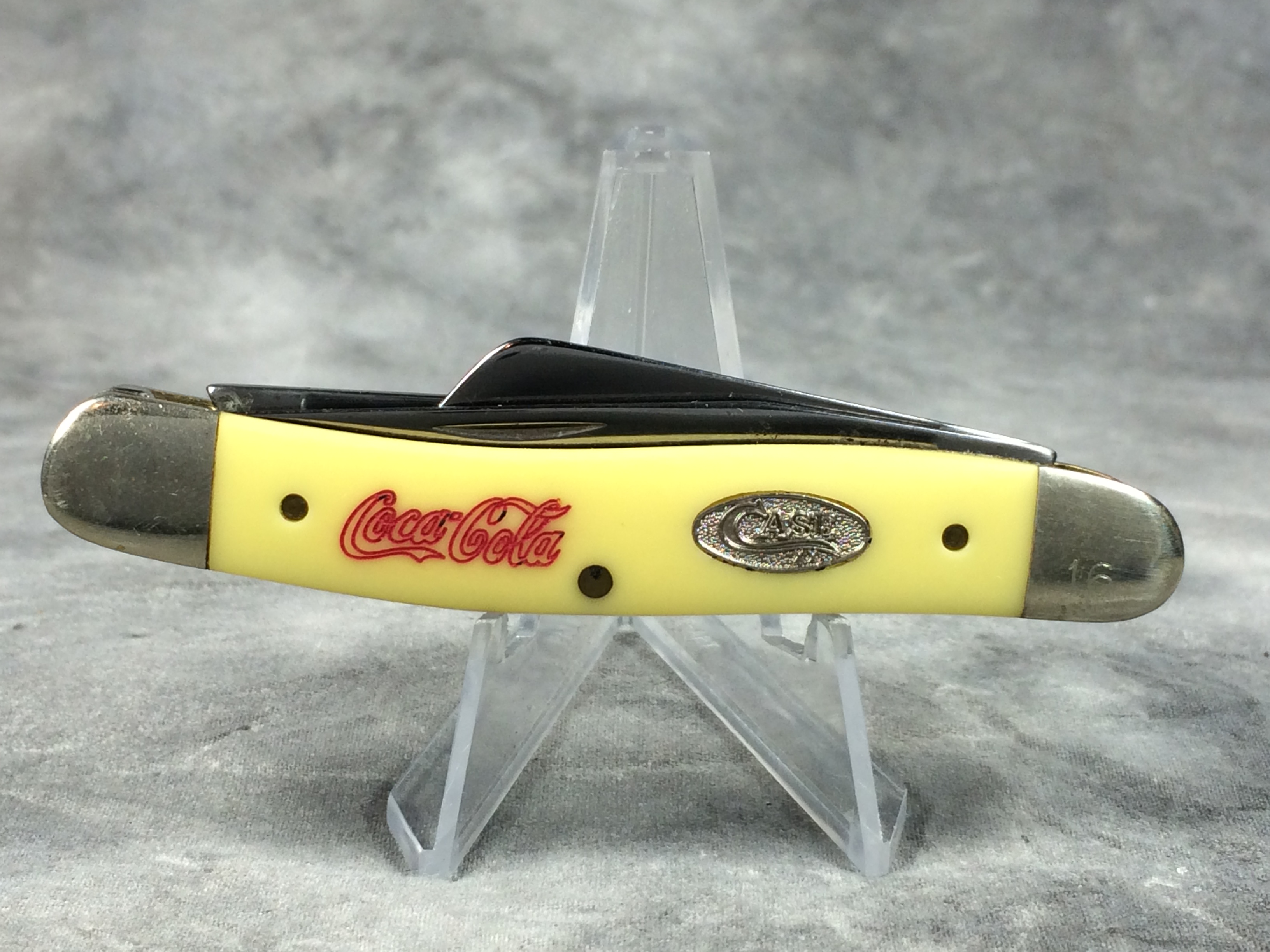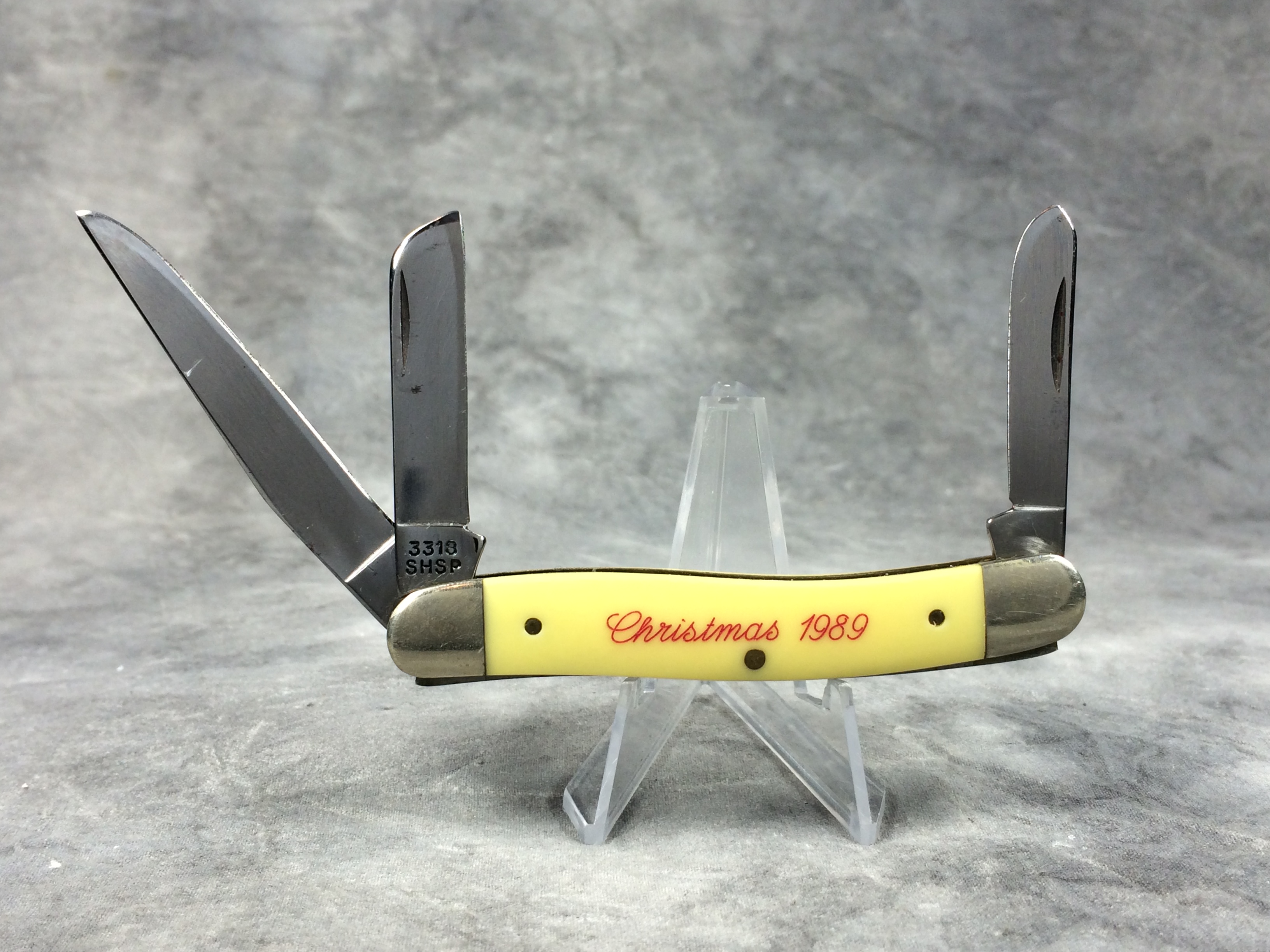 March 09, 2026 - 3-5/8 inches closed. 6-1/8 inches open. Made in USA. "CASE XX  *  USA" and "3318 SHSP" tang stamps. Long C "CASE XX" shield. Mirror-Finish steel blades. Yellow composition handle with "Coca Cola" logo on front and "Christmas 1989" on back. Nickel Silver bolsters. Front right bolster etched with serial. Brass liner.