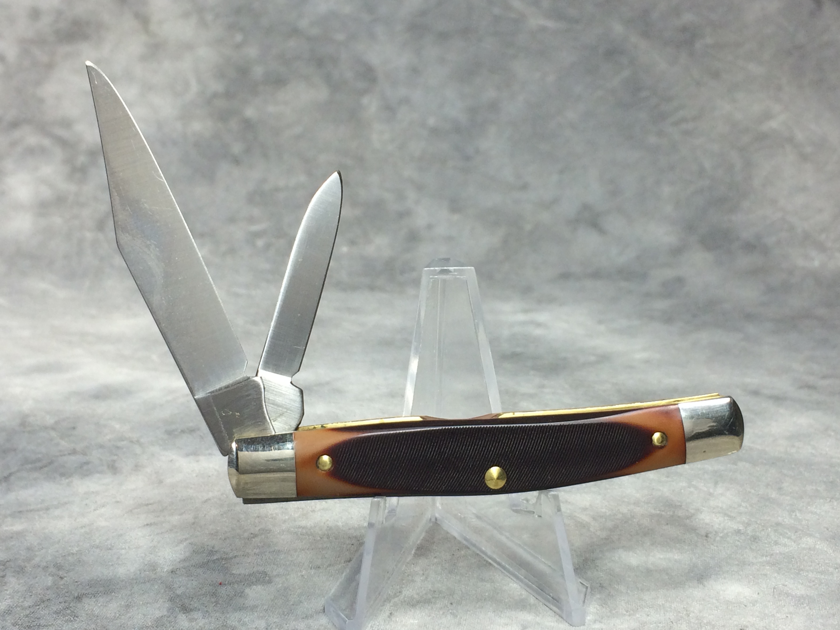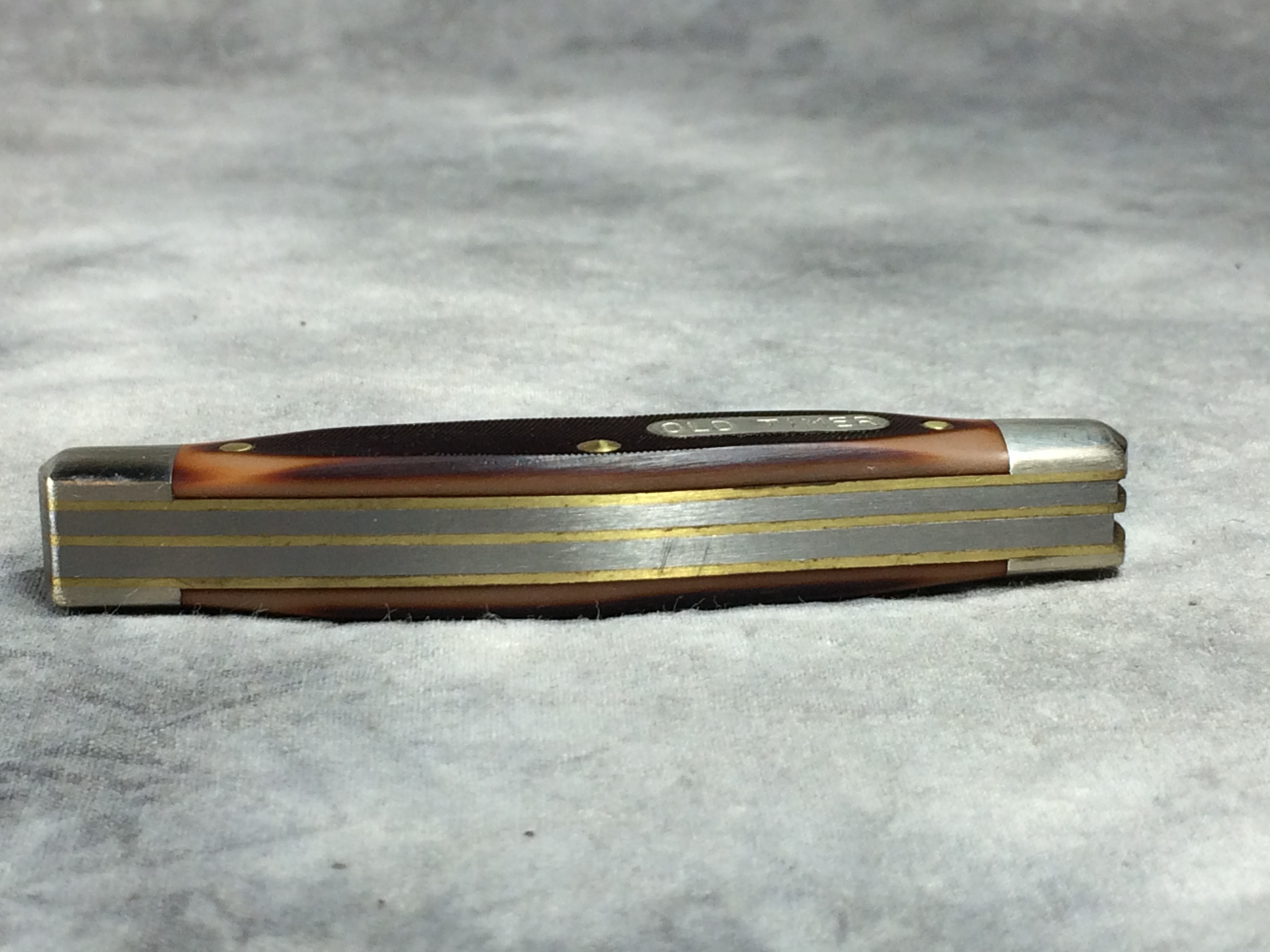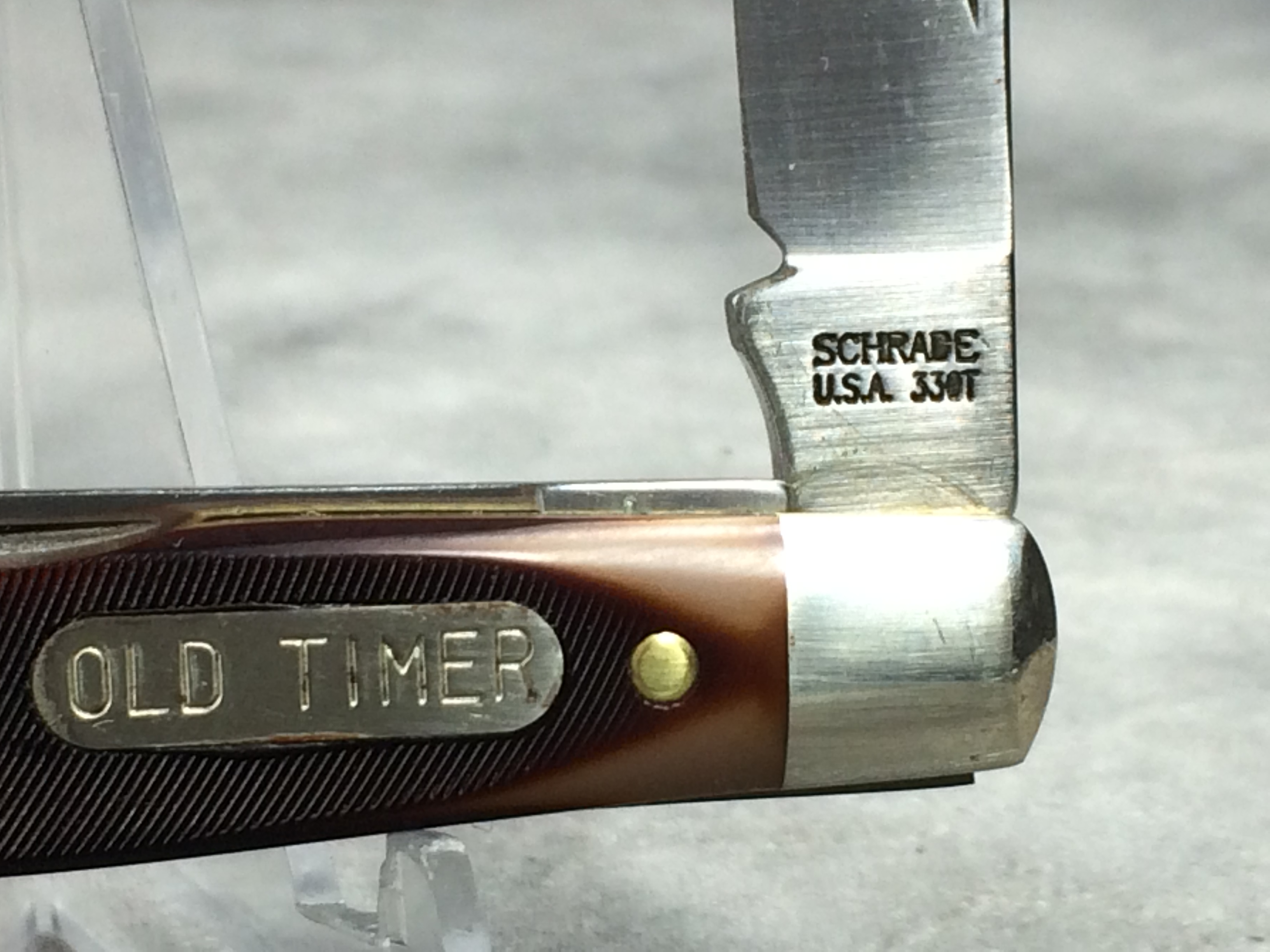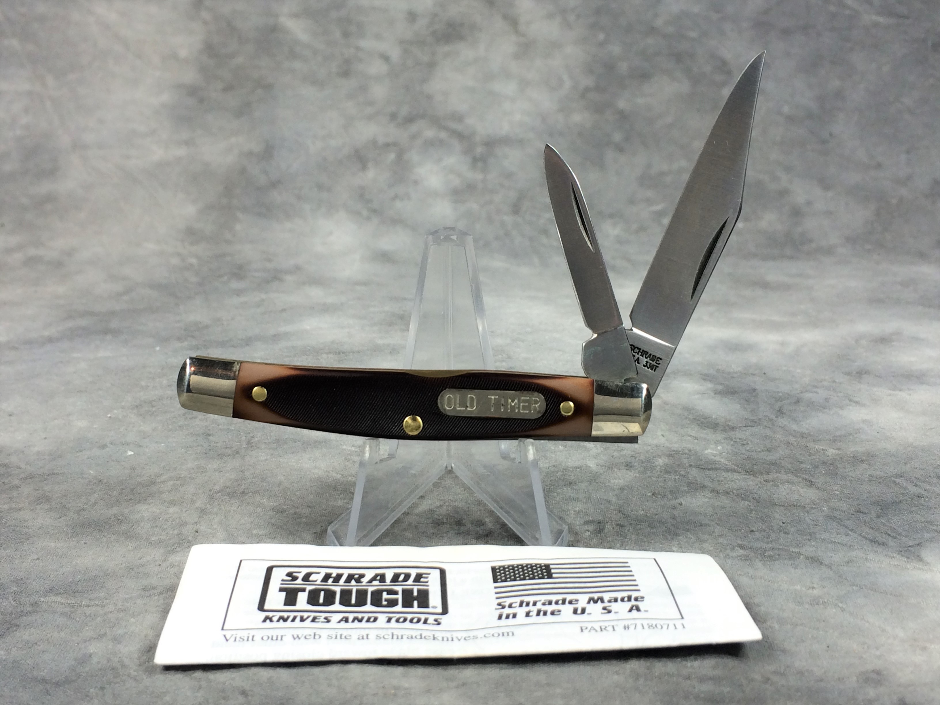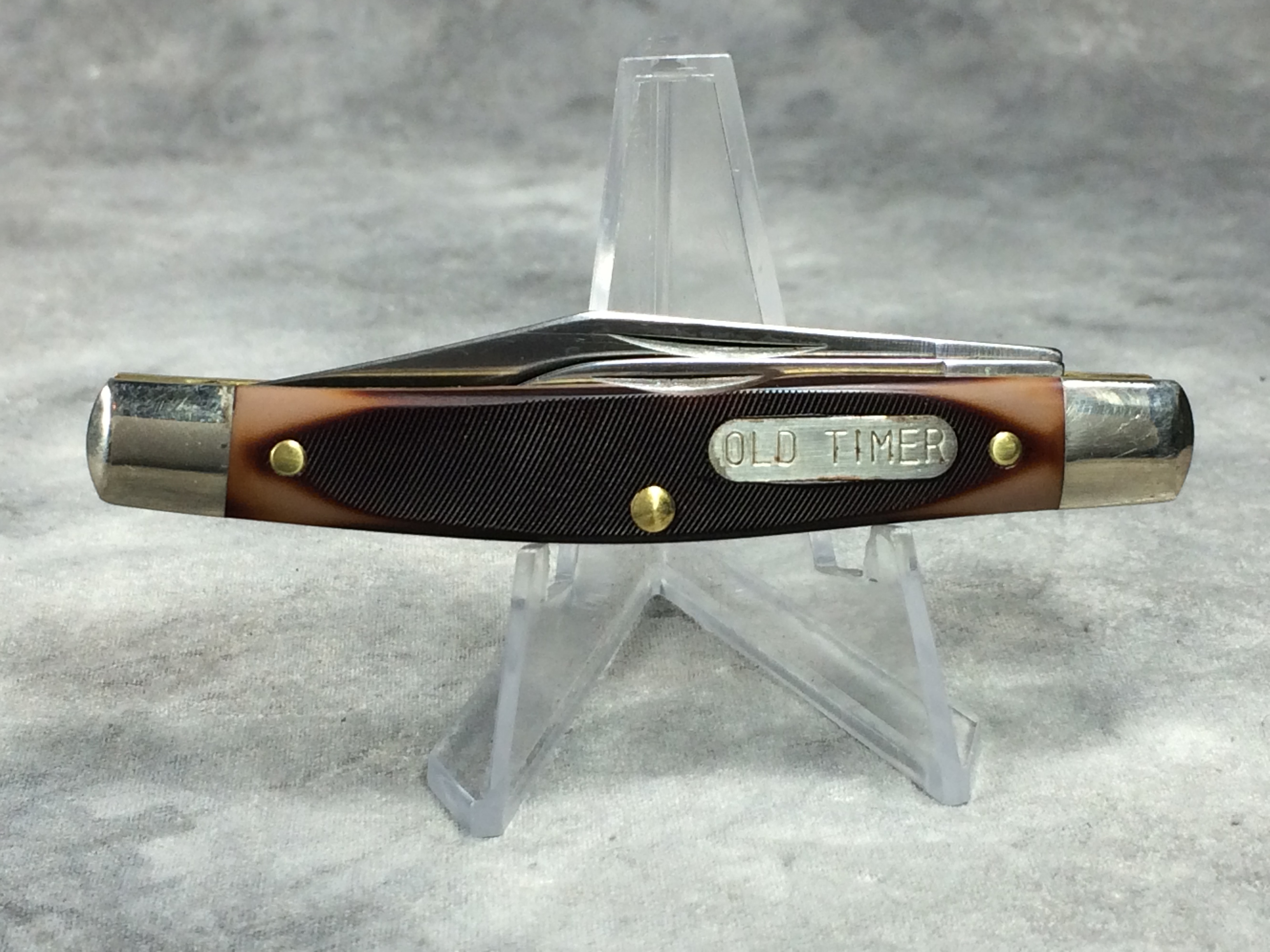 March 06, 2026 - 2-Blade Jack Knife. 3-1/4 inches closed. 5-3/4 inches open. Made in USA. "SCHRADE U.S.A. 33OT" tang stamp. "OLD TIMER" shield. Sawcut Delrin handle. Nickel Silver bolsters. Brass liner.