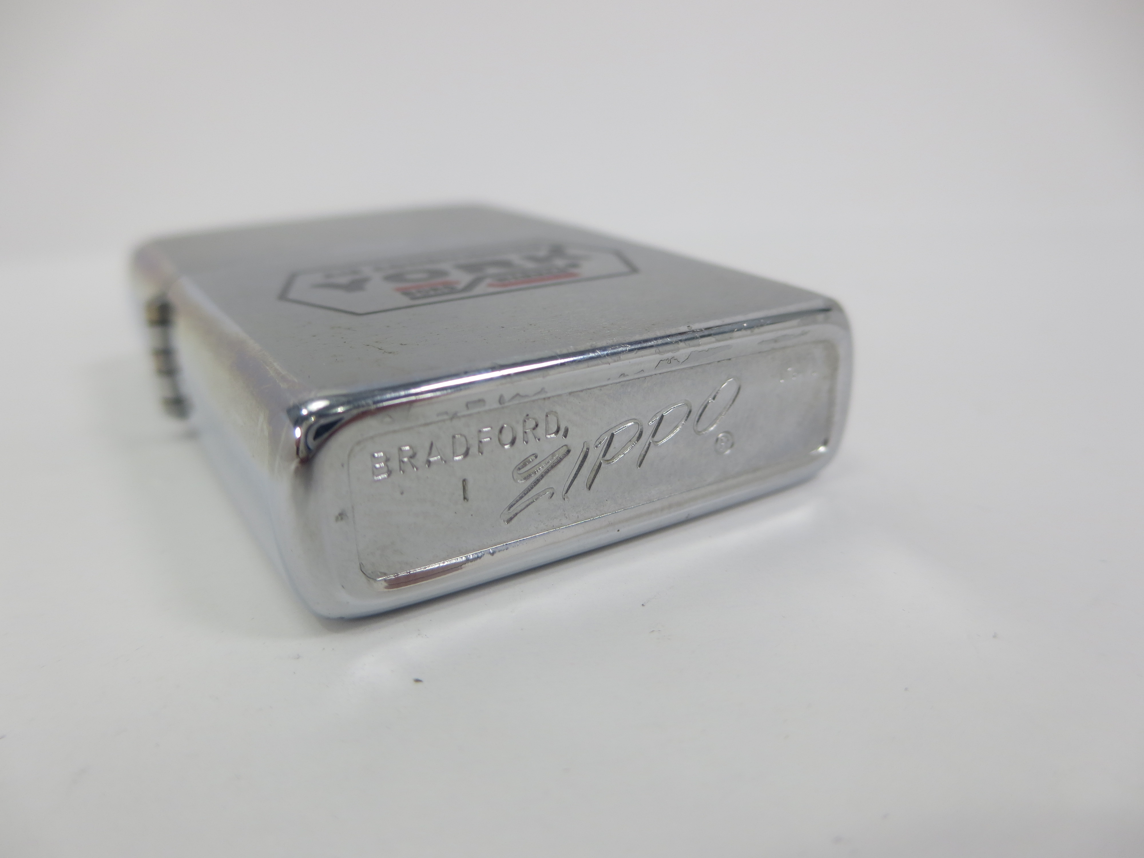 April 03, 2026 - ZIPPO York International Advertising Lighter circa 1973. Brushed Chrome finish over solid Brass. Standard size 1-7/16 inches wide by 2-1/4 inches high. Bottom of lighter reads: | Zippo  Bradford, PA. Includes original insert.