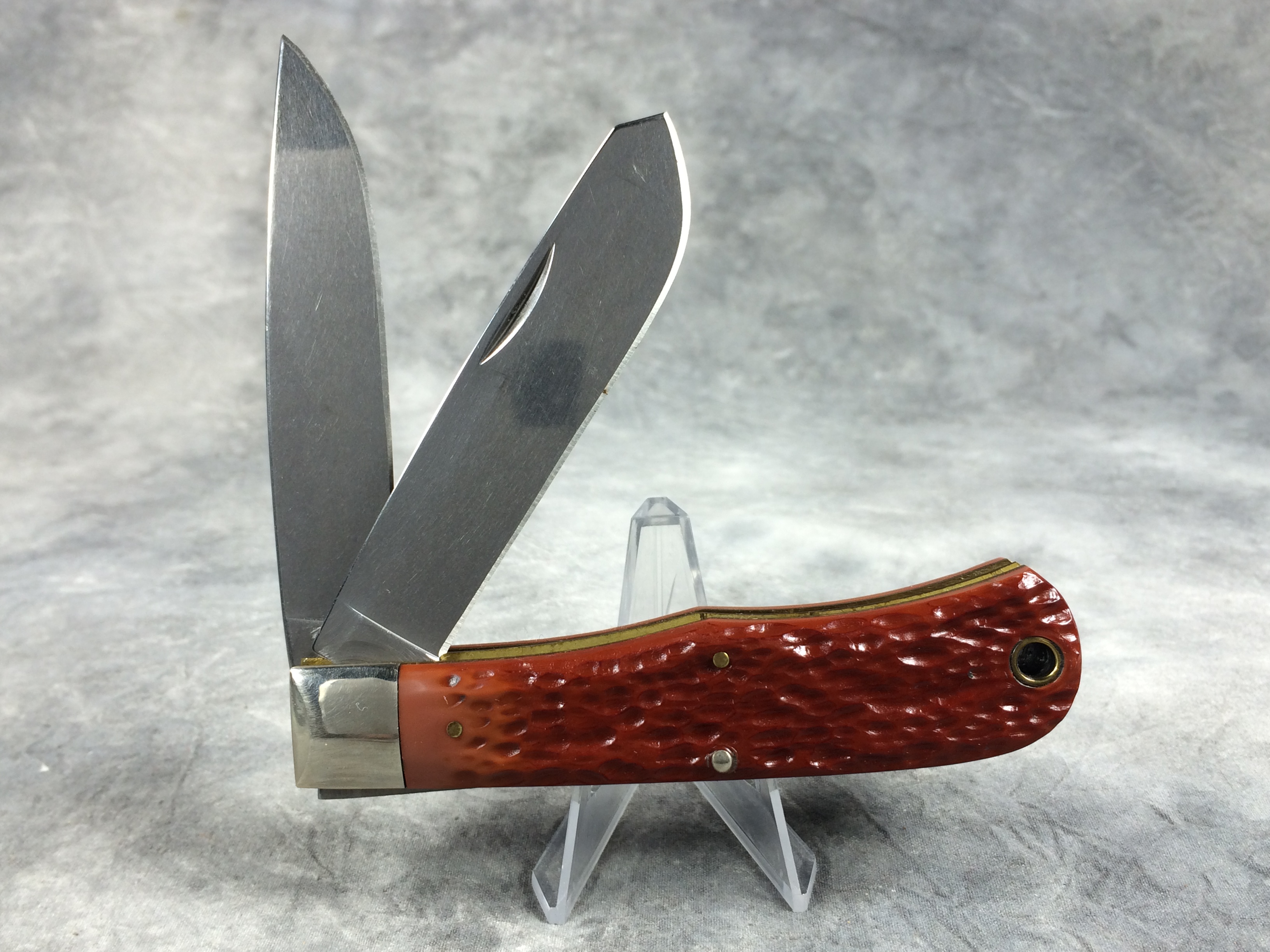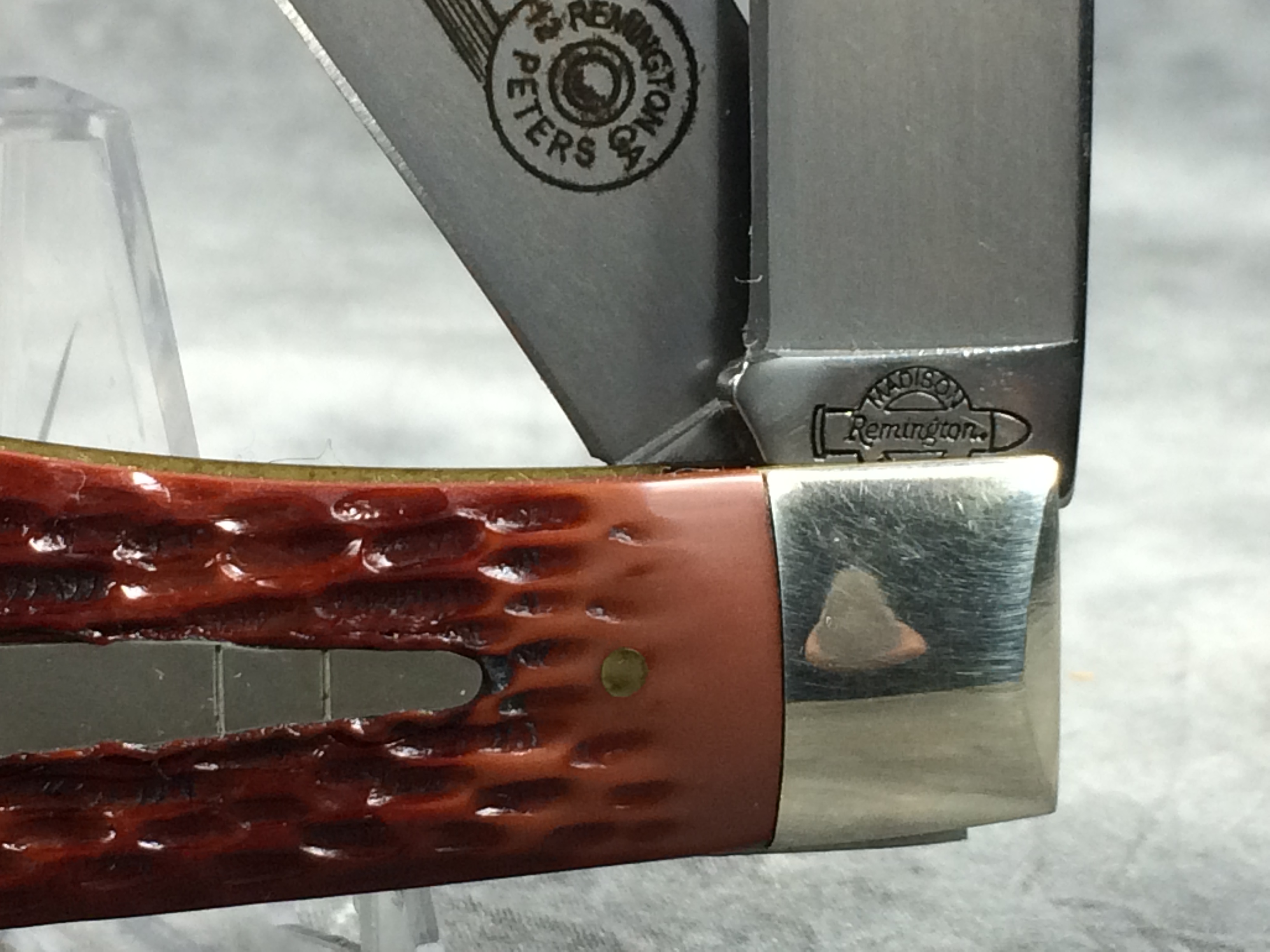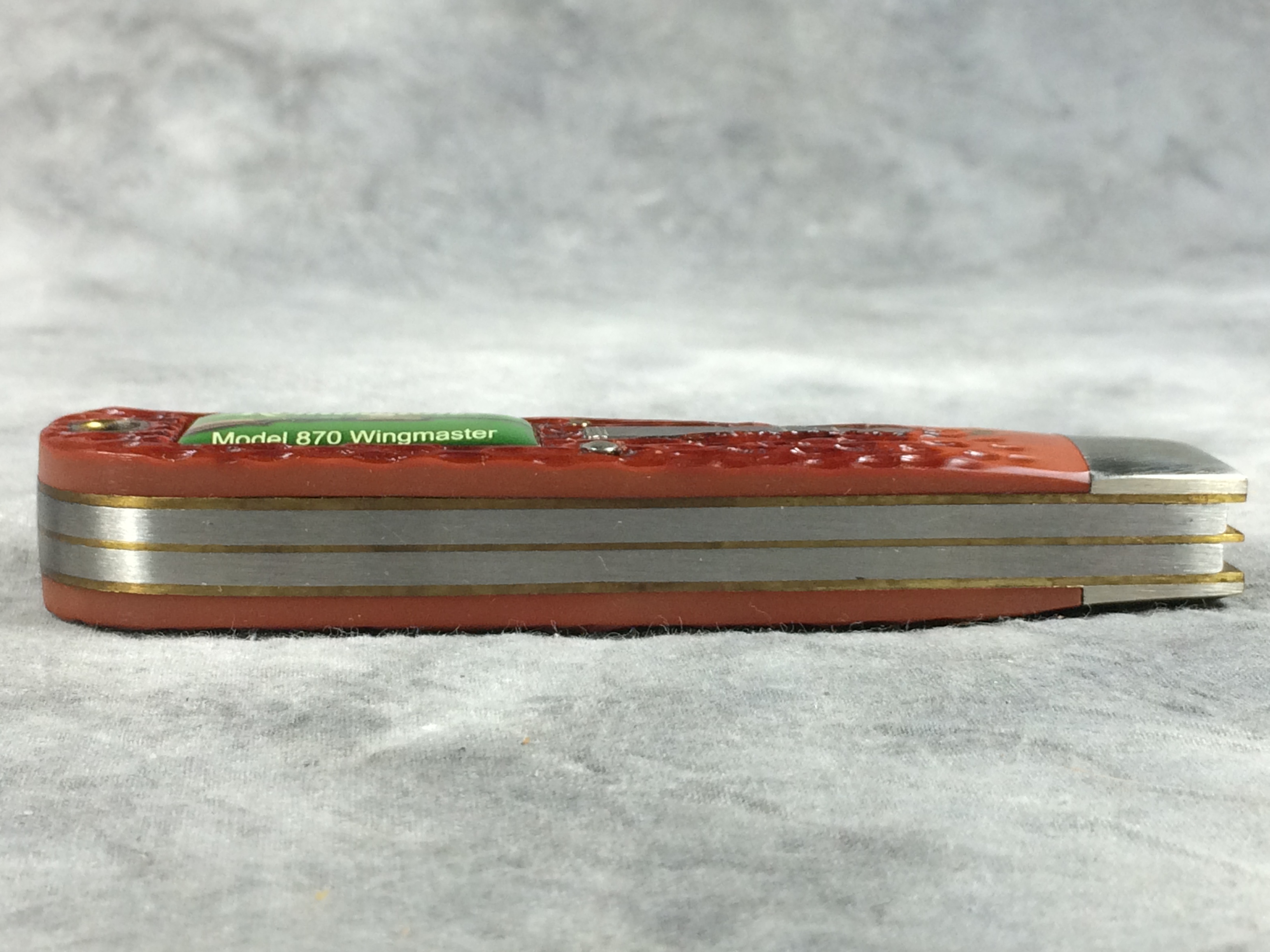 January 08, 2026 - 2-Blade "TOP GUNS" Trapper Bullet Knife. 4-1/2 inches closed. 8 inches open. Made in USA. 'Remington Madison N.C. USA' tang stamp. Bullet shield and special green rectangular "Remington Model 870 Wingmaster" shield with image of the gun. Blades etched "Remington TRADE MARK" and "MODEL 870 WINGMASTER Remington 12 GA Peters". Jigged delrin handles. Nickel Silver bolsters. Brass liner.