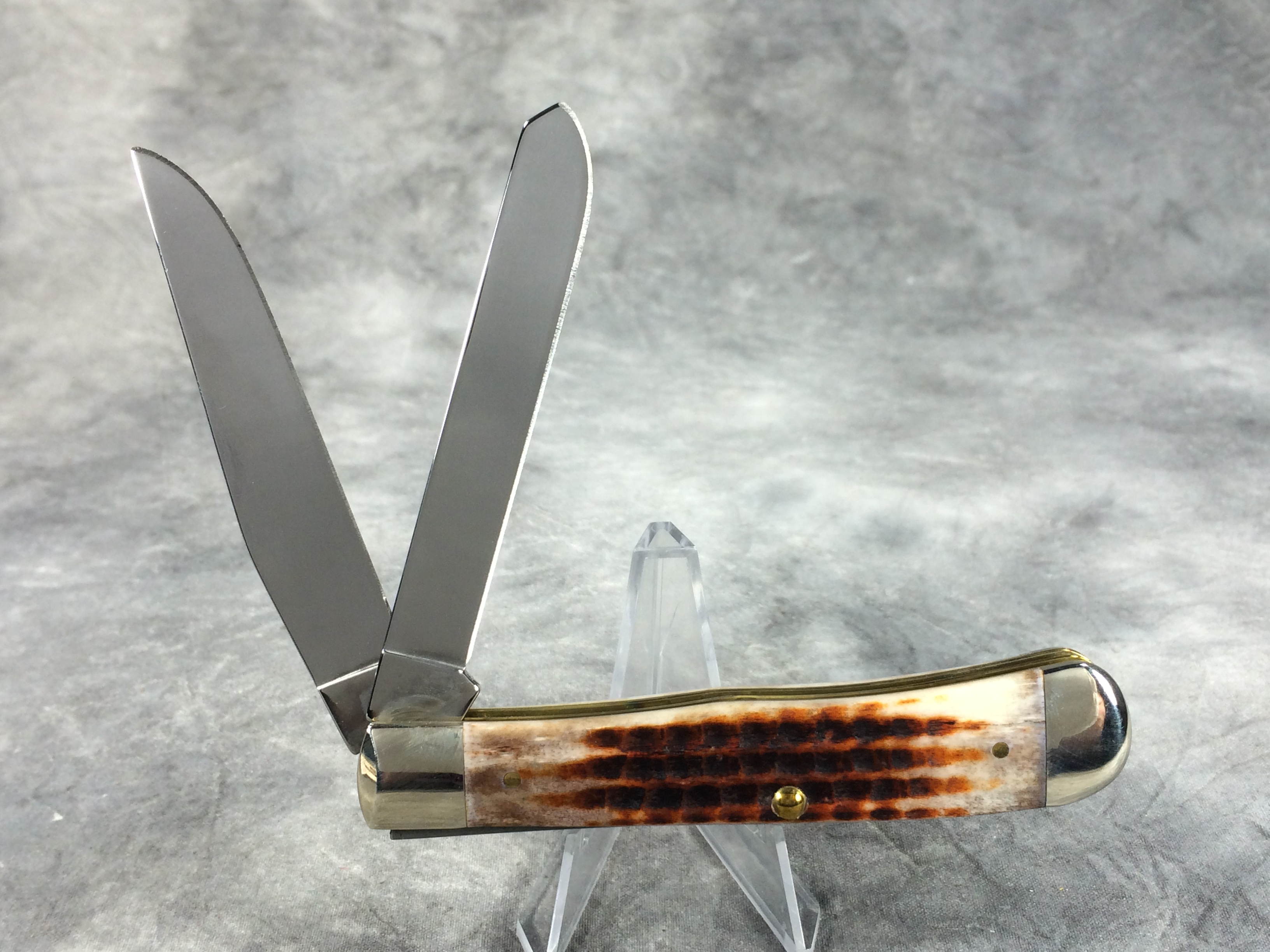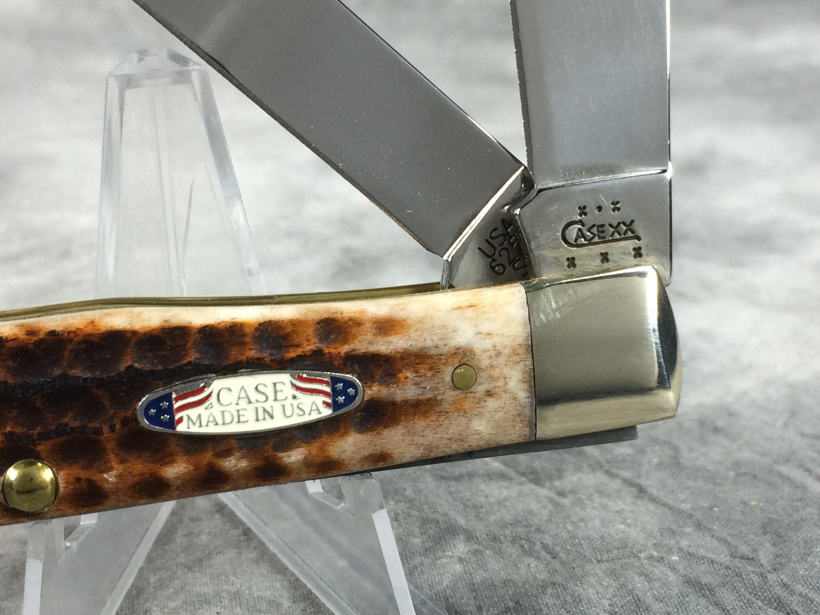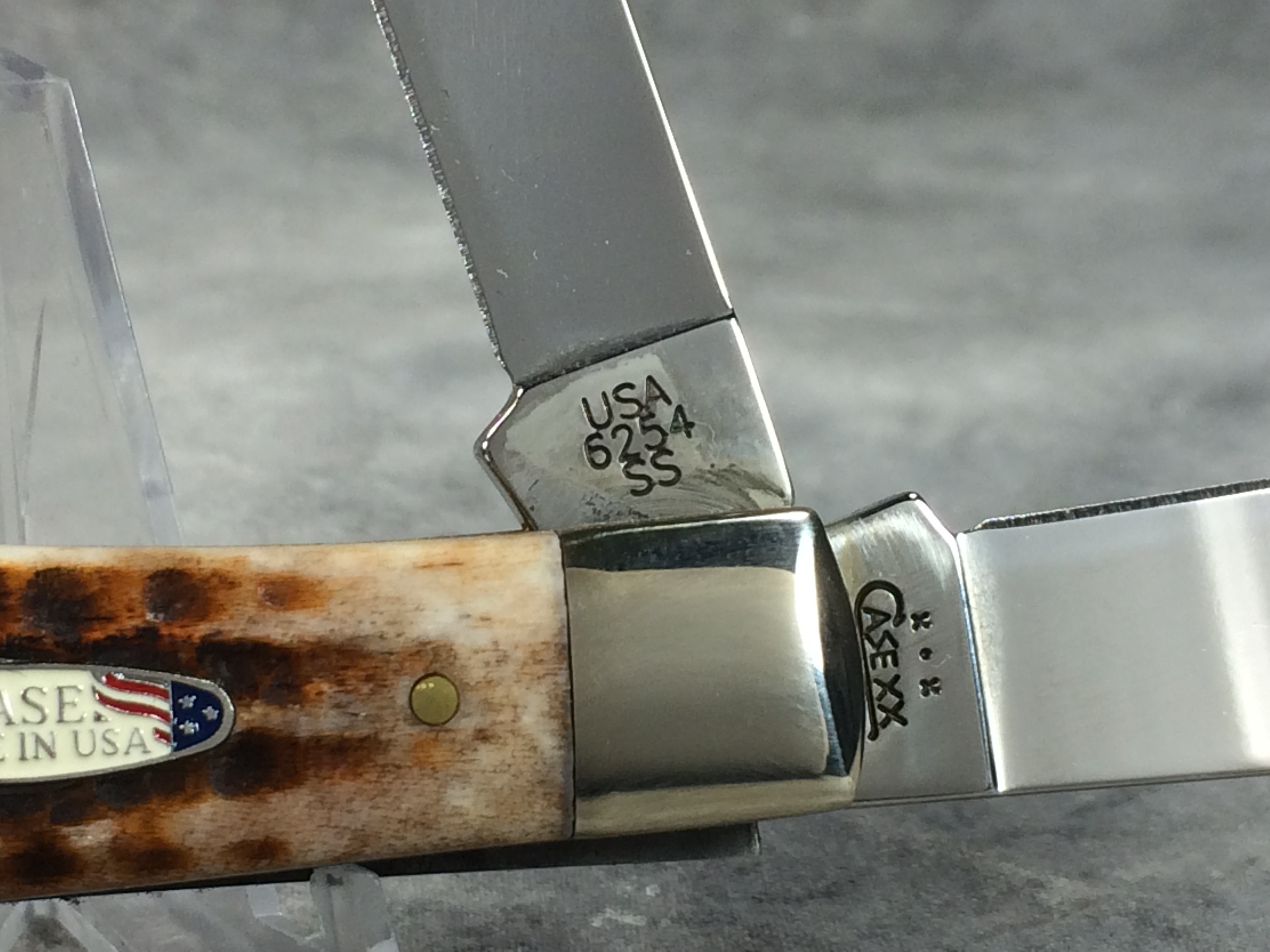 November 06, 2025 - 4-1/4 inches closed. 7-7/8 inches open. Made in USA. "  x*x  CASE XX  x x x  " (with lightning bolt S) and "USA 6254 SS" tang stamps. Oval "CASE MADE IN USA" shield. Stainless Steel blades. Jigged Honey Brown Bone handle. Nickel Silver bolsters. Brass liner.