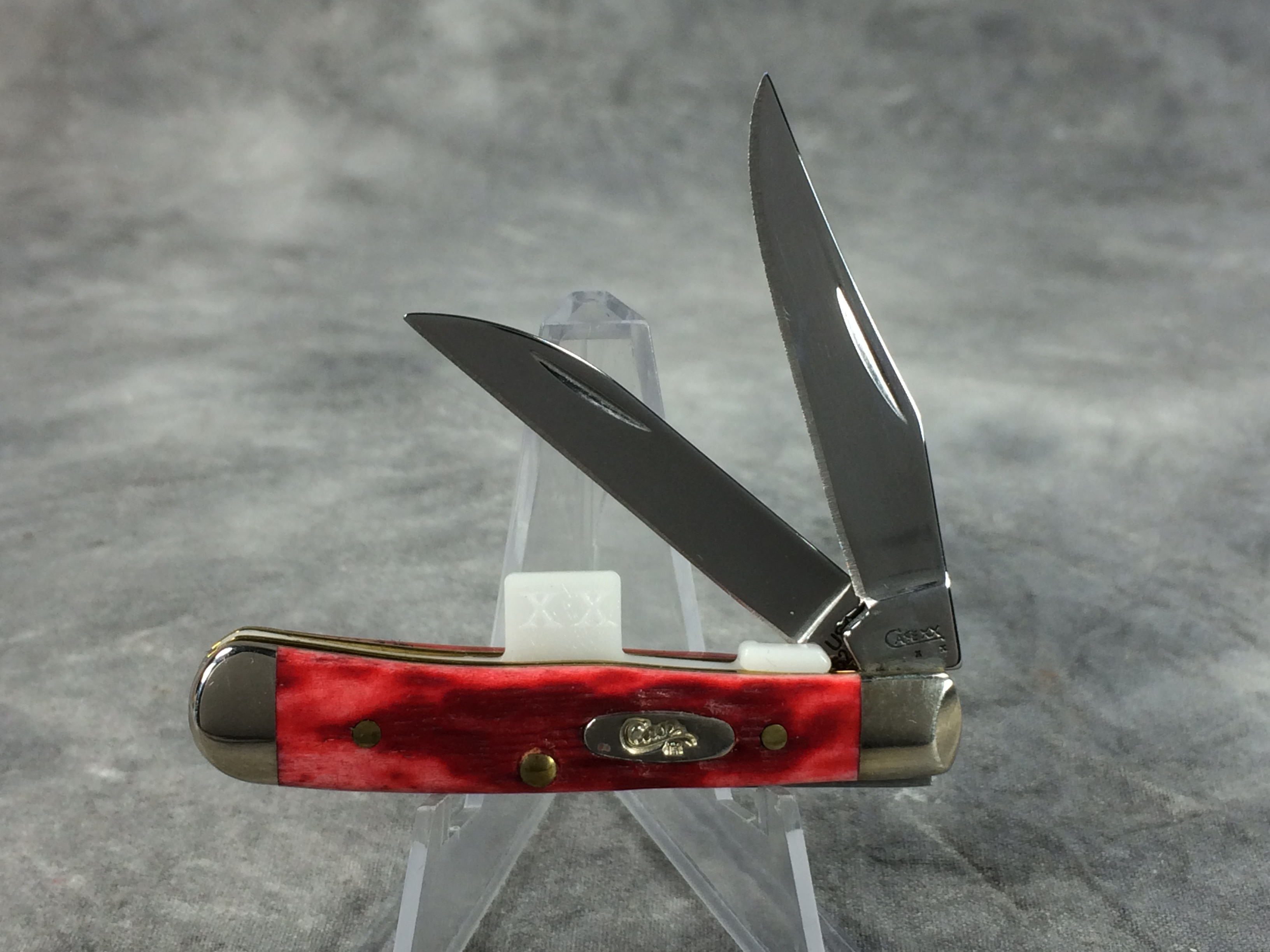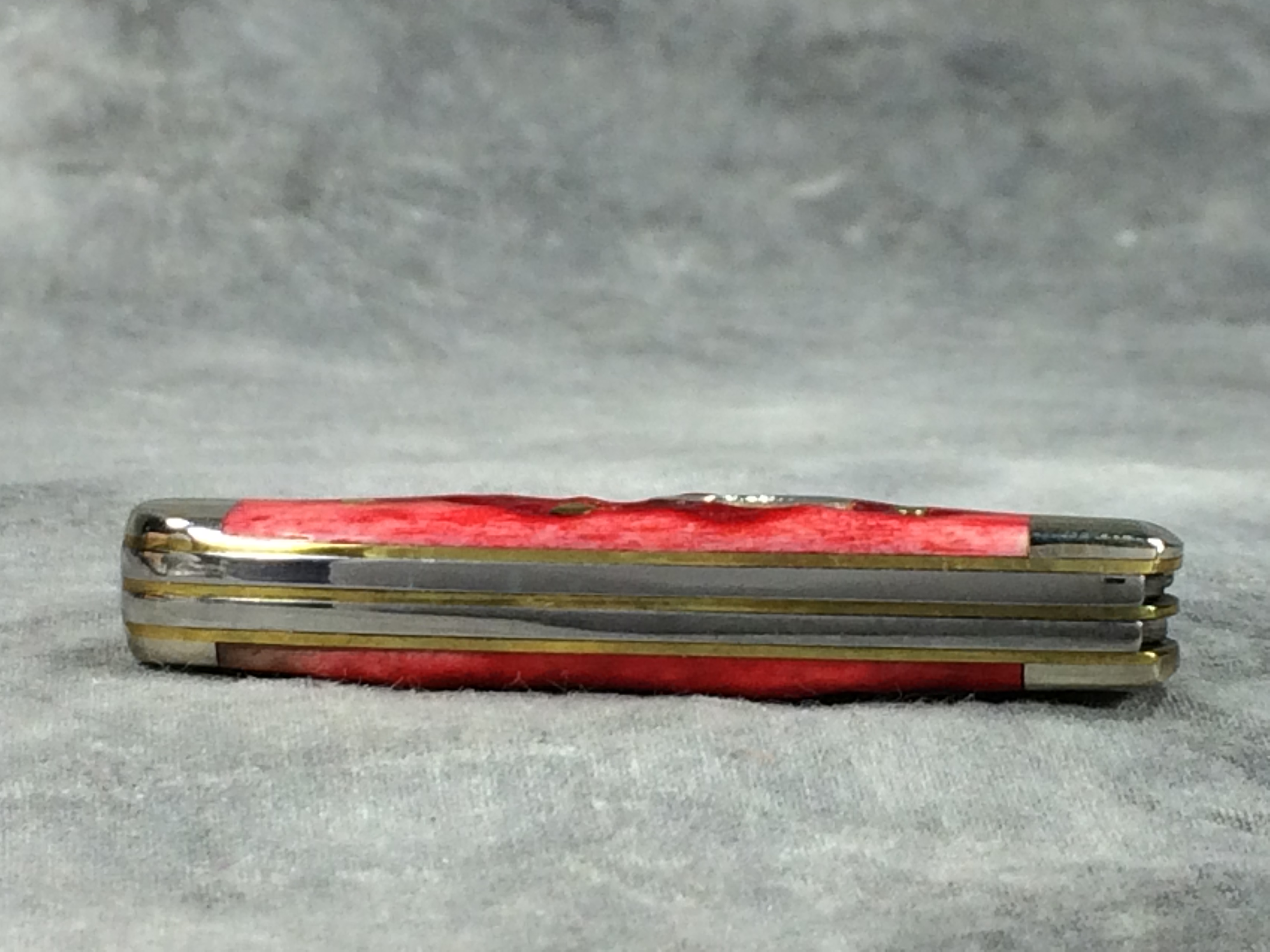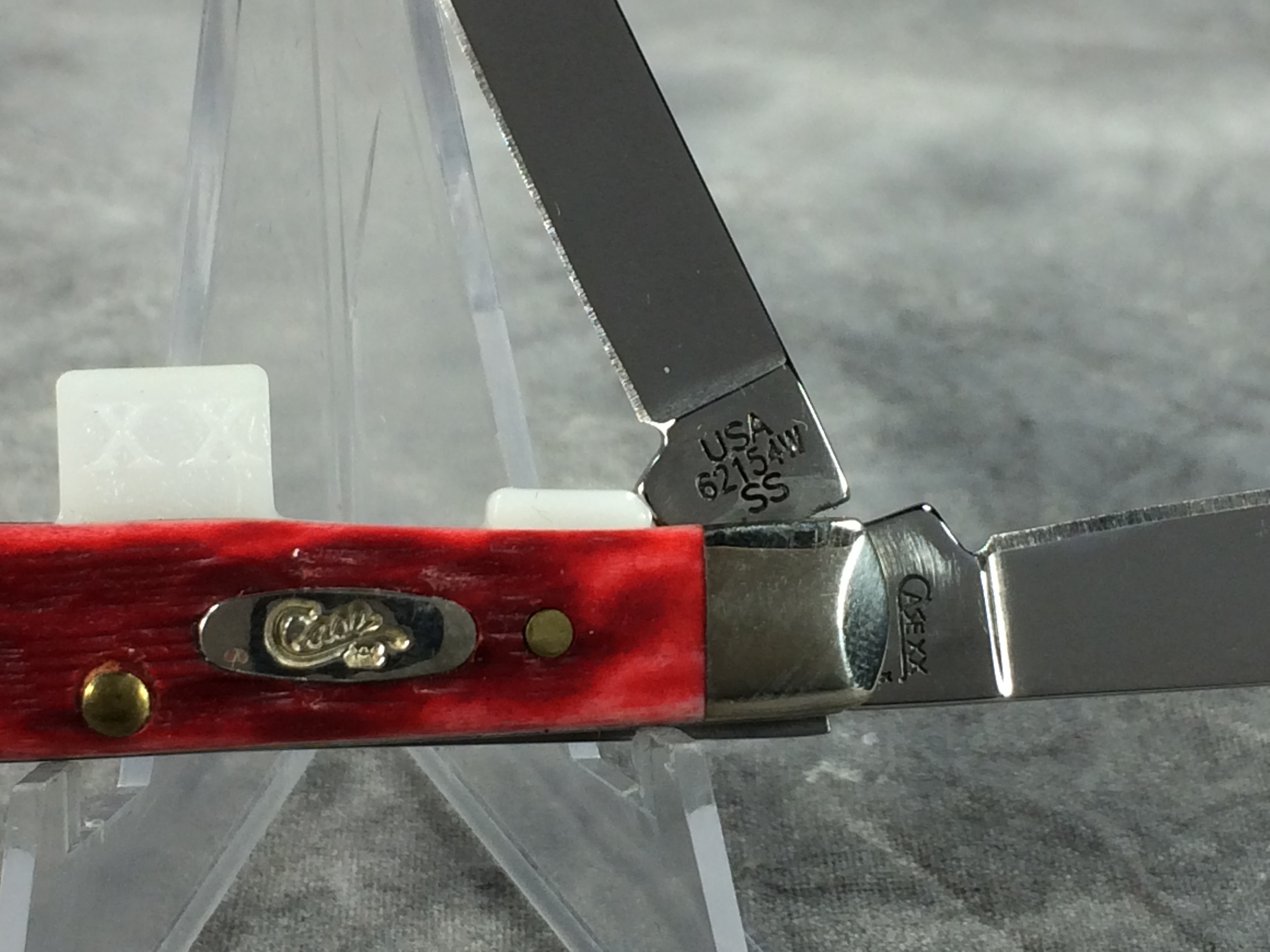 November 06, 2025 - 2-1/2 inches closed. 4-3/8 inches open. Made in USA. "       CASE XX   x  x  " (with lightning bolt S) and "USA 62154W SS" tang stamps. Stainless Steel blades. Red jigged bone handle. Oval long-C "Case XX" shield. Nickel silver bolsters. Brass liner.