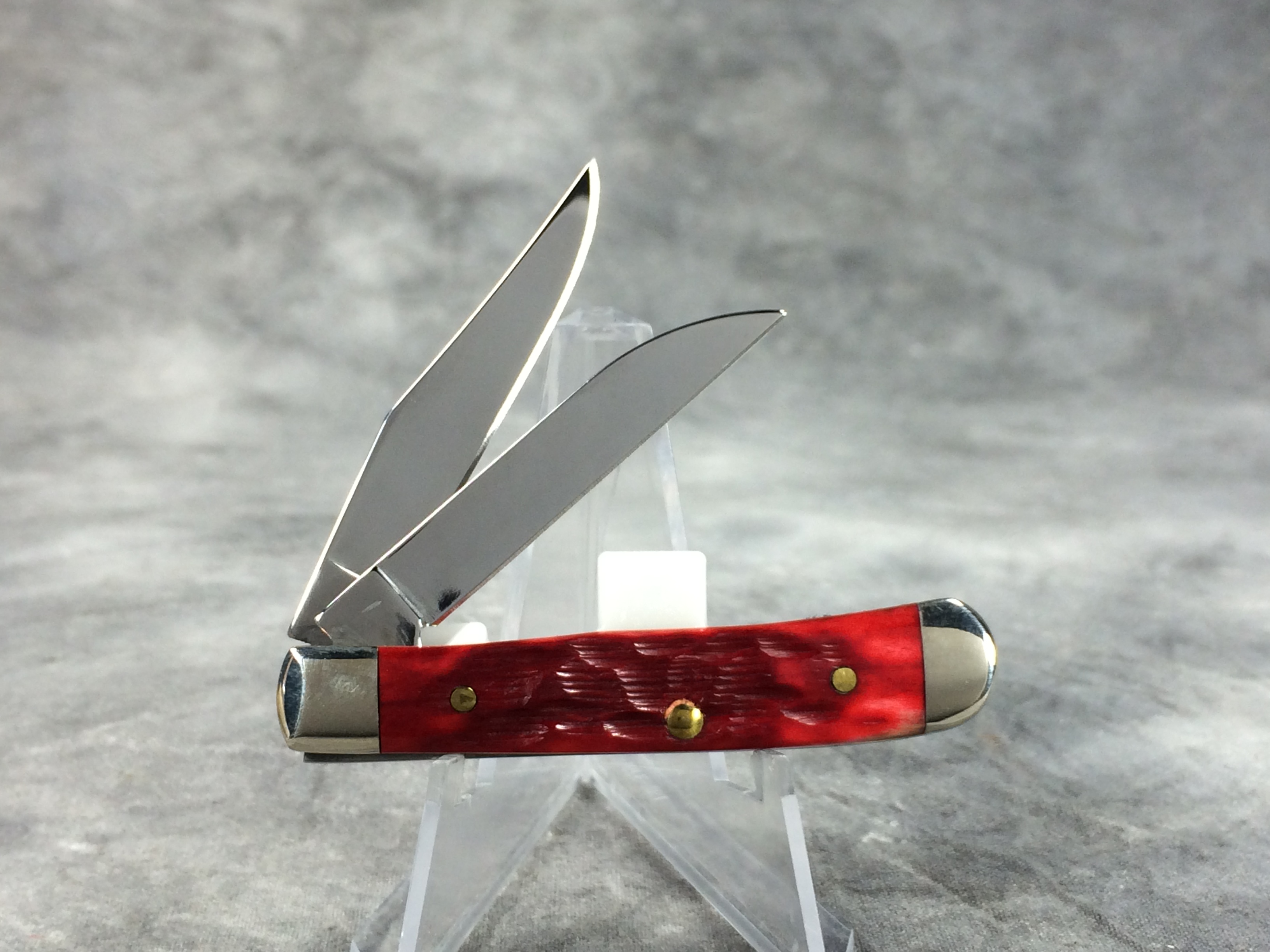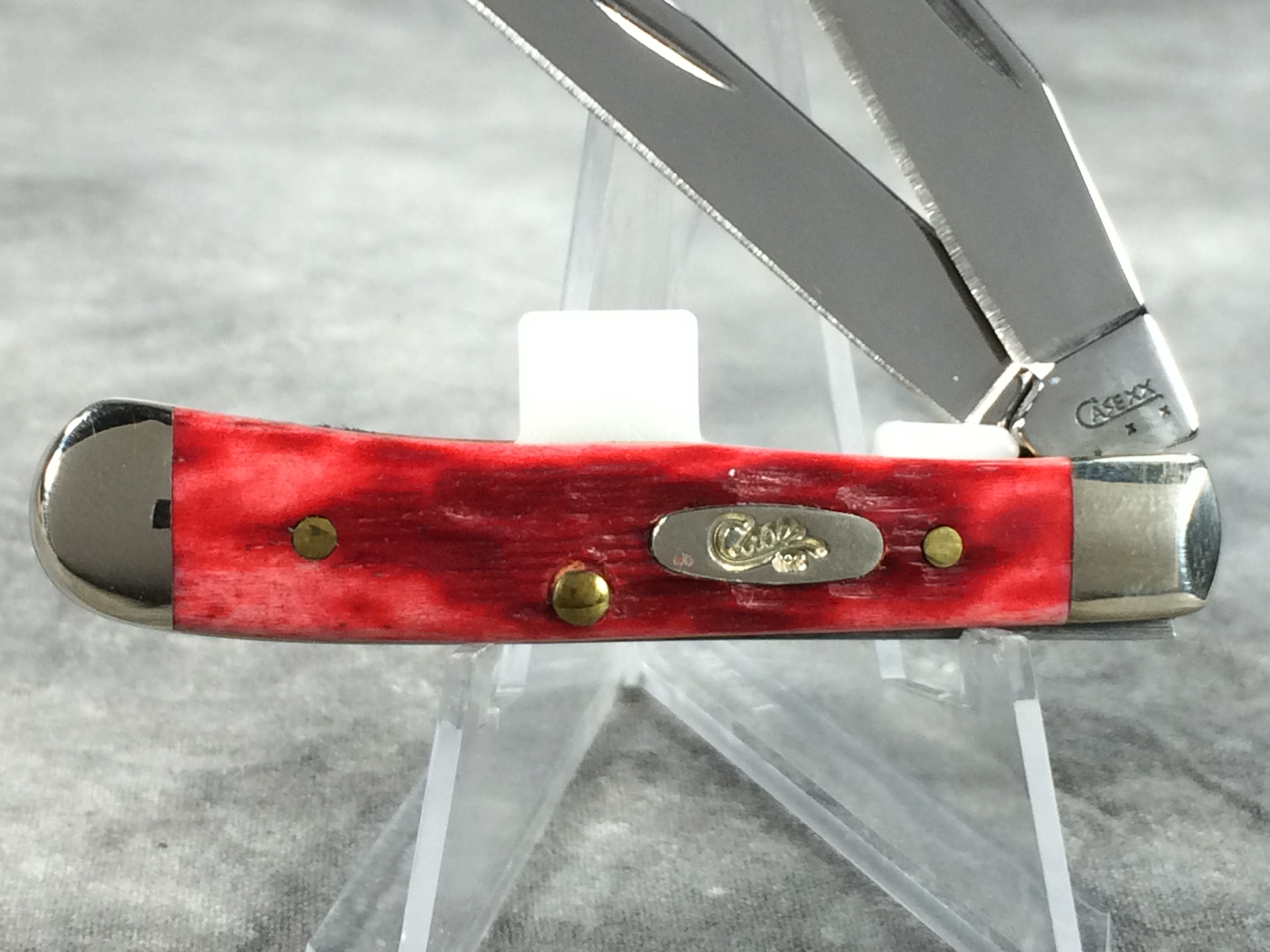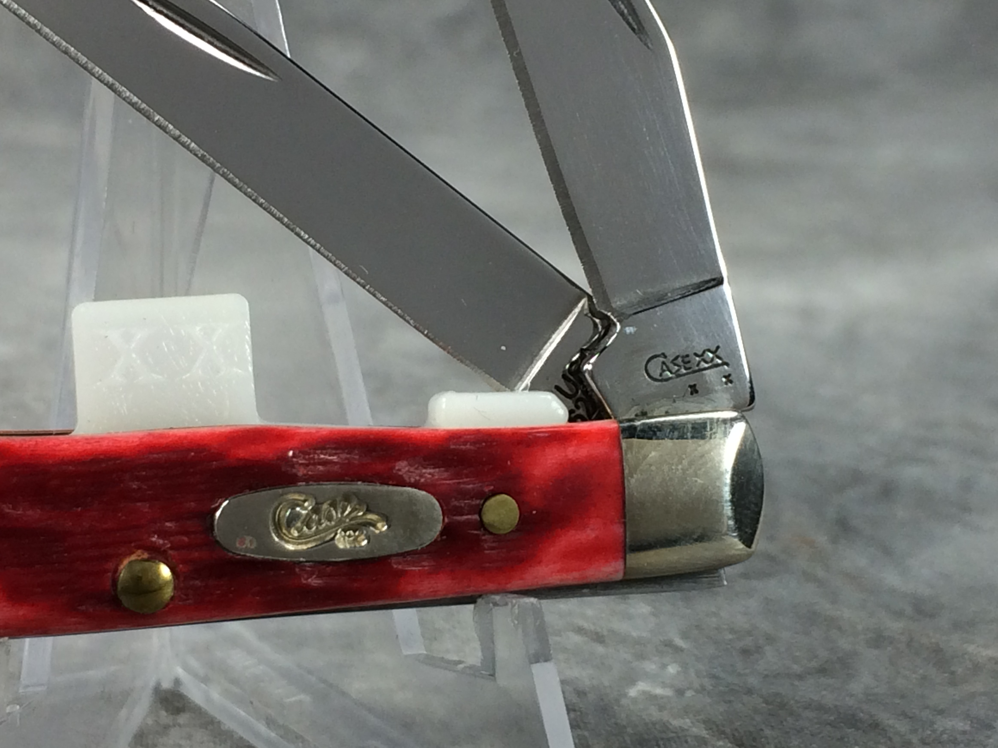 November 06, 2025 - 2-1/2 inches closed. 4-3/8 inches open. Made in USA. "       CASE XX   x  x  " (with lightning bolt S) and "USA 62154W SS" tang stamps. Stainless Steel blades. Red jigged bone handle. Oval long-C "Case XX" shield. Nickel silver bolsters. Brass liner.