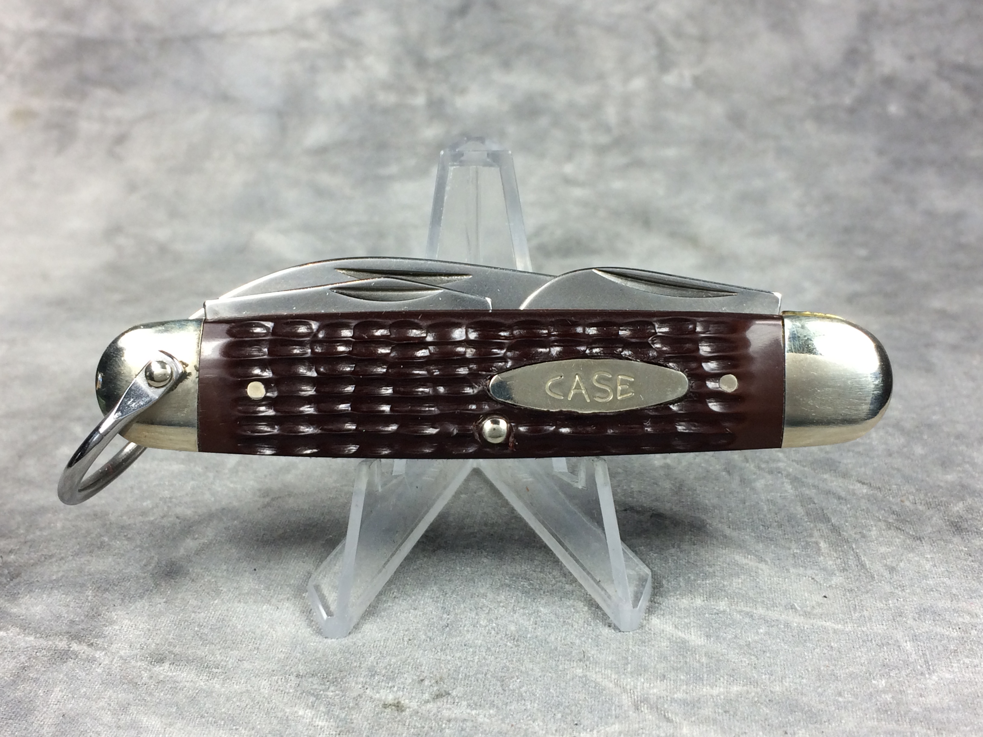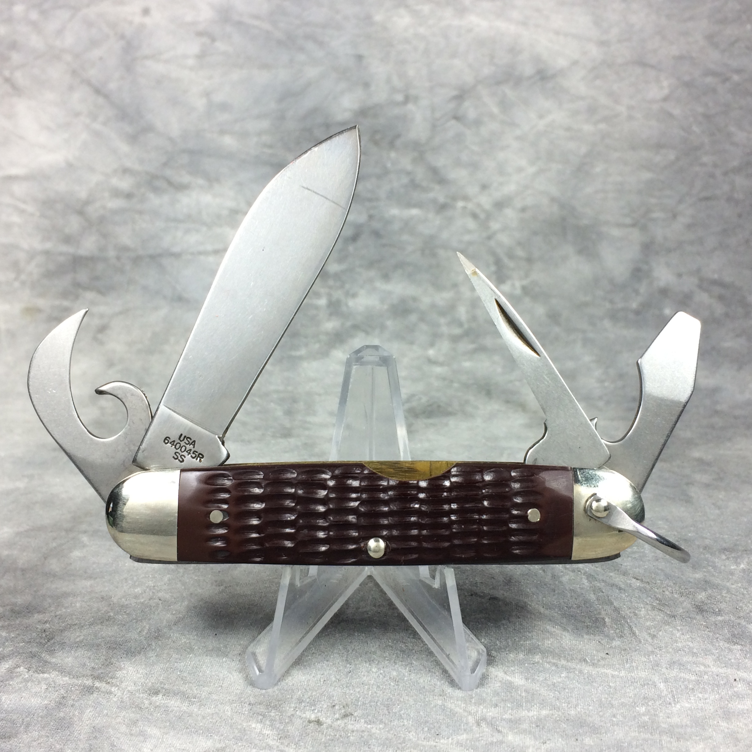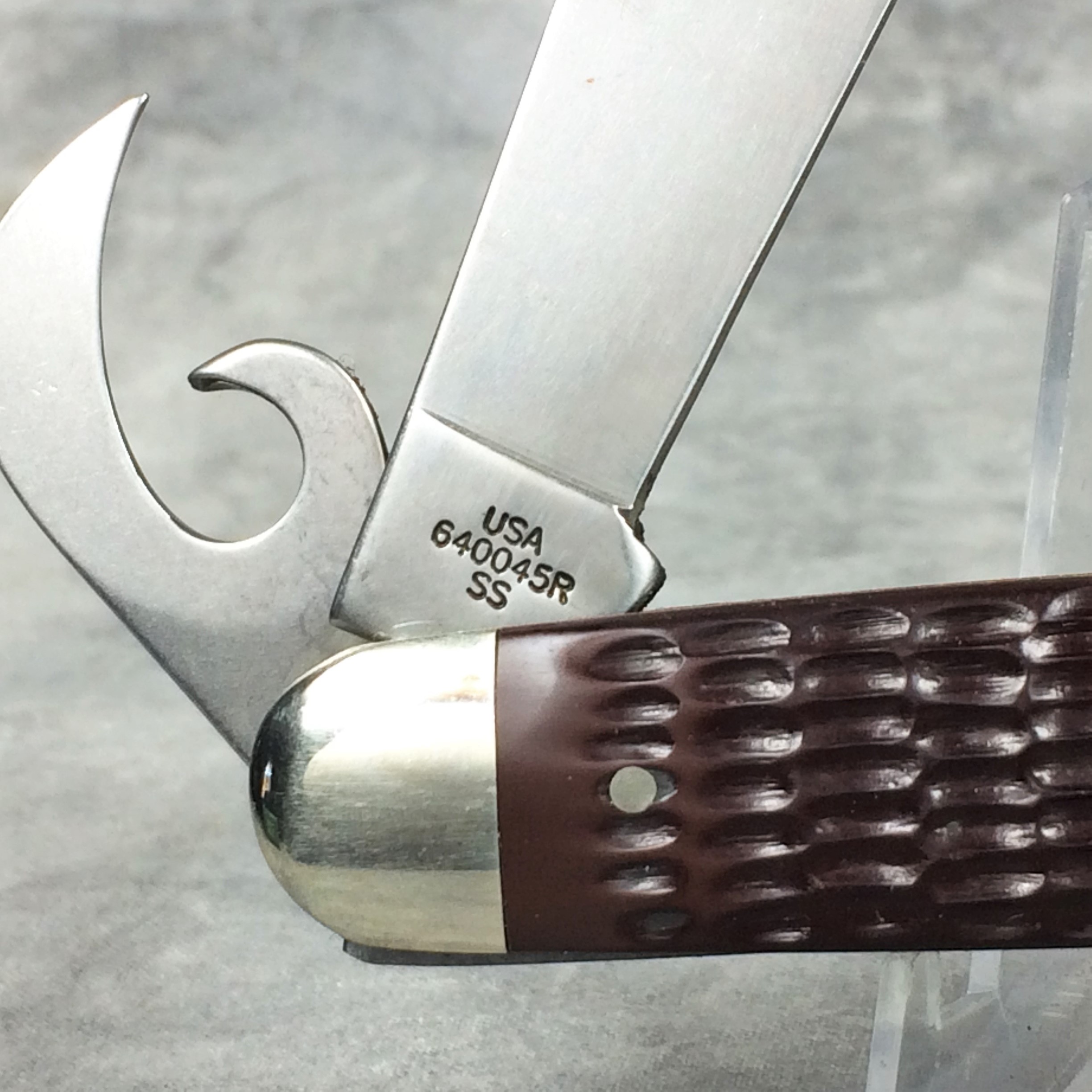 January 08, 2026 - 3-5/8 inches closed. 6-3/8 inches open. Made in USA. "   x x   Case XX  x x x  " (with lightning bolt S) and "USA 640045R SS" tang stamps. Oval open-C "CASE" shield. Stainless Steel blades. Jigged delrin handle. Nickel Silver bolsters. Brass liner.
