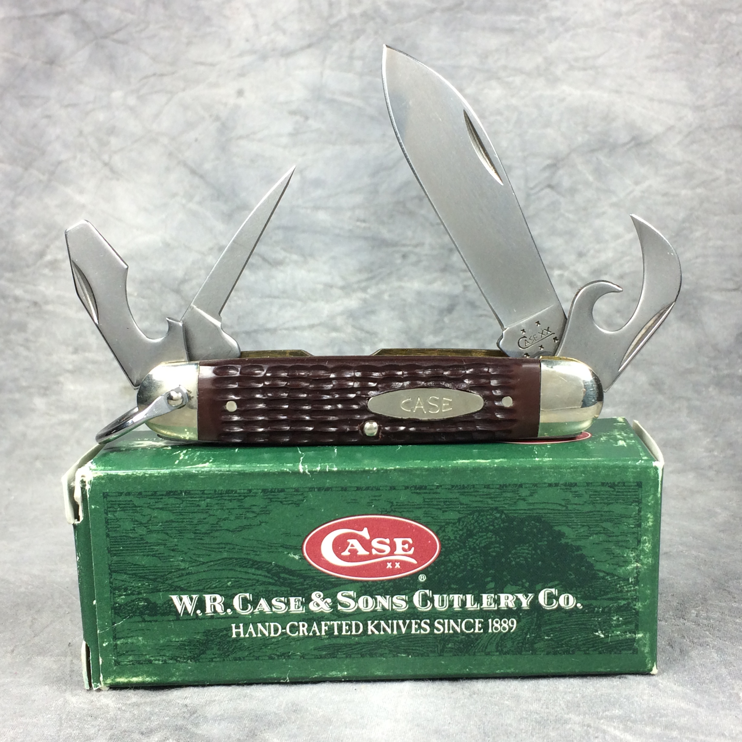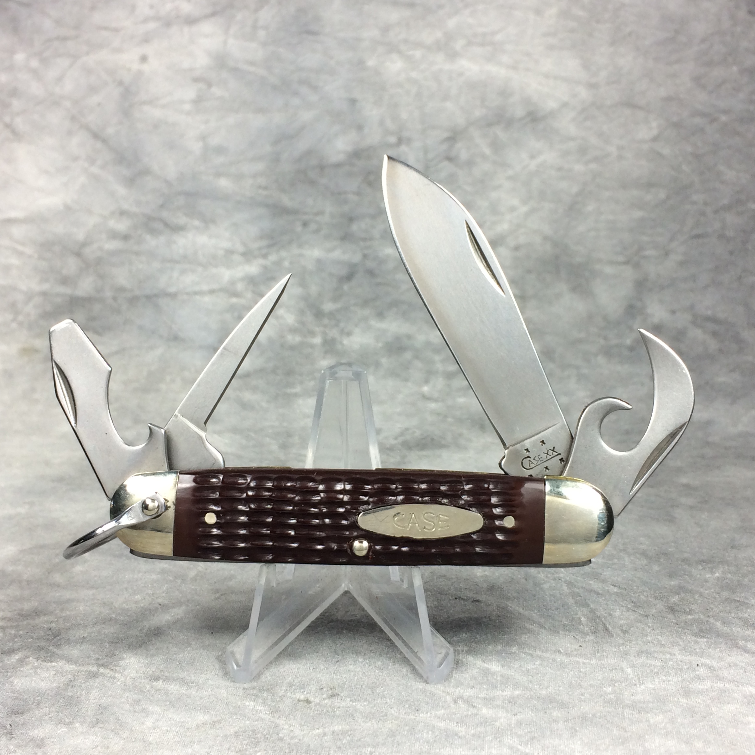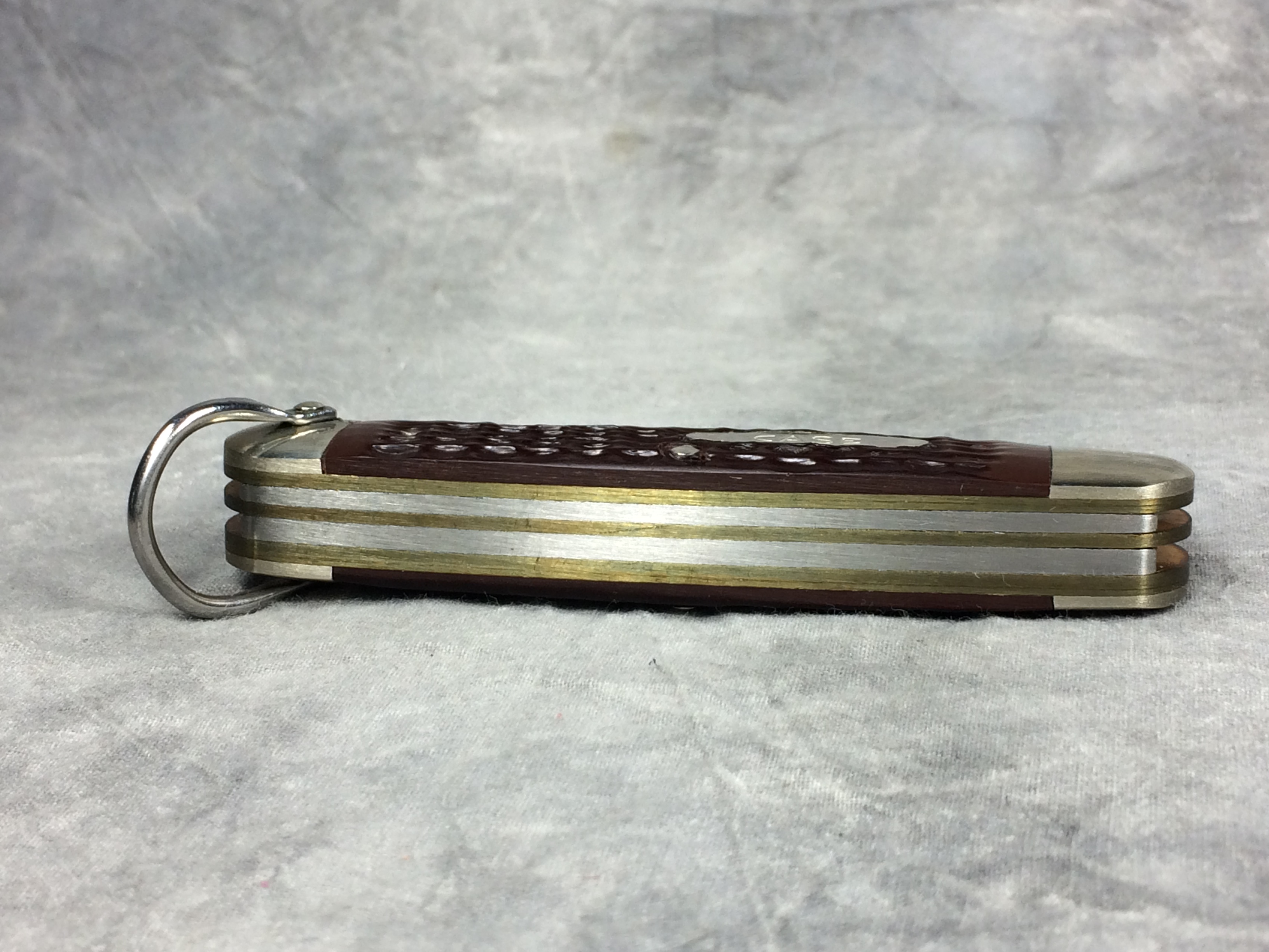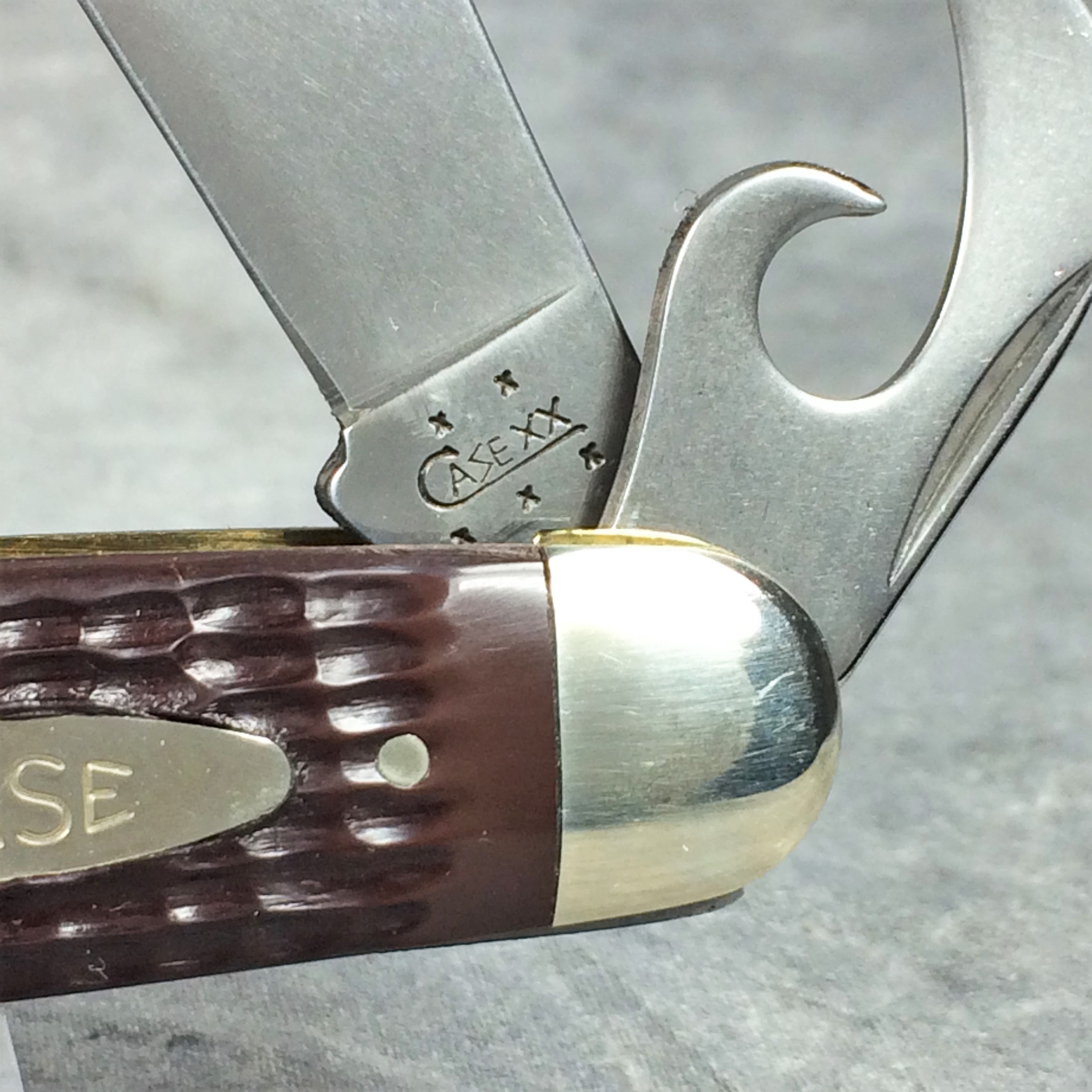 January 08, 2026 - 3-5/8 inches closed. 6-3/8 inches open. Made in USA. "   x x   Case XX  x x x  " (with lightning bolt S) and "USA 640045R SS" tang stamps. Oval open-C "CASE" shield. Stainless Steel blades. Jigged delrin handle. Nickel Silver bolsters. Brass liner.
