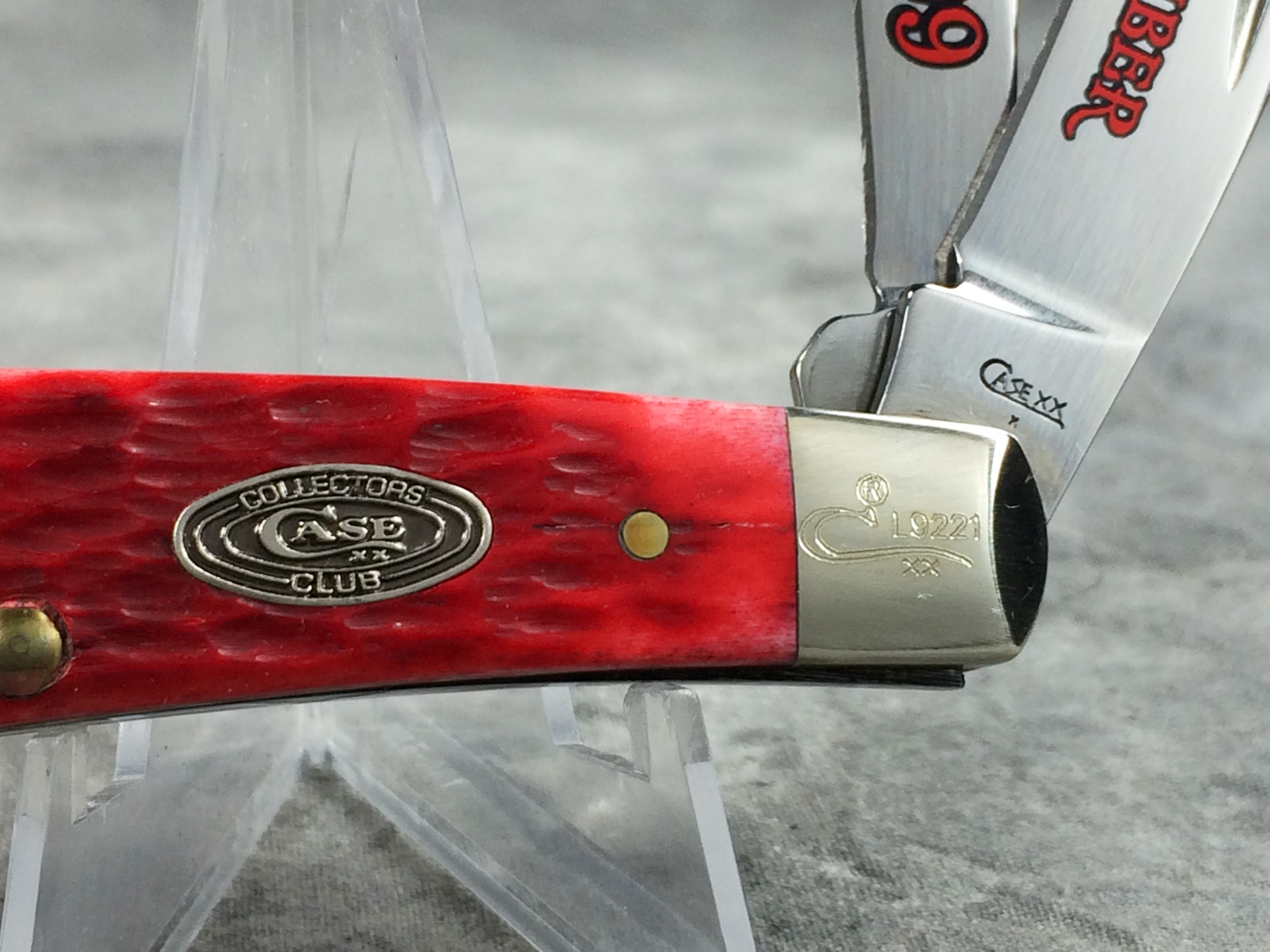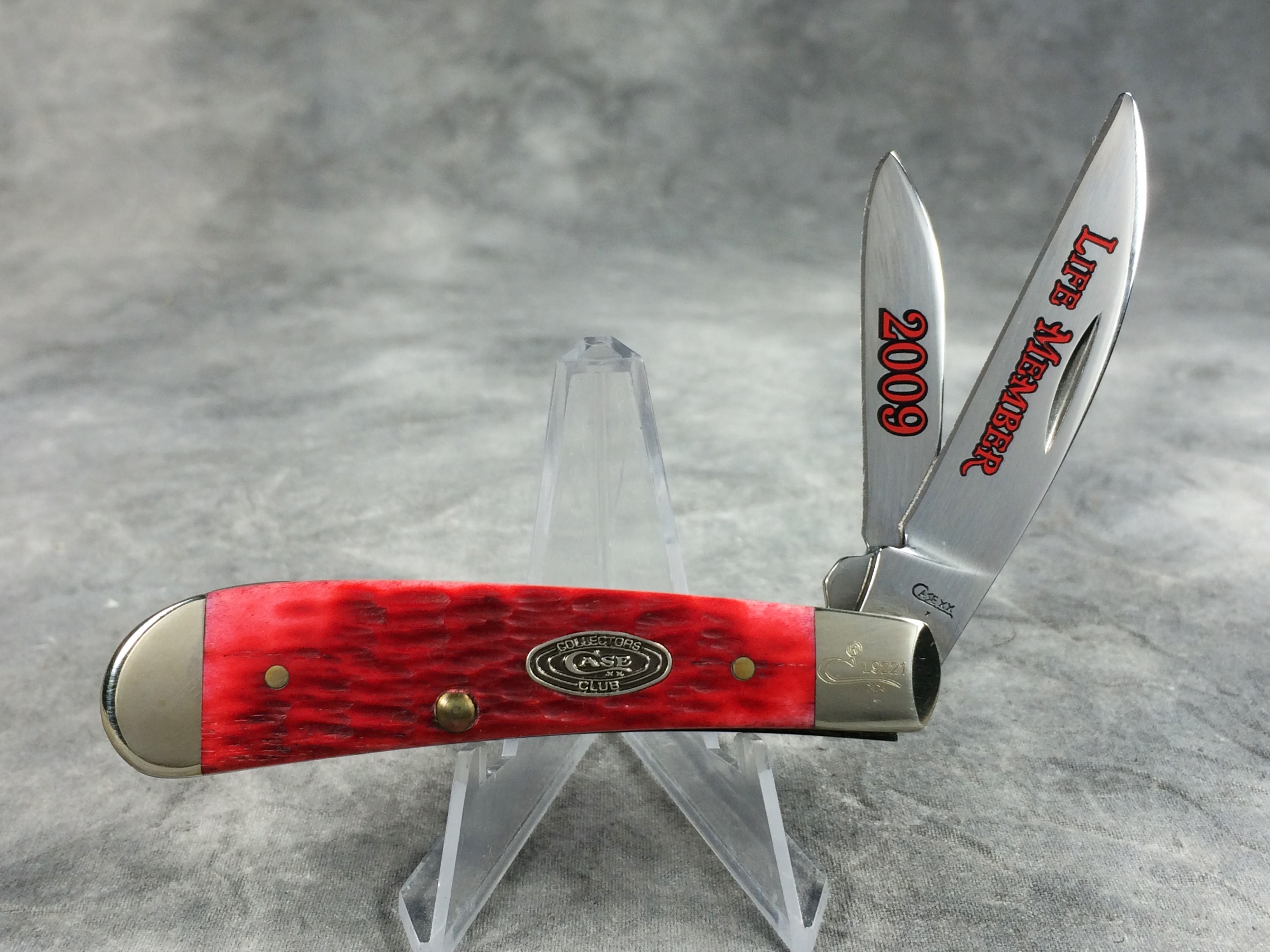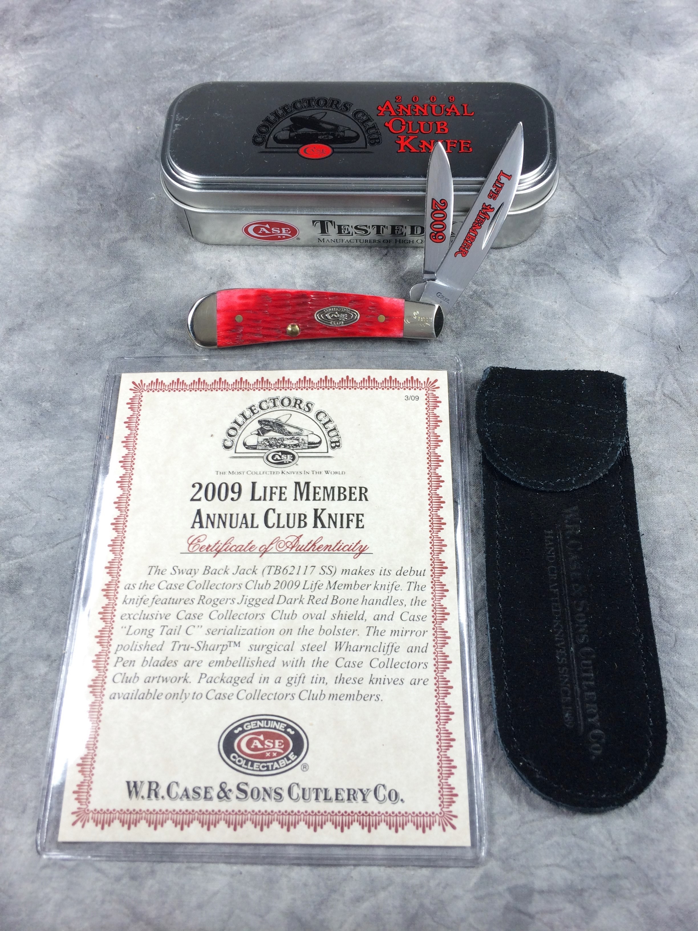 January 08, 2026 - Limited Edition  Designed by Tony Bose.  3-1/4 inches closed. 5-1/2 inches open. Made in USA. "       CASE XX   x   " (with lightning bolt S) and "USA T.B.62117 SS" tang stamps. Oval "CASE COLLECTORS CLUB" shield. Stainless steel blades etched "LIFE MEMBER" and "2009" in red. Red Jigged Bone handle. Nickel Silver bolsters. Front right bolster etched with. Brass liner.