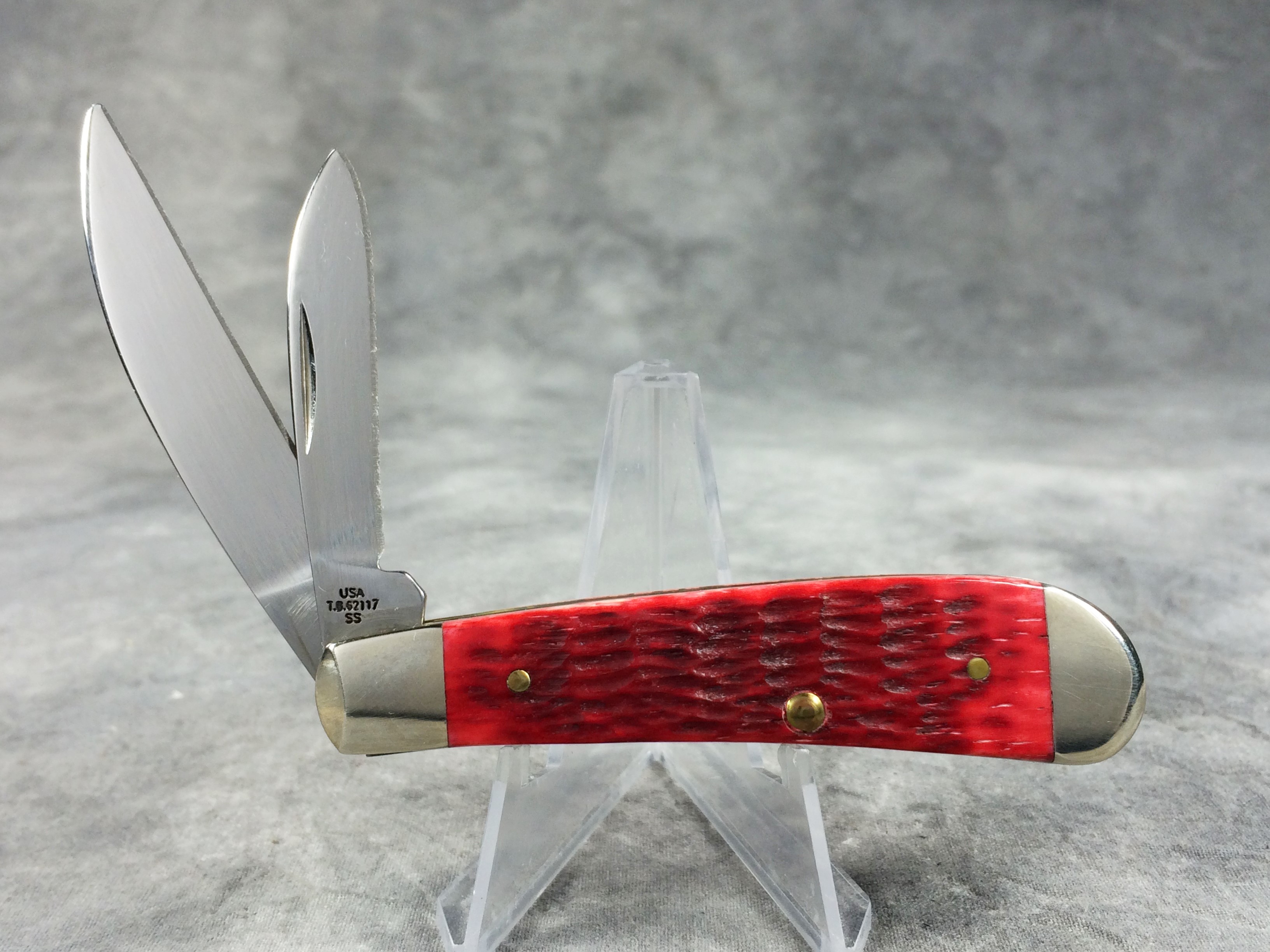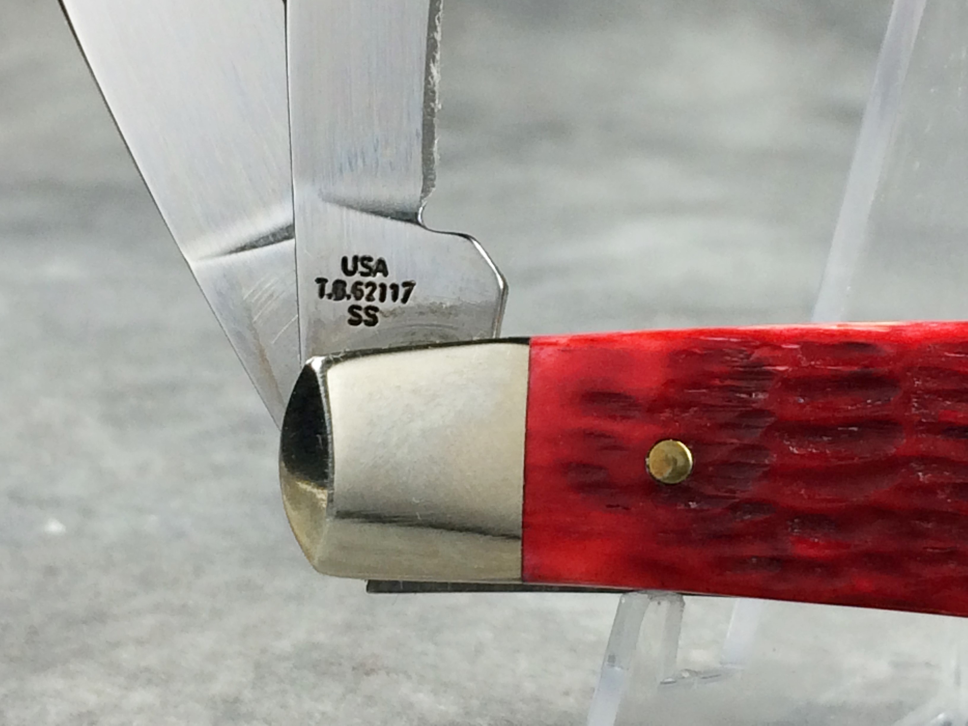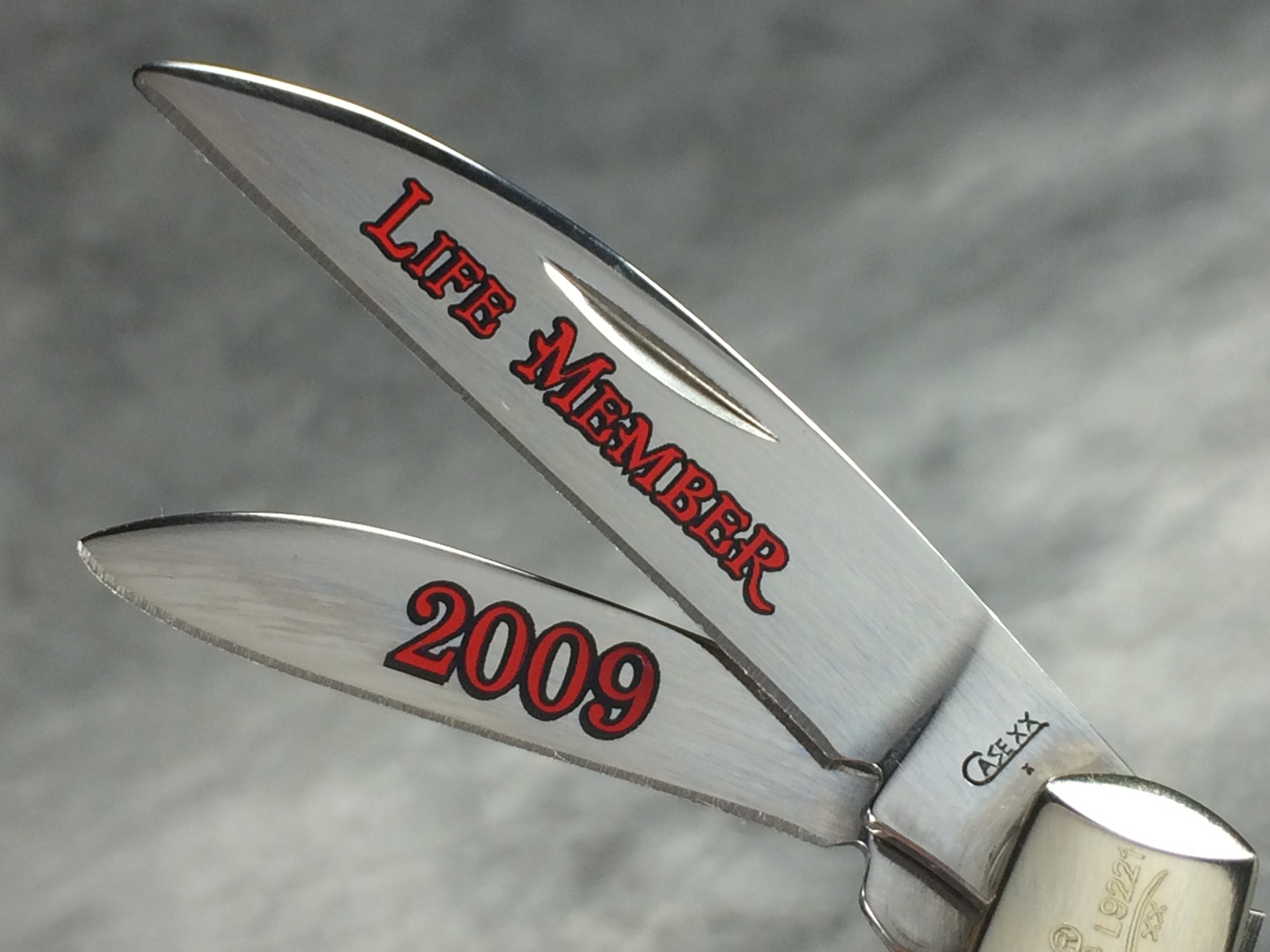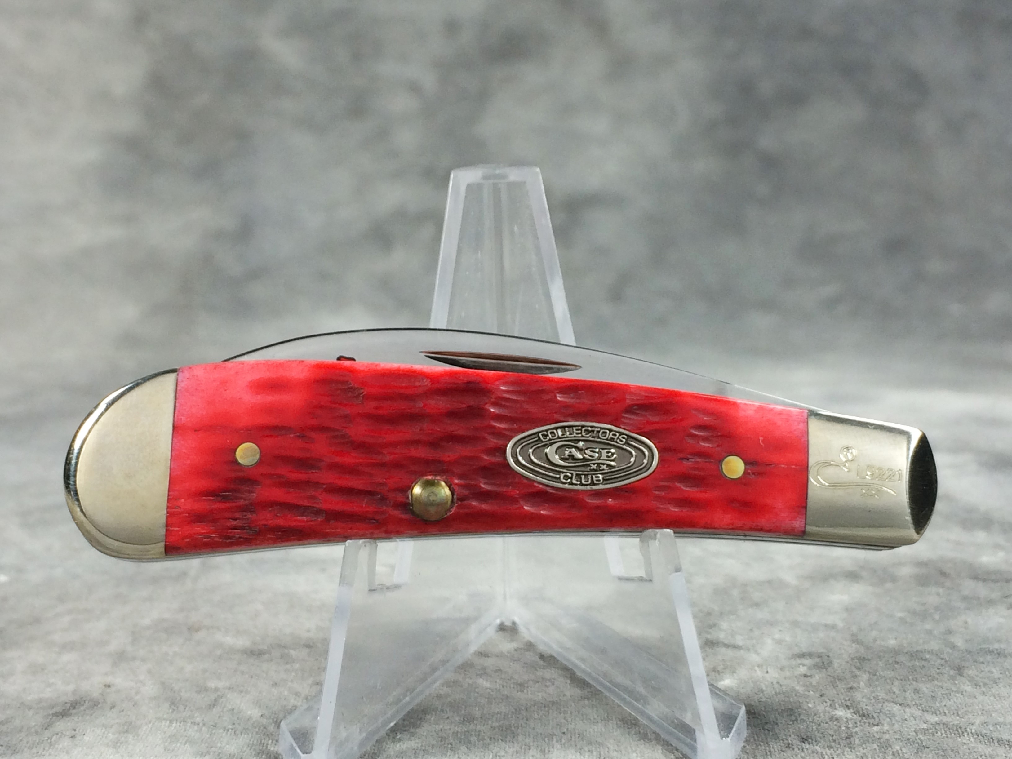 January 08, 2026 - Limited Edition  Designed by Tony Bose.  3-1/4 inches closed. 5-1/2 inches open. Made in USA. "       CASE XX   x   " (with lightning bolt S) and "USA T.B.62117 SS" tang stamps. Oval "CASE COLLECTORS CLUB" shield. Stainless steel blades etched "LIFE MEMBER" and "2009" in red. Red Jigged Bone handle. Nickel Silver bolsters. Front right bolster etched with. Brass liner.