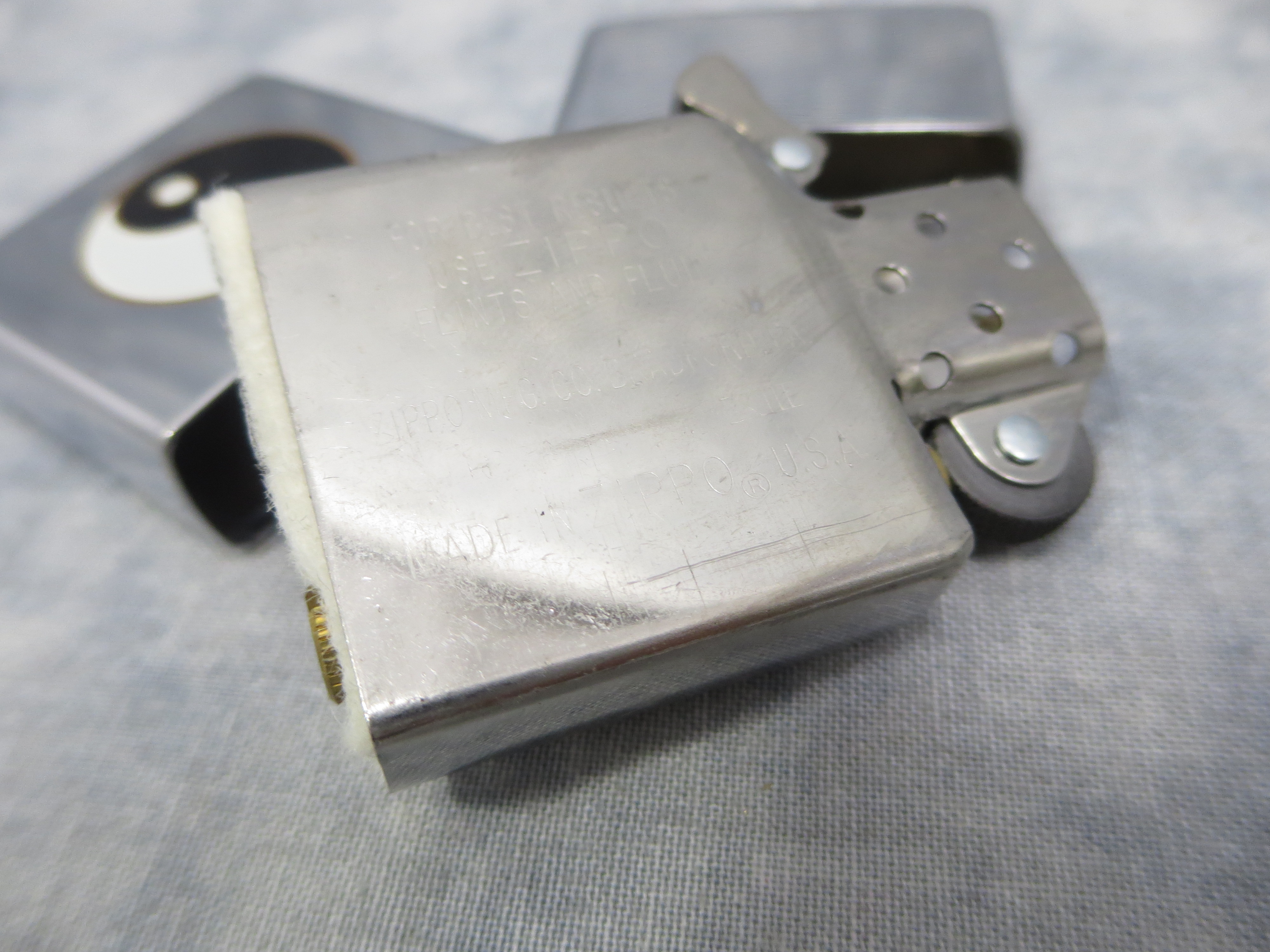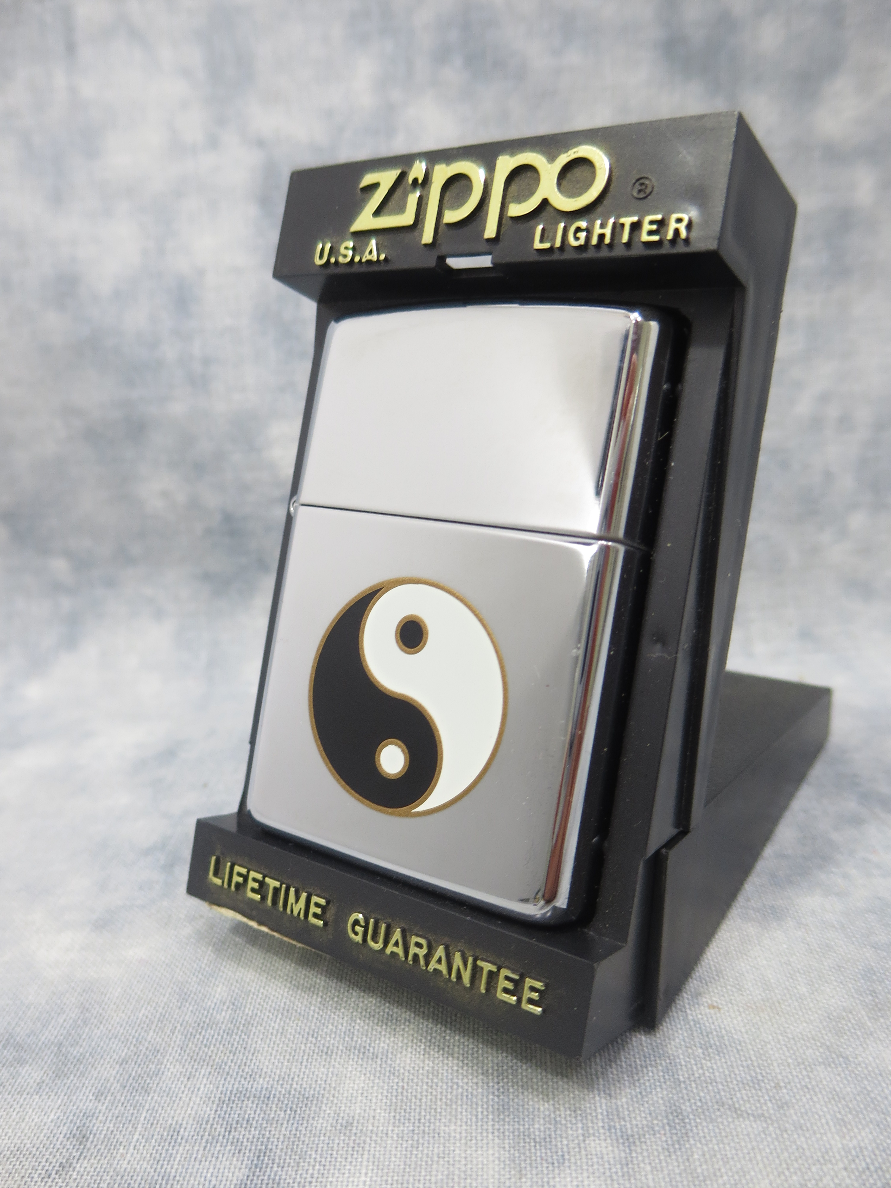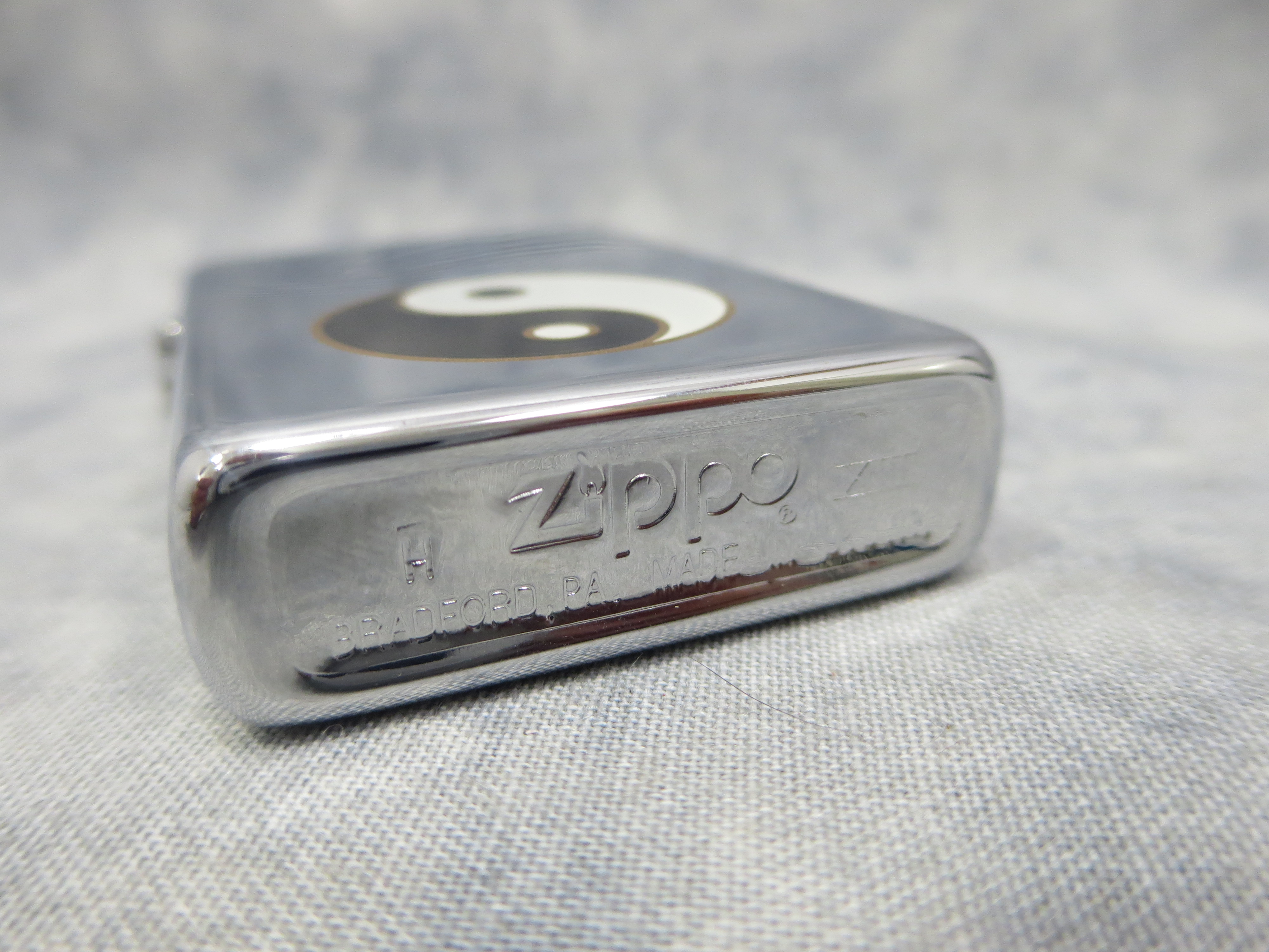 December 28, 2025 - ZIPPO Yin Yang Lighter circa 1997. Polished Chrome finish over solid Brass. Standard size 1-7/16 inches wide by 2-1/4 inches high. Bottom of lighter reads: H Zippo XIII Bradford, PA. Made in U.S.A. Includes original, unfired H/XIII insert and Zippo box.