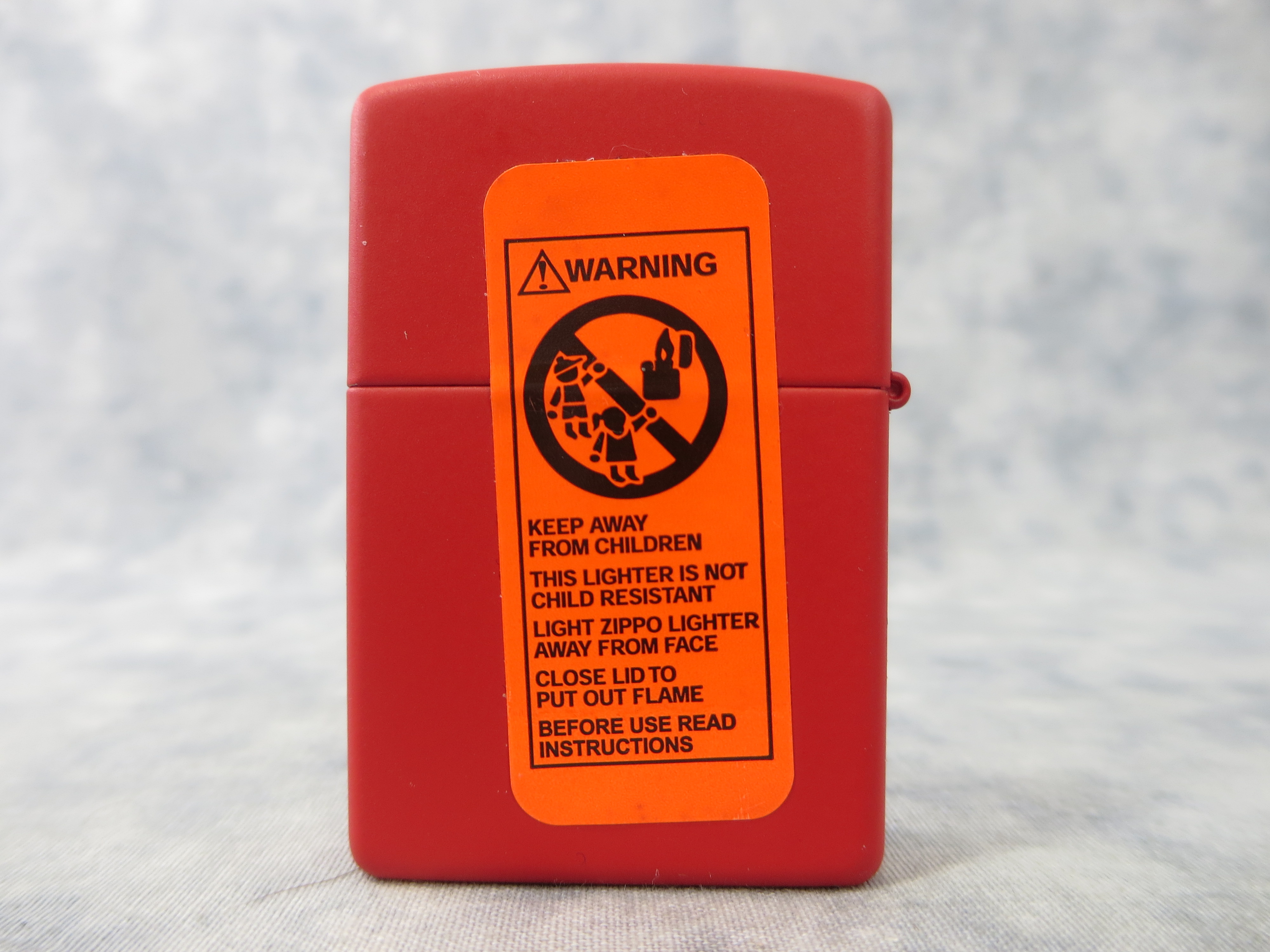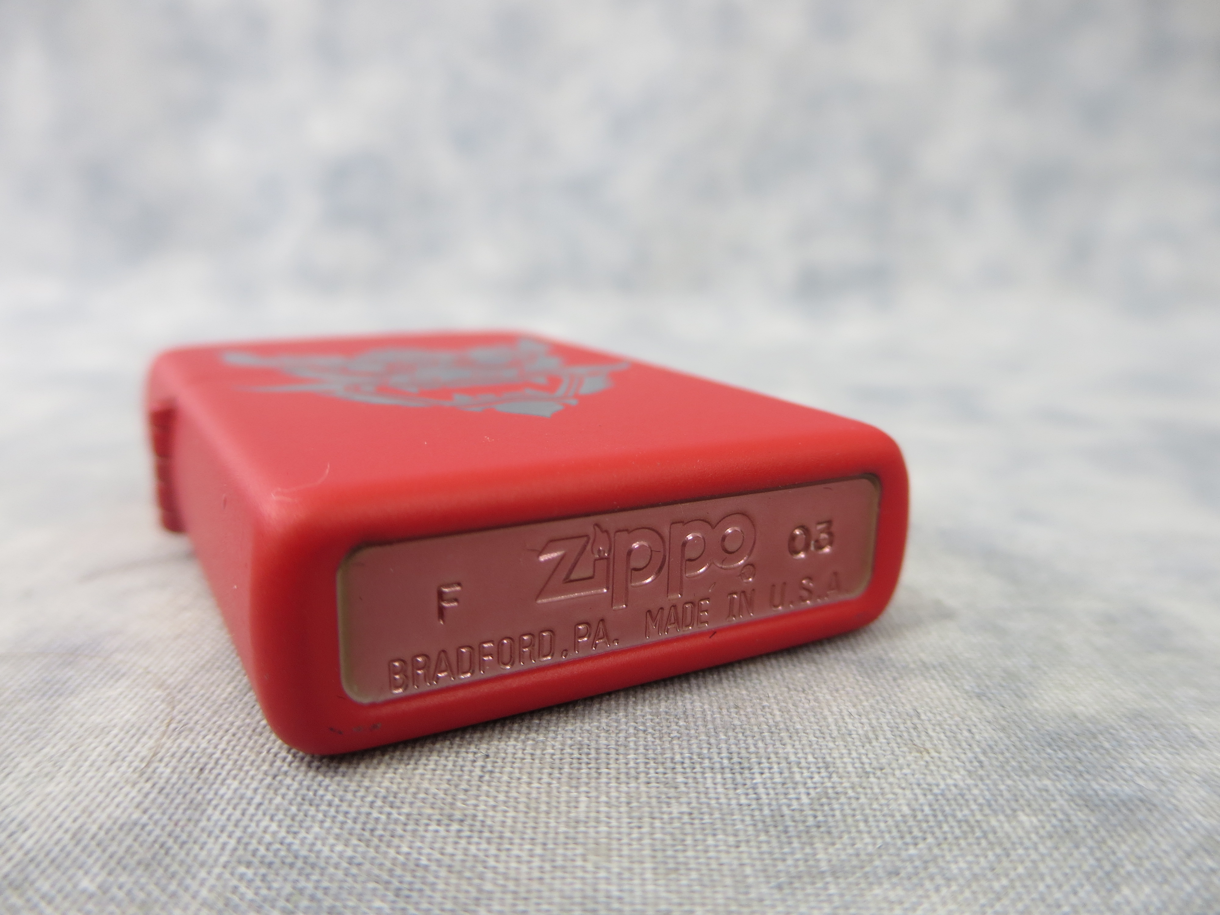 October 28, 2025 - ZIPPO Oriental Dragon Face lighter circa 2003. Matte Red finish over Solid Brass. Standard size 1-7/16 inches wide by 2-1/4 inches high. Bottom of lighter reads: F Zippo 03 Bradford, PA. Made in U.S.A. Includes original, unfired insert.