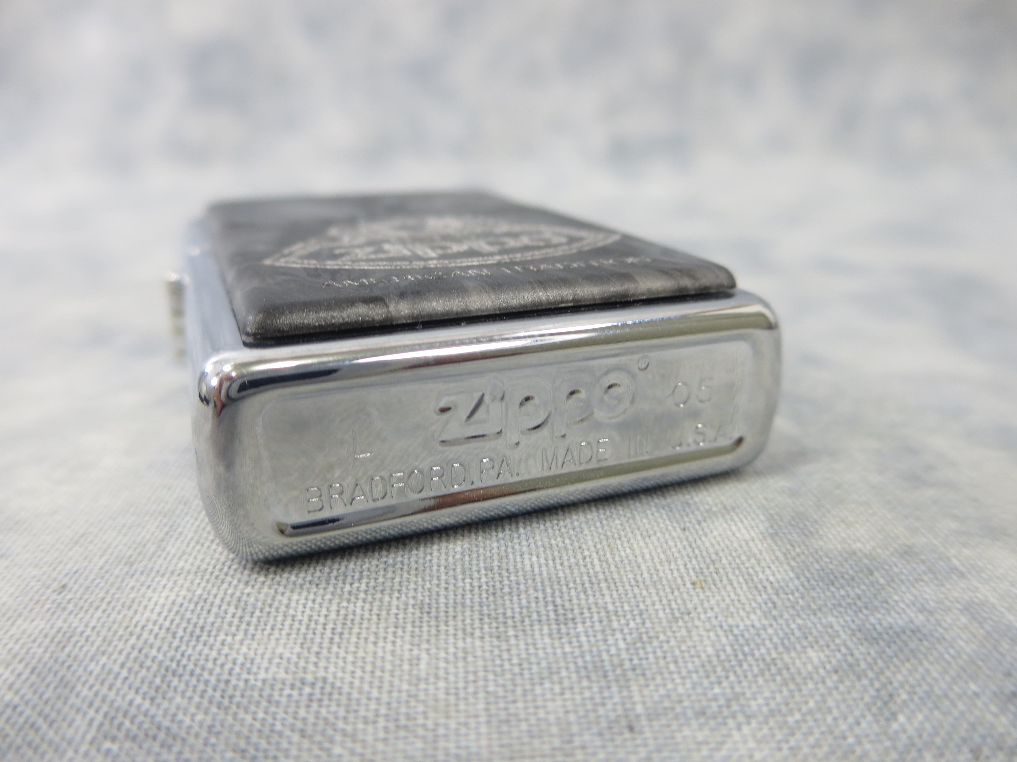 April 15, 2026 - ZIPPO American Tradition Lighter circa 2005. Polished Chrome finish over solid Brass with front emblem chips. Standard size 1-7/16 inches wide by 2-1/4 inches high. Bottom of lighter reads: L Zippo 05 Bradford, PA. Made in U.S.A. Includes original, unfired insert.