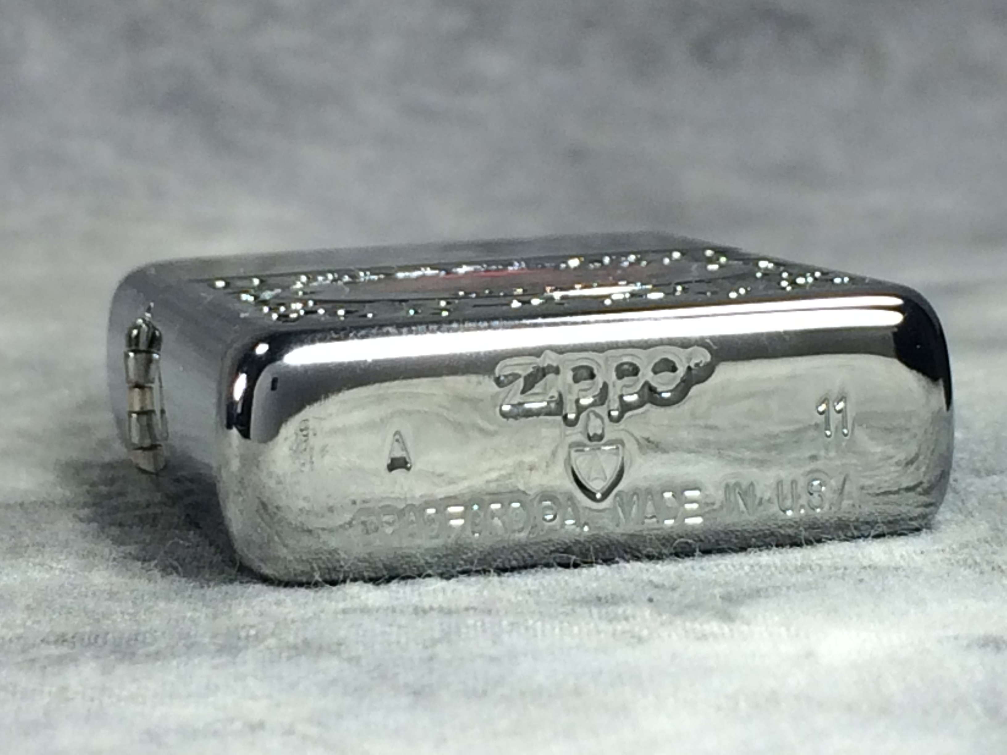 October 28, 2025 - ZIPPO Lighter, circa 2011. Polished chrome finish over solid Brass. Standard size 1-7/16 inches wide by 2-1/4 inches high. Bottom of lighter reads: A Zippo 11 Bradford, PA. Made in U.S.A.