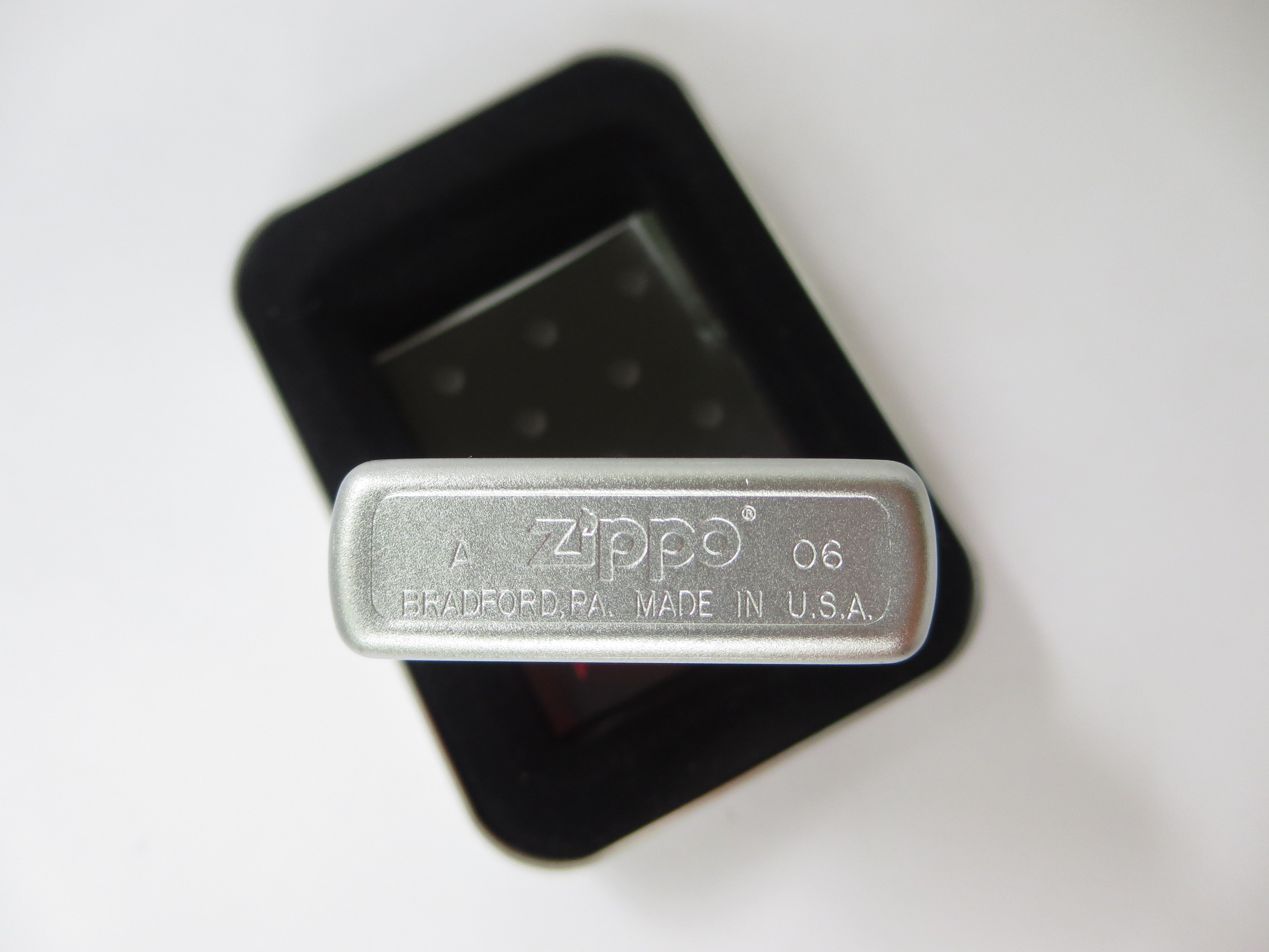 October 27, 2025 - ZIPPO Texas Hold'em lighter circa 2006. Satin Chrome finish over solid Brass. Standard size 1-7/16 inches wide by 2-1/4 inches high. Bottom of lighter reads: A Zippo 06 Bradford, PA. Made in U.S.A. Includes original, unfired insert.