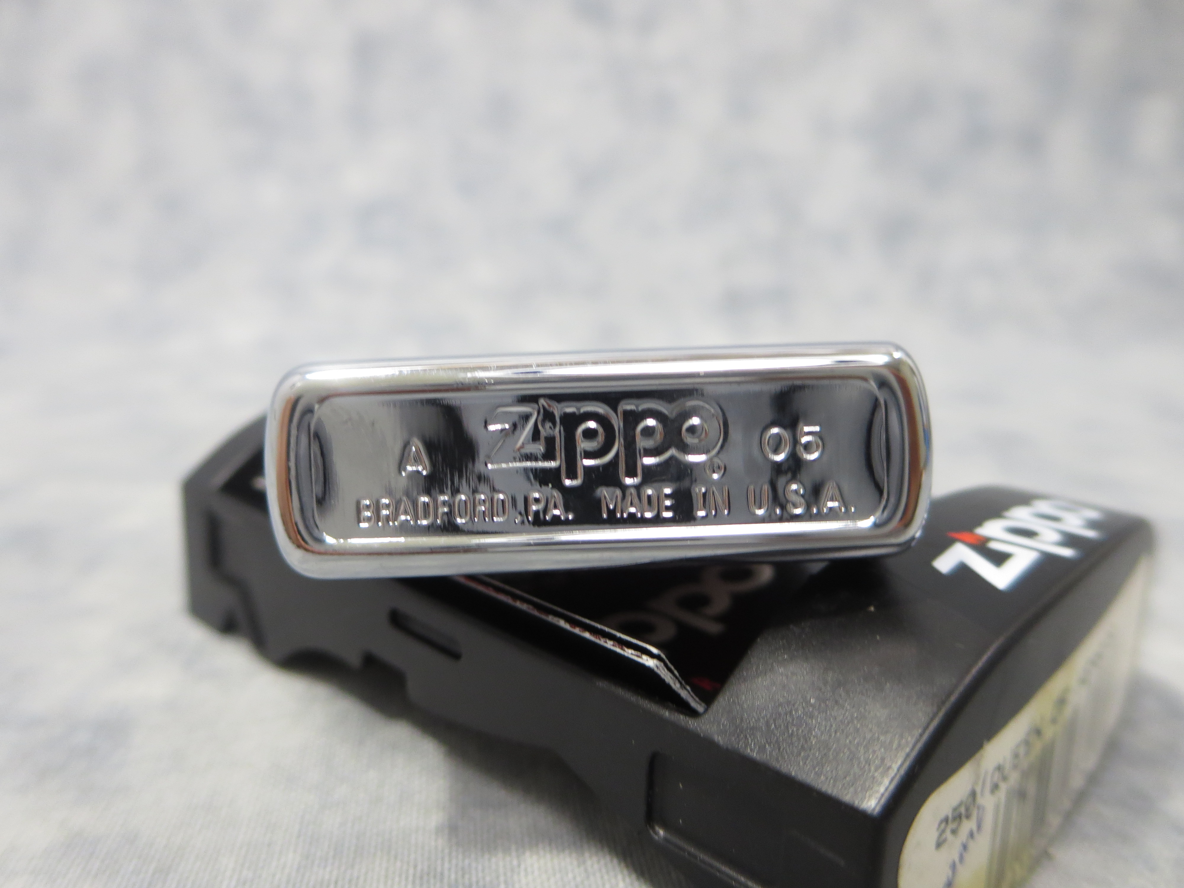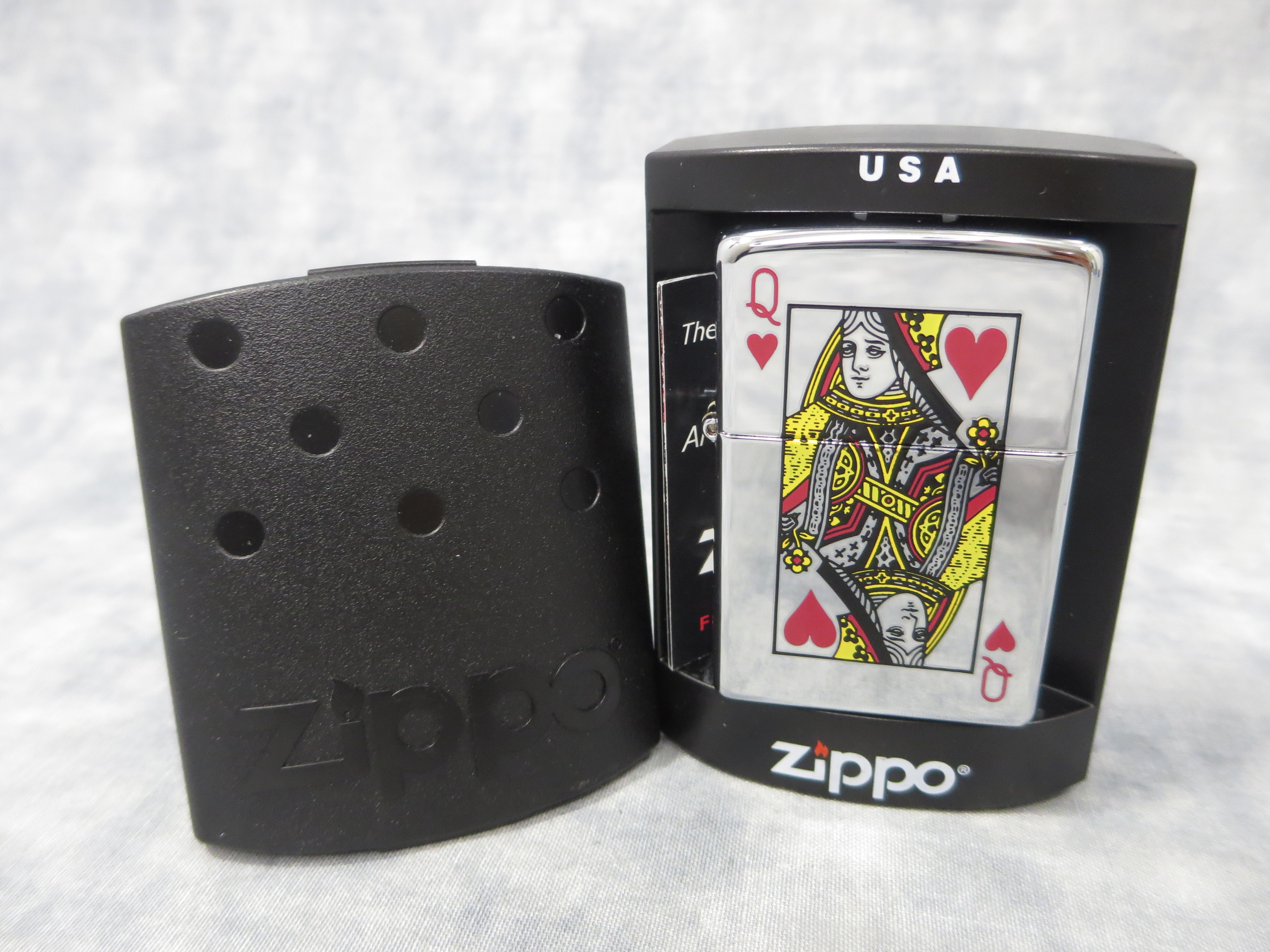 December 25, 2025 - ZIPPO Queen of Hearts Lighter circa 2005. Polished Chrome finish over solid Brass with color printed front design. Standard size 1-7/16 inches wide by 2-1/4 inches high. Bottom of lighter reads: A Zippo 05 Bradford, PA. Made in U.S.A. Includes original, unfired insert.