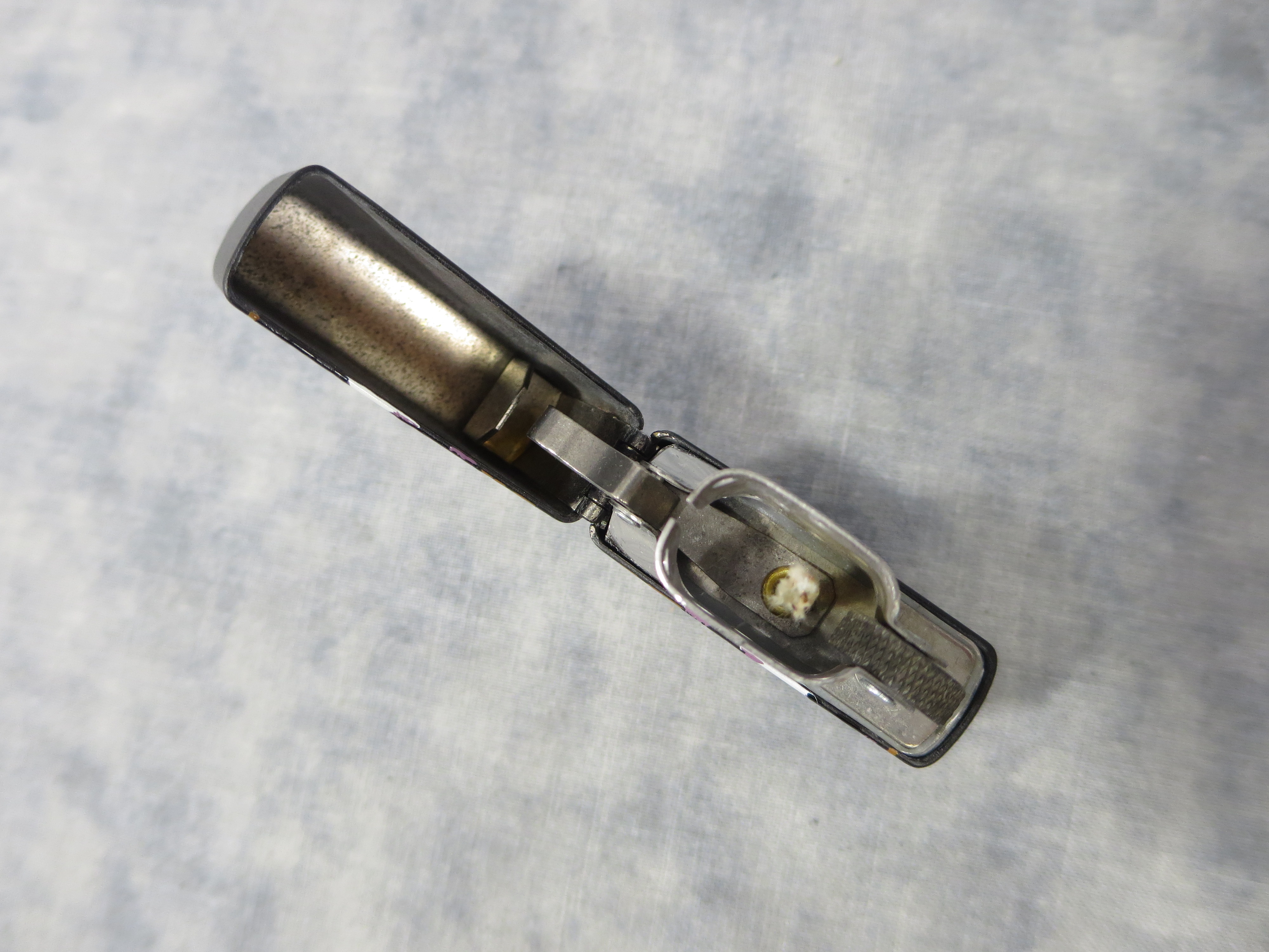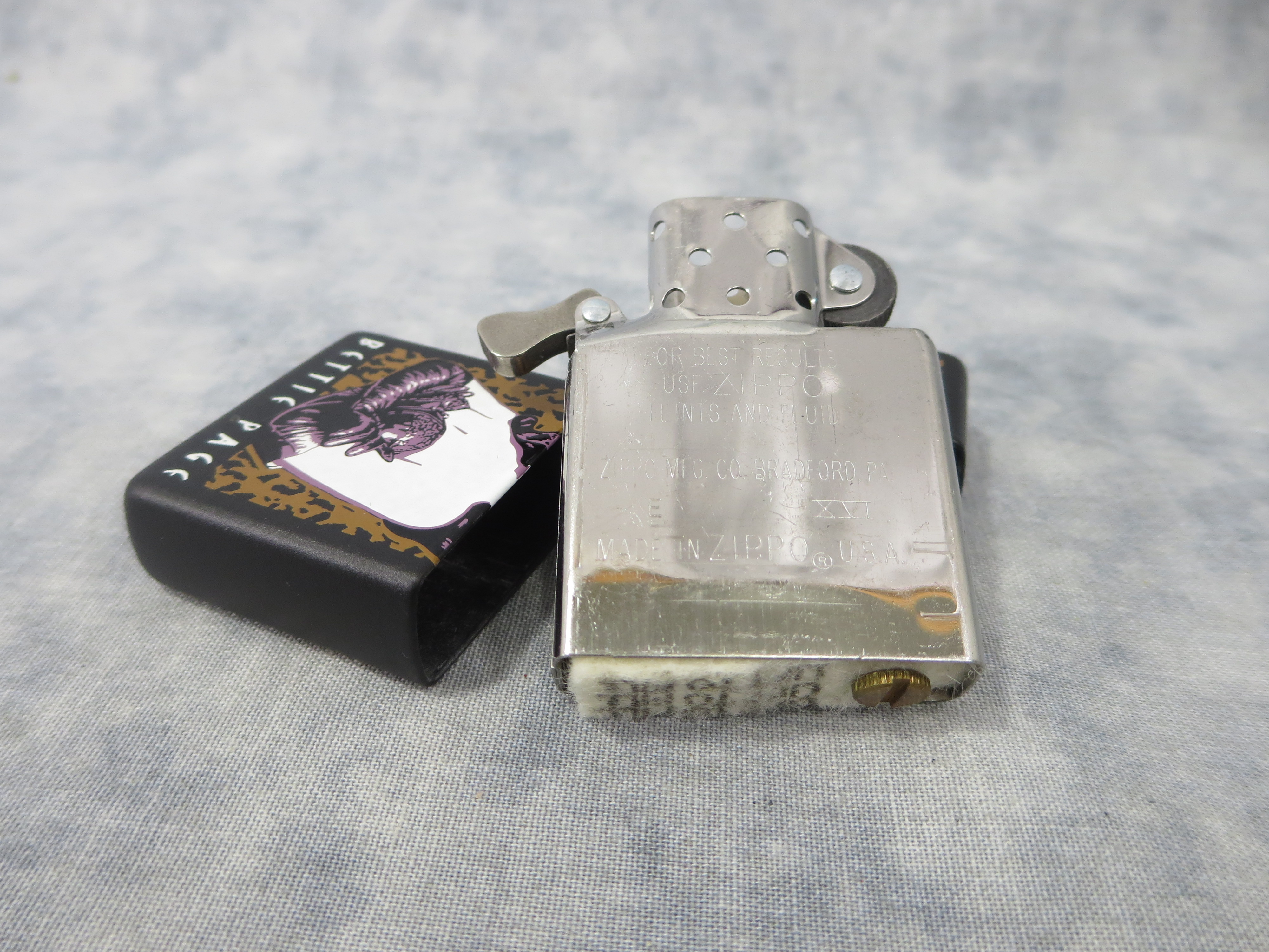 October 27, 2025 - ZIPPO Bettie Page Lighter manufactured in 2000. Limited Edition. Black Matte finish over Solid Brass with color printed front design. Standard size 1-7/16 inches wide by 2-1/4 inches high. Bottom of lighter reads: Zippo E XVI Bradford, PA. Made in U.S.A. Set includes display box, keepsake trading card, and lighter with original, unfired insert.