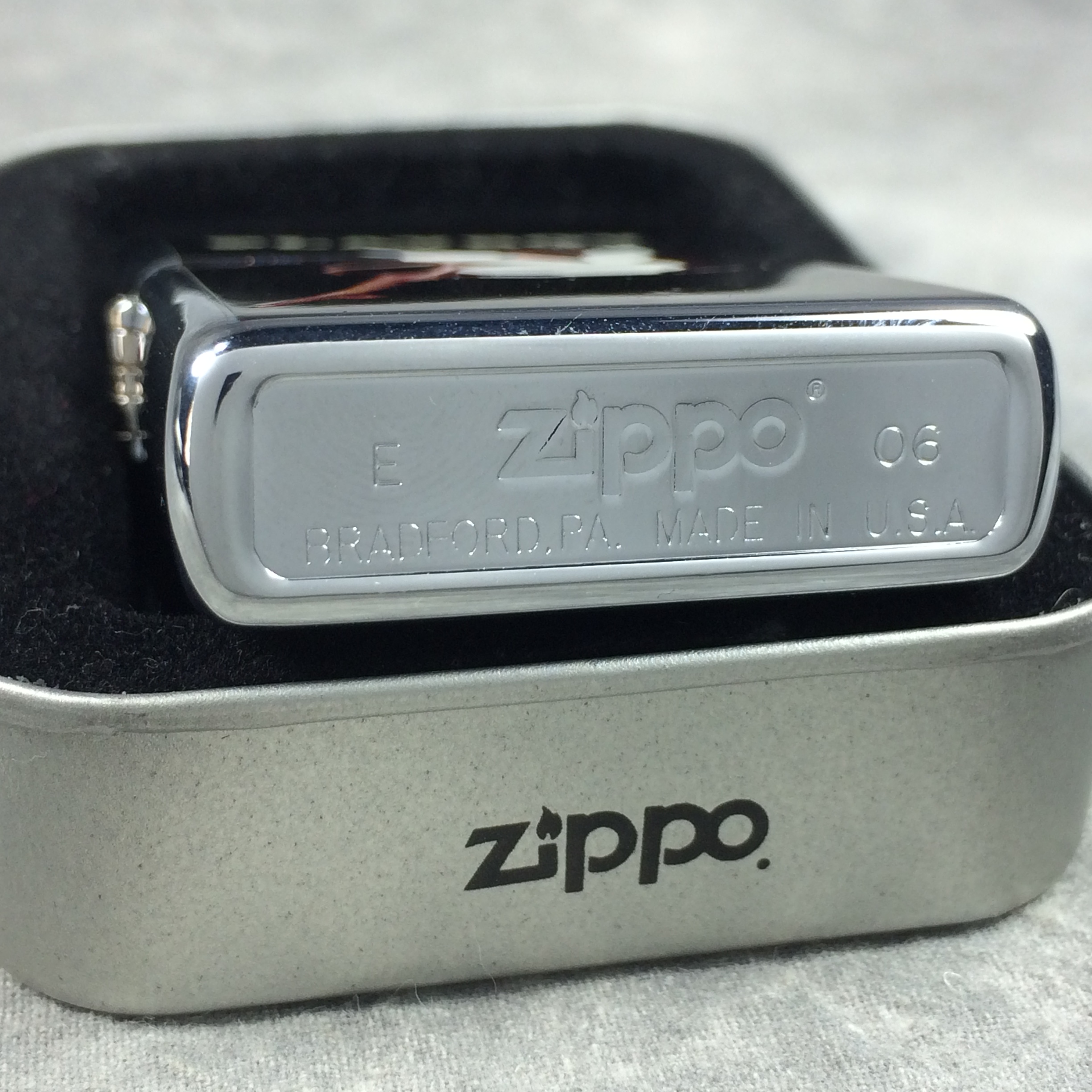 April 03, 2026 - ZIPPO Lighter, 2006. Polished Chrome finish over solid Brass. Standard size 1-7/16 inches wide by 2-1/4 inches high. Bottom of lighter reads: E Zippo 06 Bradford, PA. Made in U.S.A.