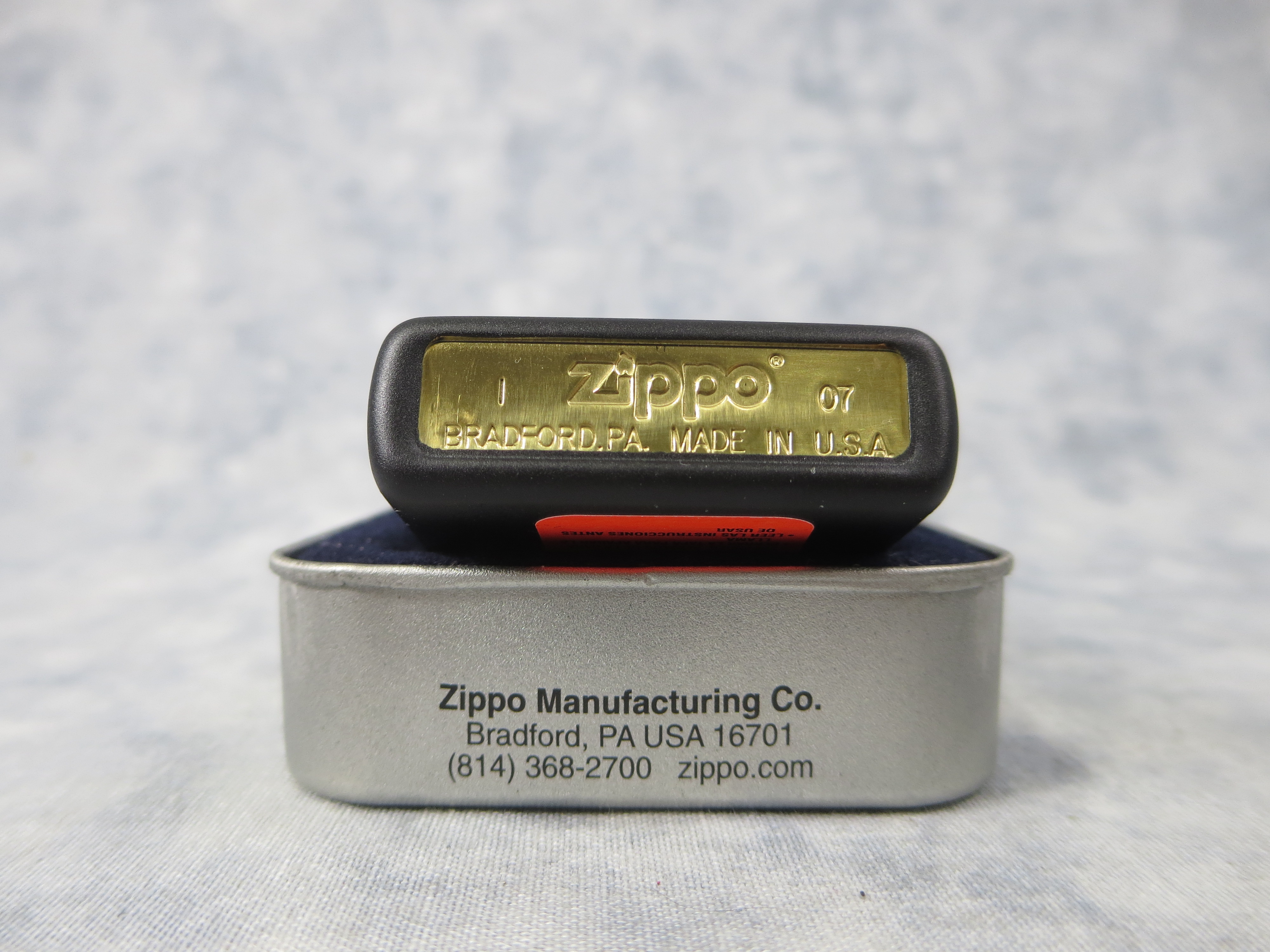 December 19, 2025 - ZIPPO AC/DC Back In Black Lighter manufactured in 2007. Black Matte finish over solid Brass with color printed design on front. Standard size 1-7/16 inches wide by 2-1/4 inches high. Bottom of lighter reads: I Zippo 07 Bradford, PA. Made in U.S.A. Includes original, unfired insert.