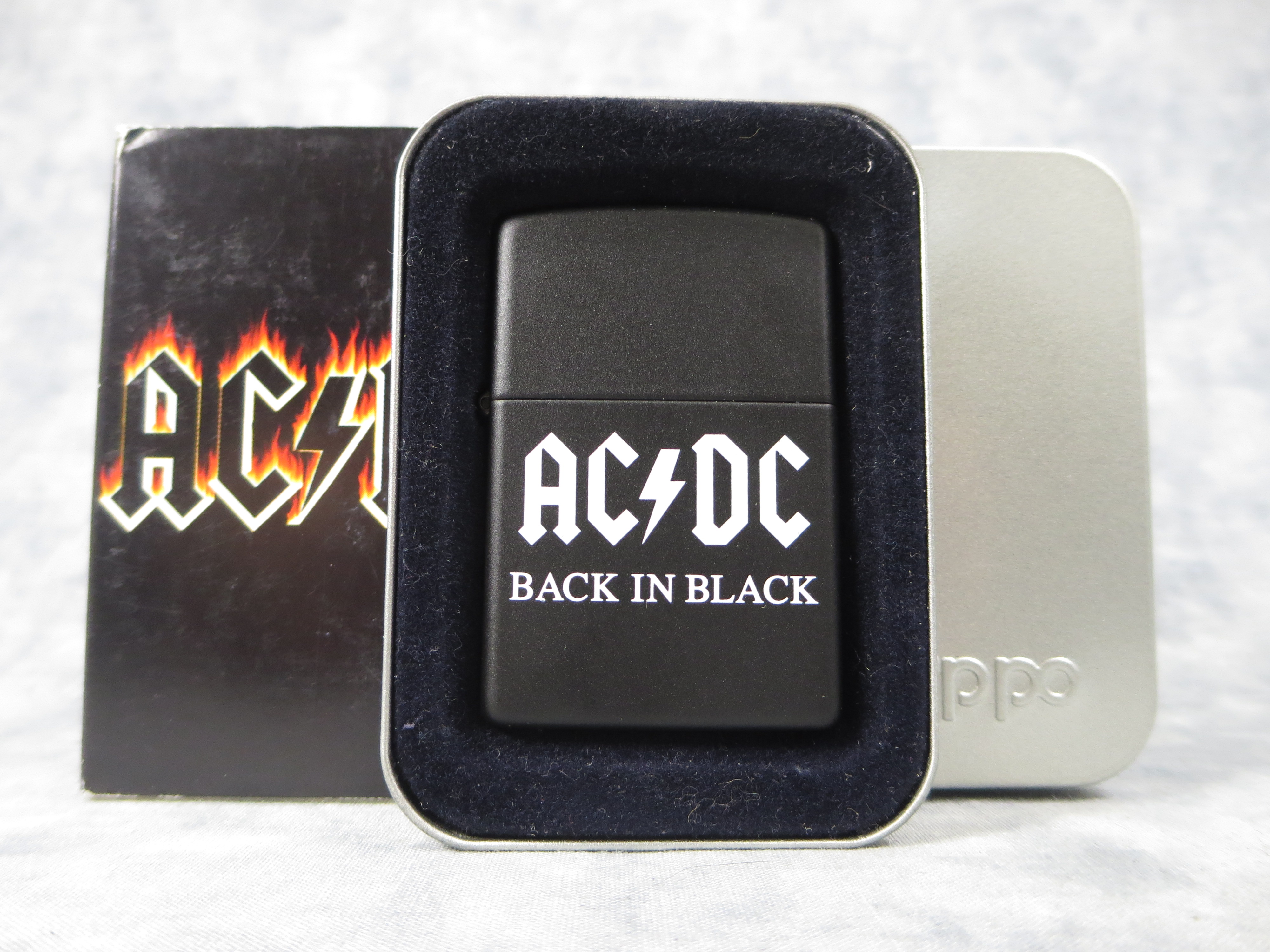 You have: AC/DC BACK IN BLACK Black Matte Lighter (Zippo, 24279, 2007)