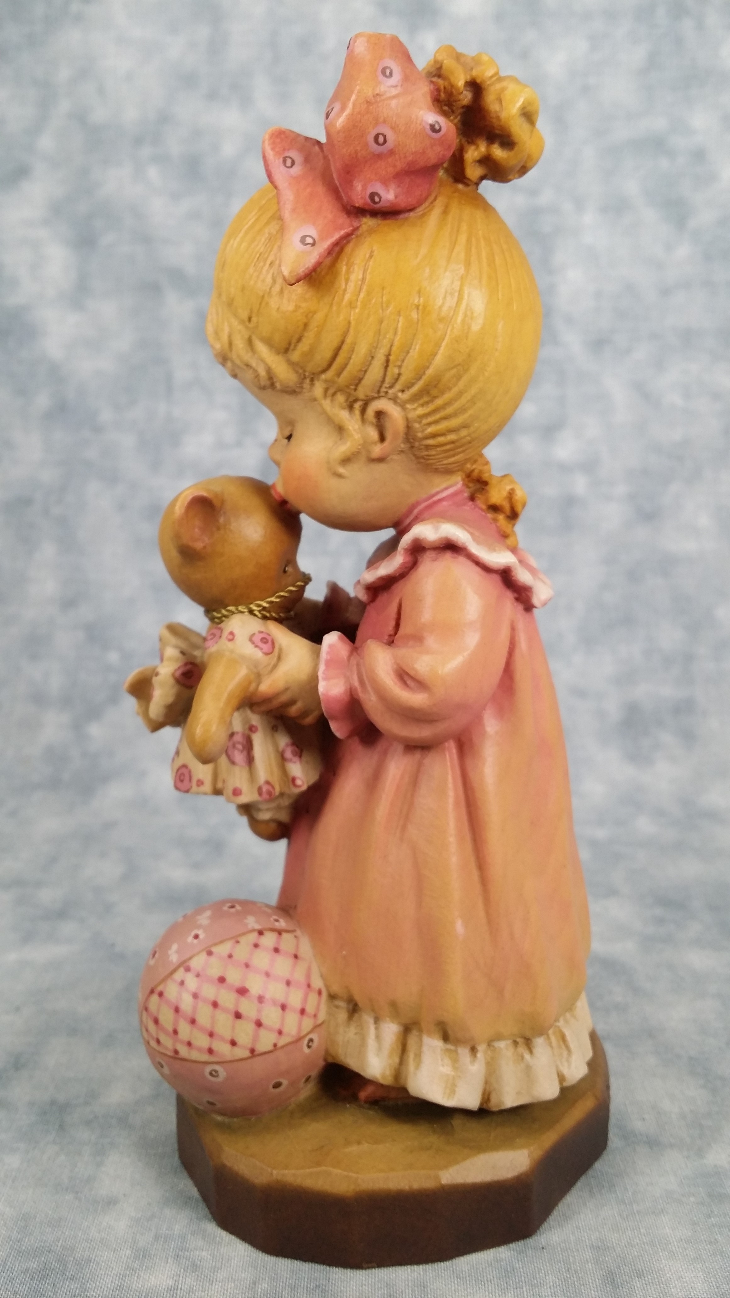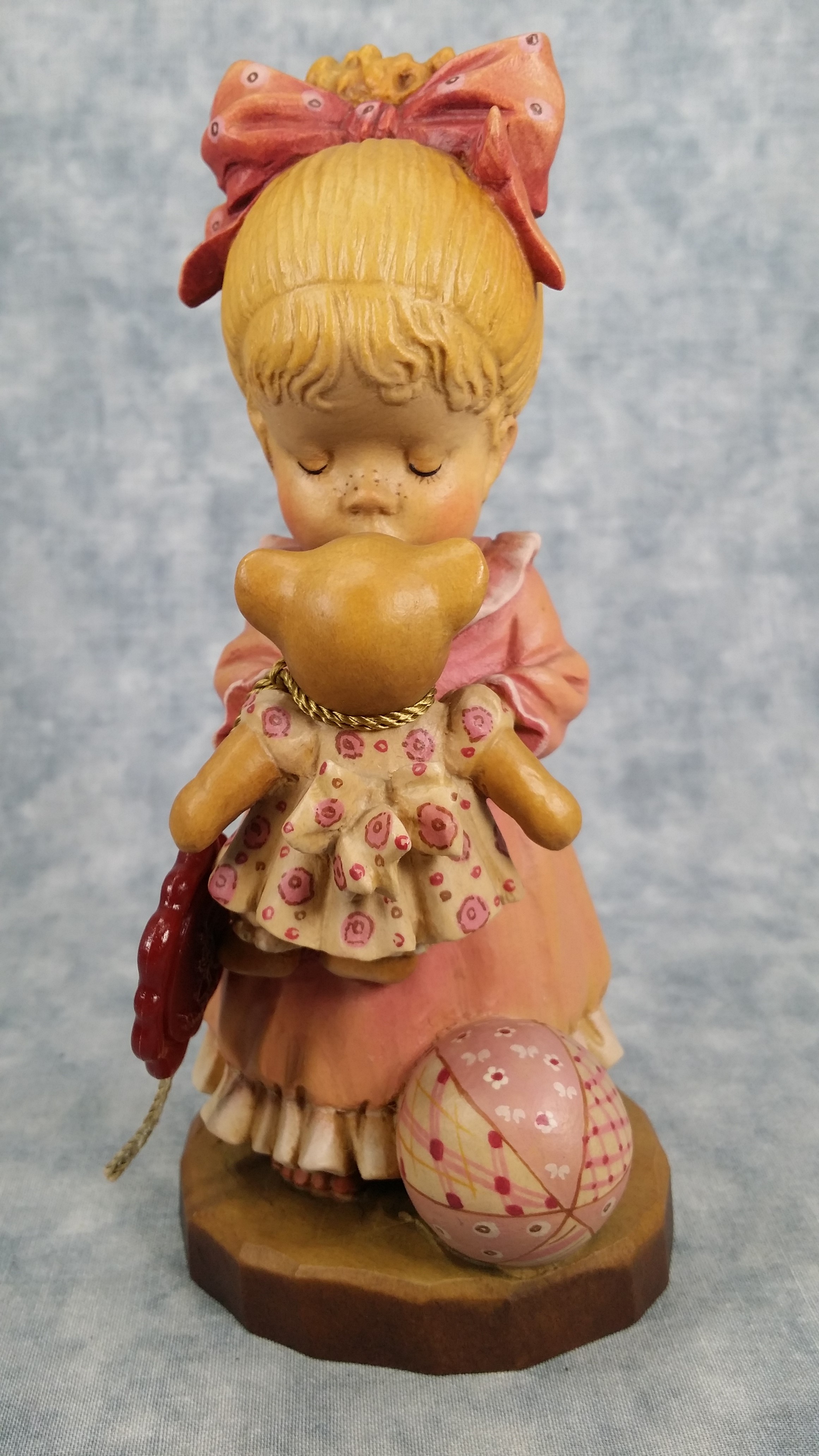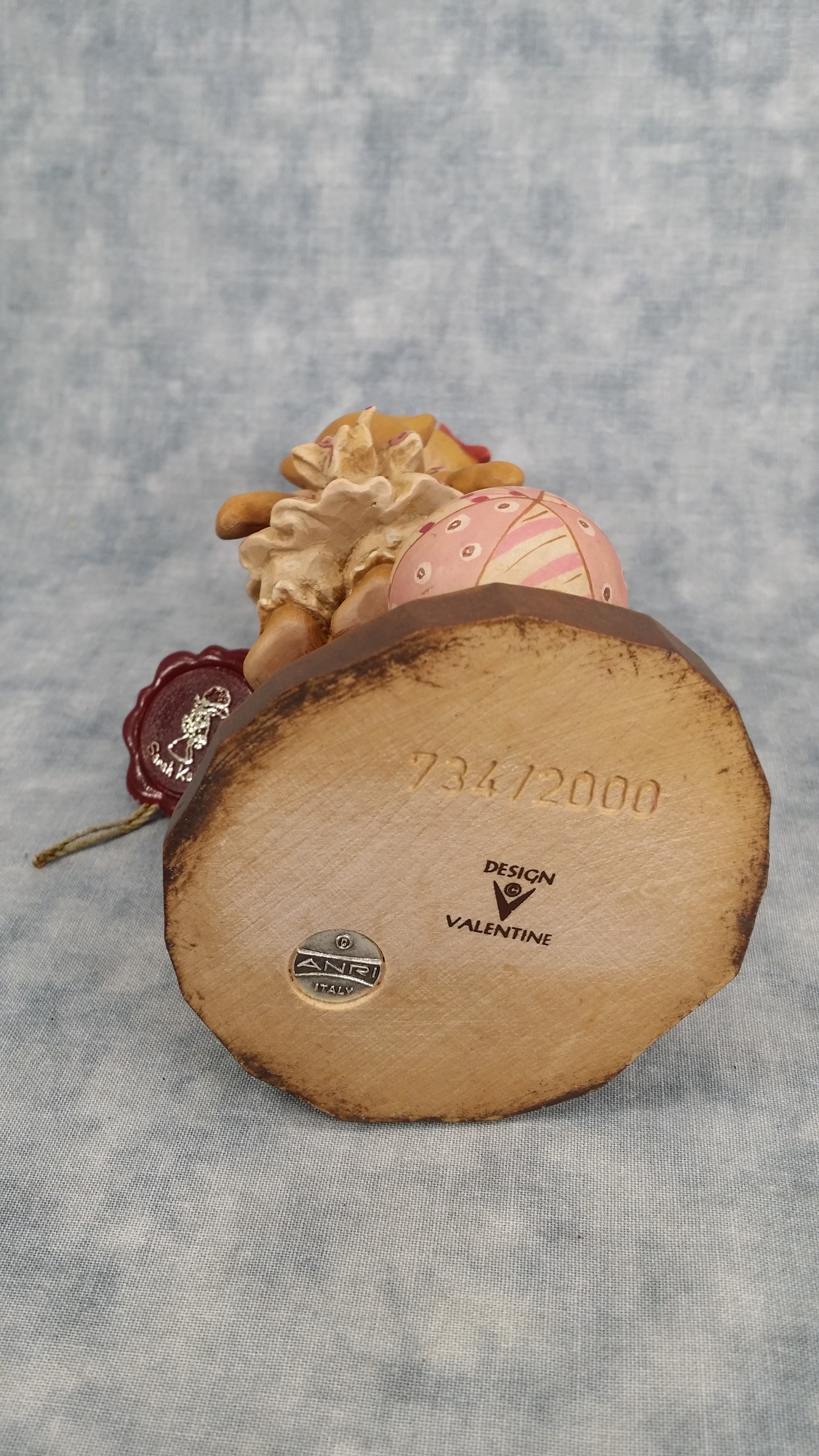 January 18, 2026 - Exact size: 6-7/8 inches tall. Sarah Kay Collection, Design Valentine. Bottom of base is stamped "Design Valentine" and incised with the limited edition number: xxxx/2000. Side of base is incised with the "Sarah Kay" signature. Anri medal disk trademark (used from 1982-1988) is present on bottom of base as a mark of origin and genuinity. Made in Italy.