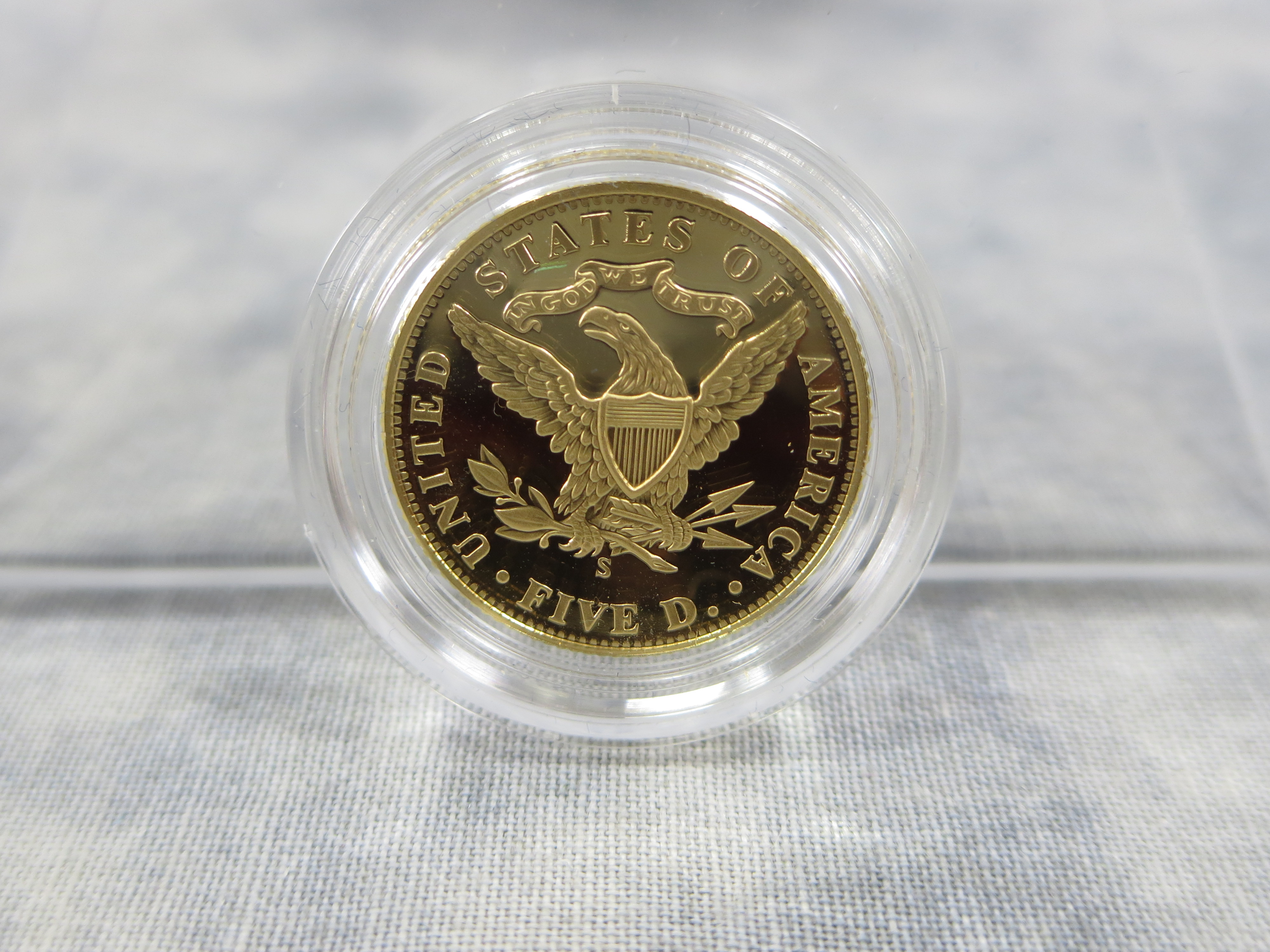 November 04, 2025 - San Francisco Mint. Includes gold $5 proof, 8.359 grams 90% fine gold, mintage 100,000, in original US Mint box, slipcase, velvet-lined coin holder, and certificate of authenticity.