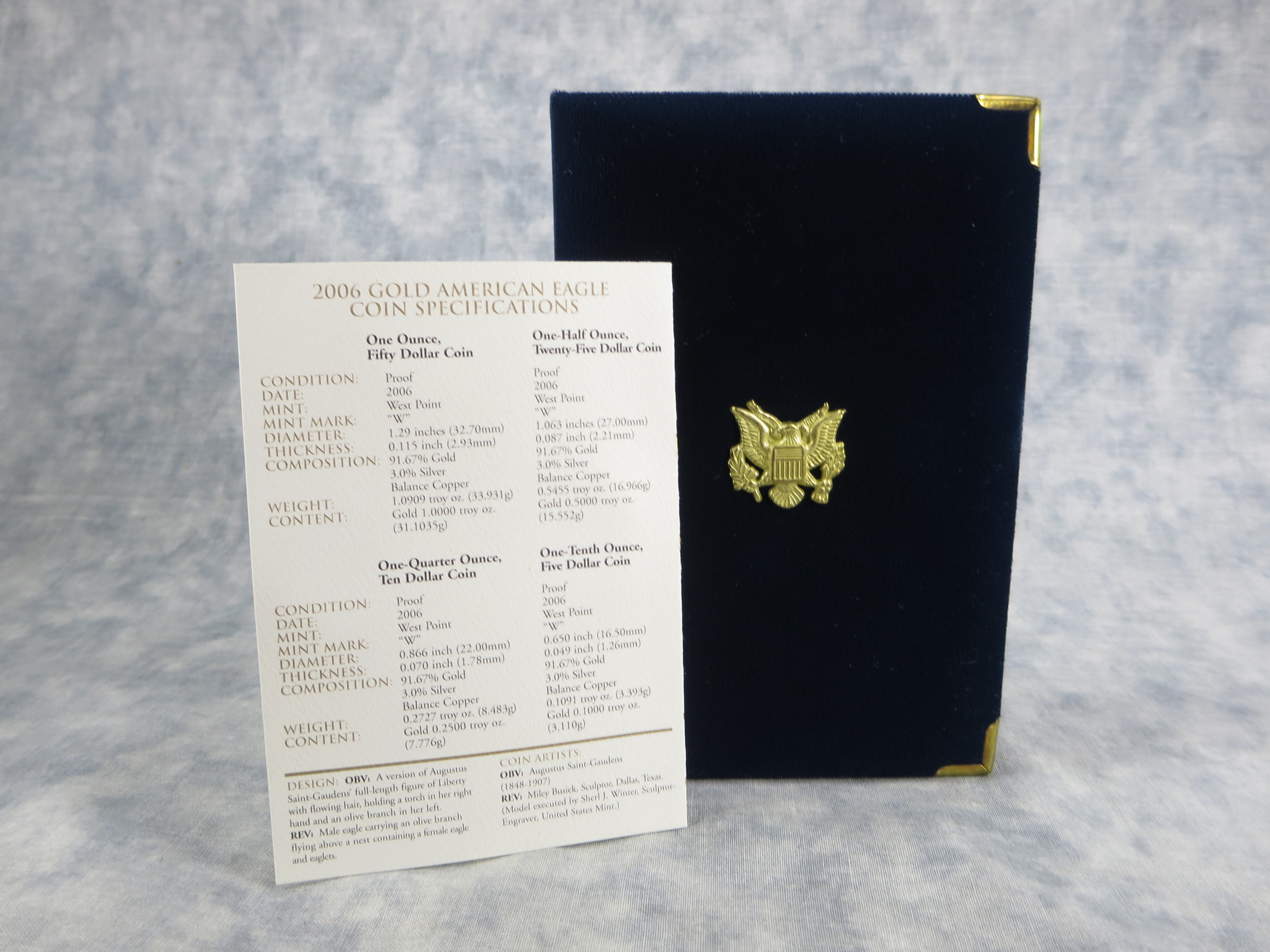 $50 One Ounce American Gold Eagle Proof coin. West Point mint. 1.287 inch diameter. 33.931 grams .9167 fine Gold.