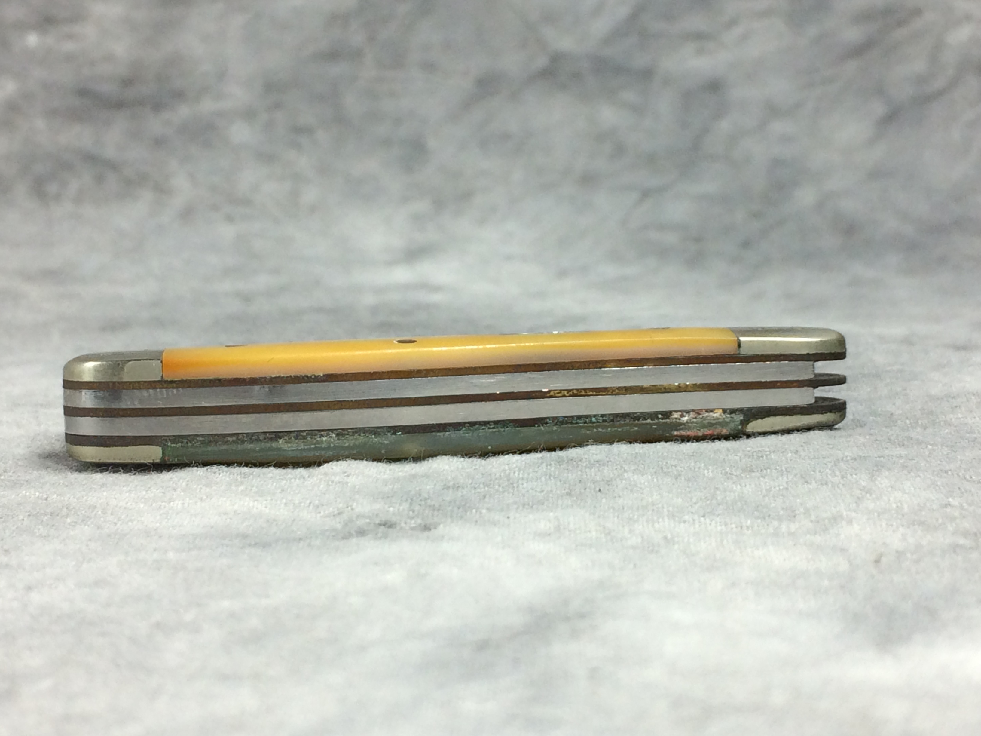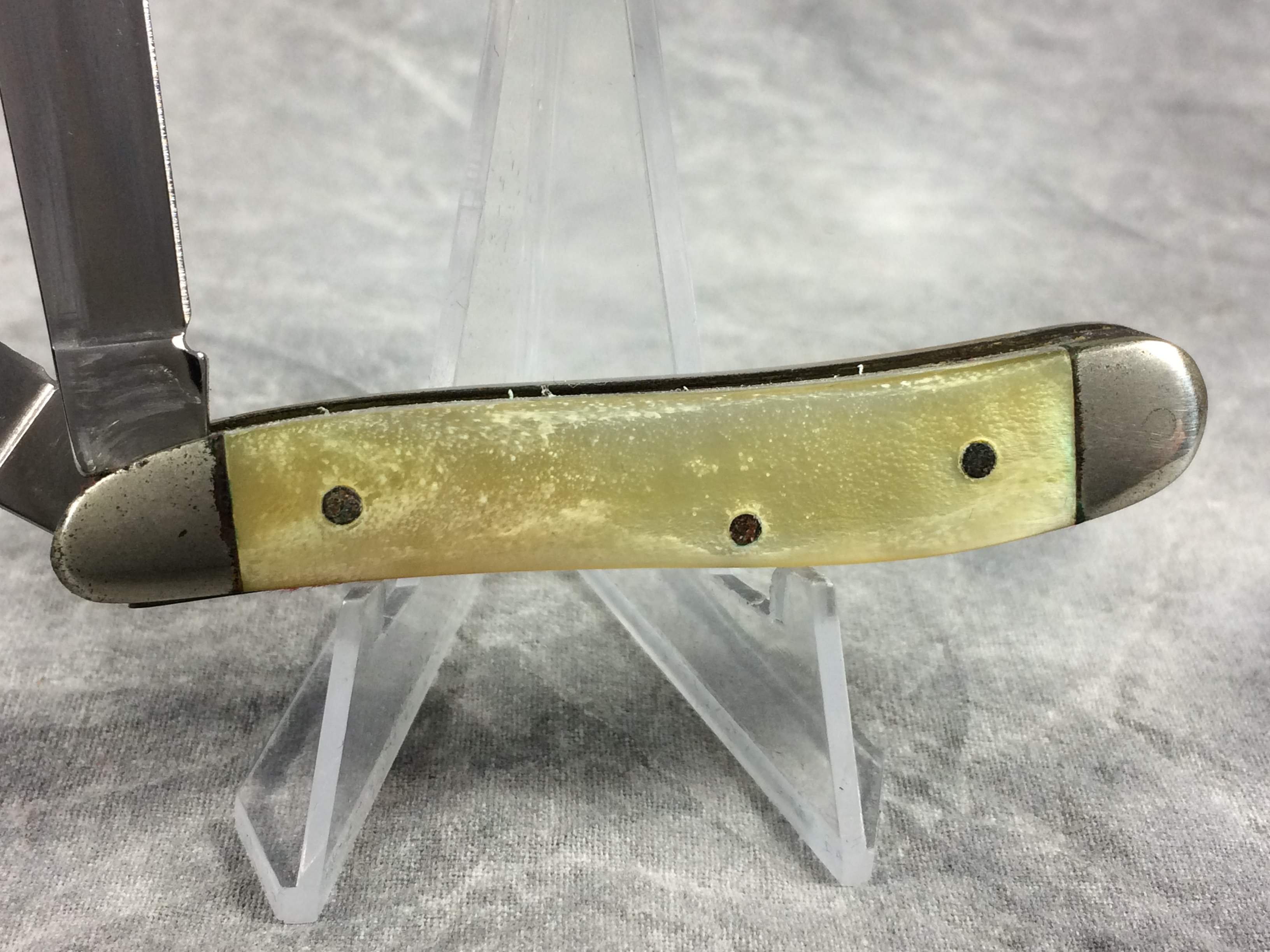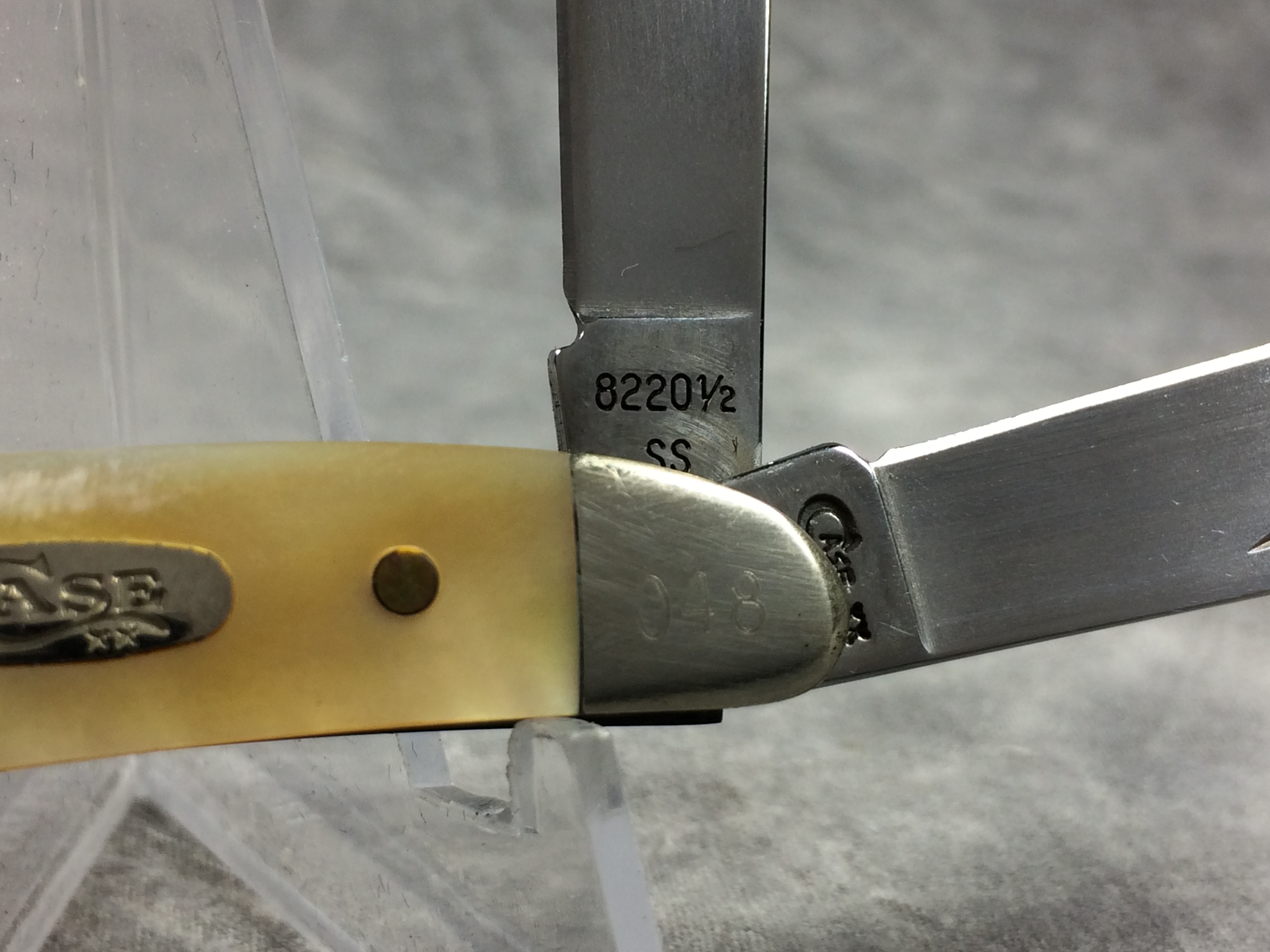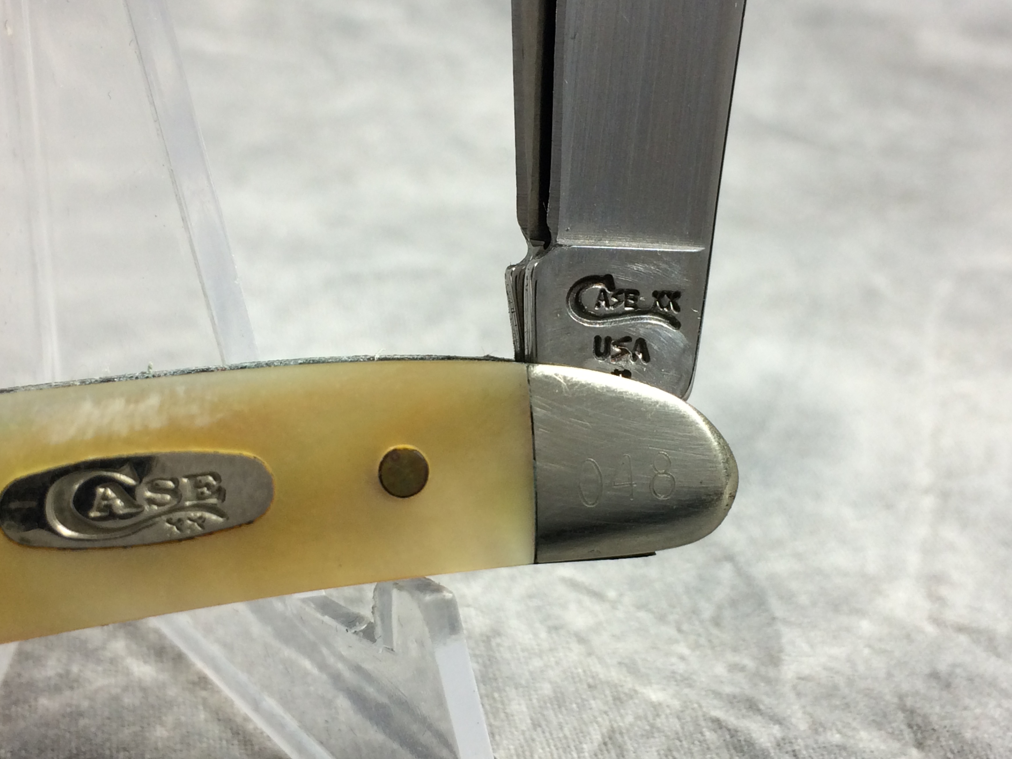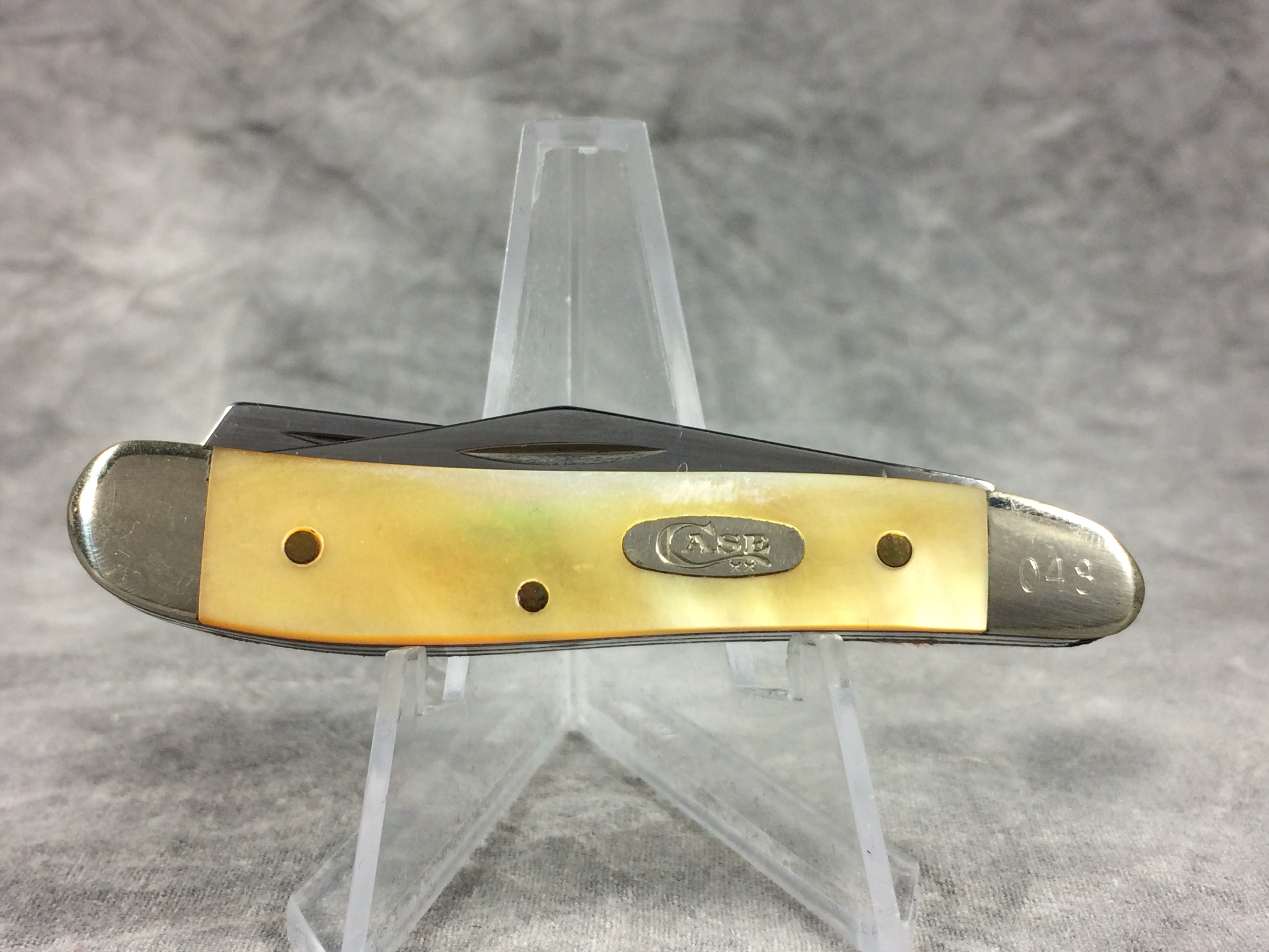 January 08, 2026 - 2-3/4 inches closed. 4-3/4 inches open. Made in USA. " CASE XX USA **  " (2 dot with lightning bolt S) and " 8220-1/2 SS" tang stamps. Stainless Steel blades. Gold Mother of Pearl handles. Oval long-C CASE XX shield. Nickel Silver bolsters. Front right bolster etched with serial. Brass liner.
