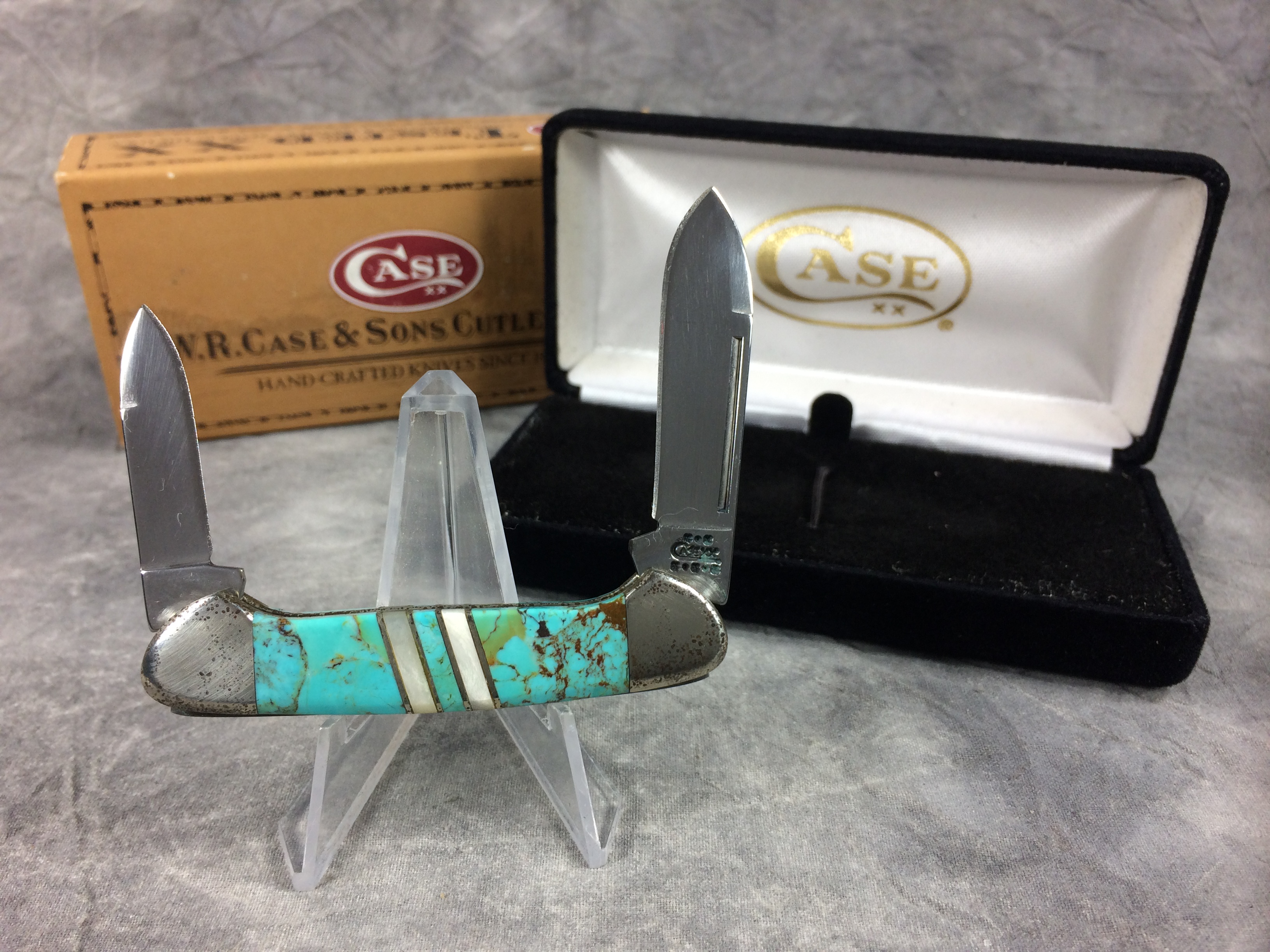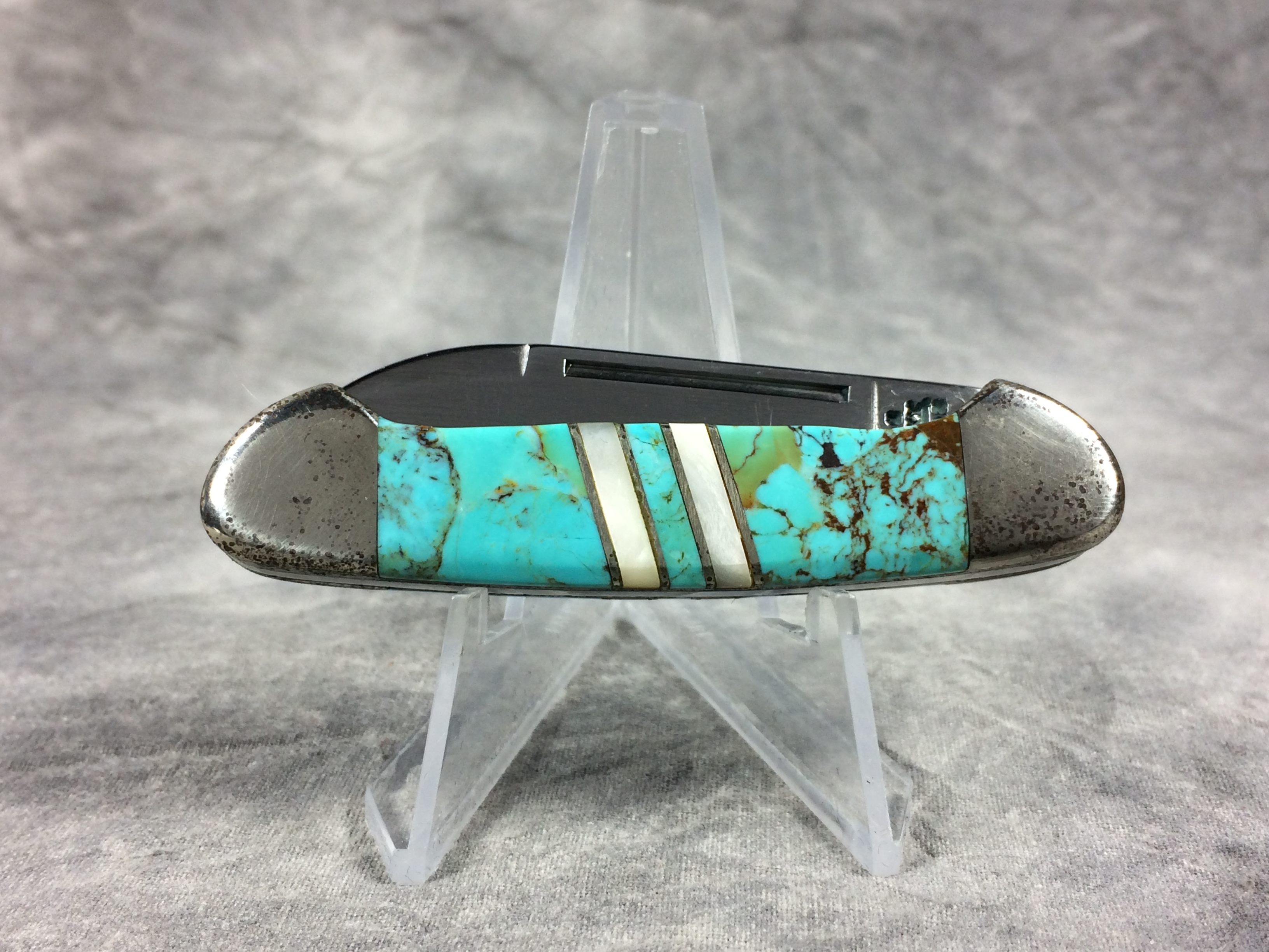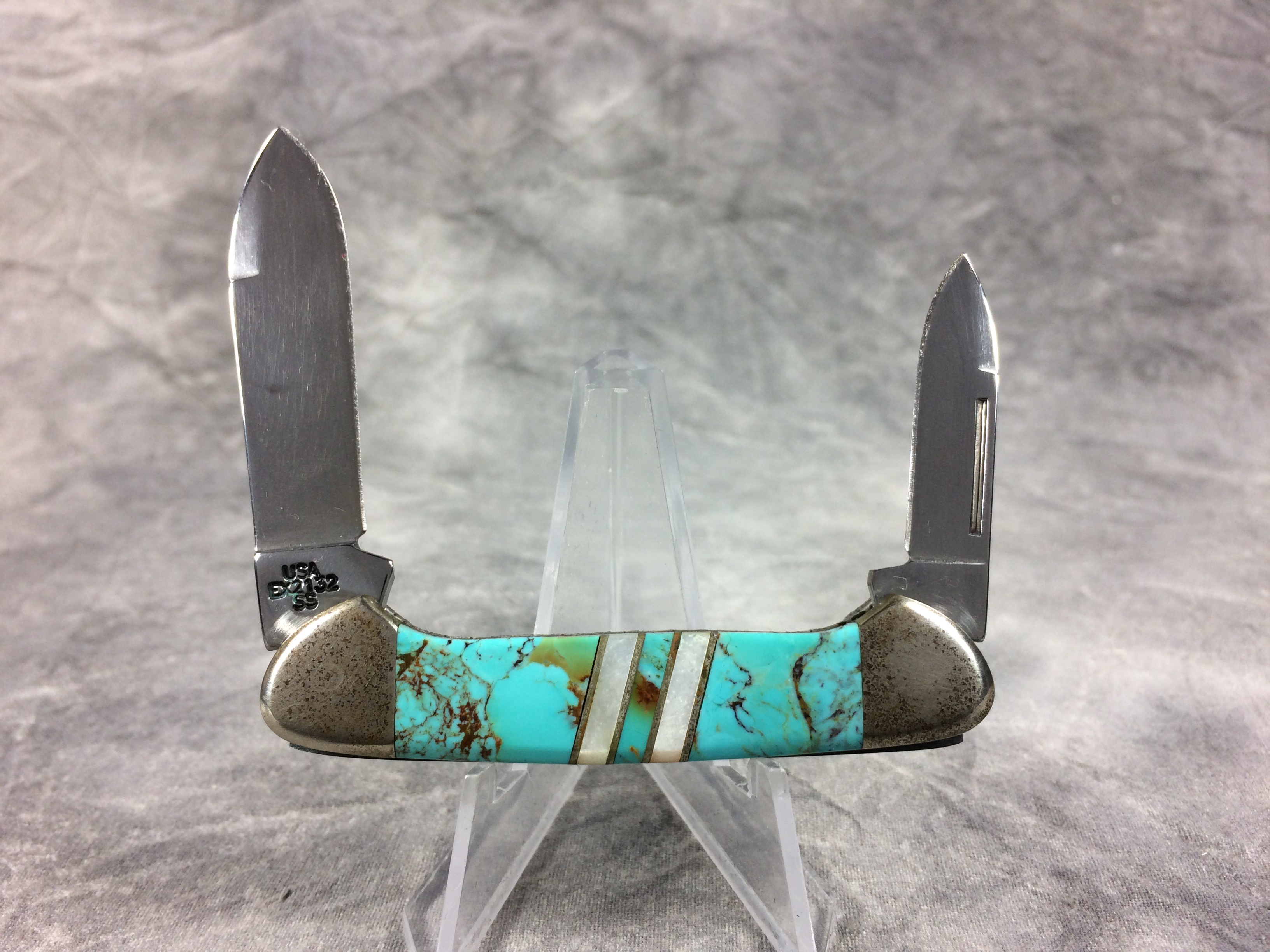December 07, 2025 - 2-3/4 inches closed. 4-5/8 inches open. Made in USA. "  x*x  Case XX x*x*x " and "USA EX2132 SS" tang stamps. No shield. Stainless steel blades. Turquoise handles with mother of pearl inlays. Nickel silver bolsters. Brass liner.