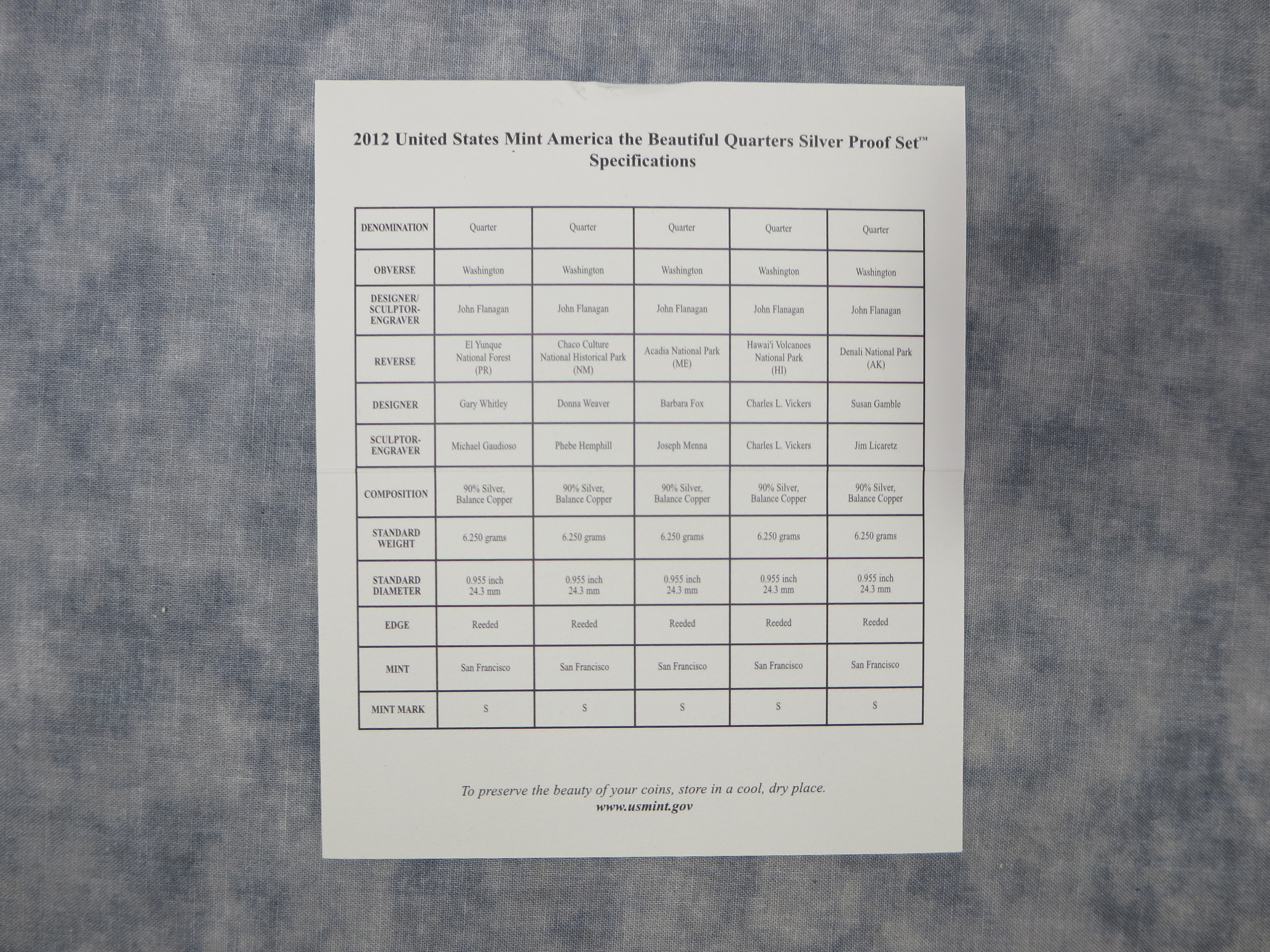 April 23, 2026 - San Francisco Mint. The five 90% silver quarters in this set are El Yunque National Forest, Chaco Culture National Historical Park, Acadia National Park, Hawai'i Volcanoes national Park and Denali National Park. All are housed in the original U.S. Mint plastic case and contained in U.S. Mint box, and including a certificate of authenticity describing the coins.