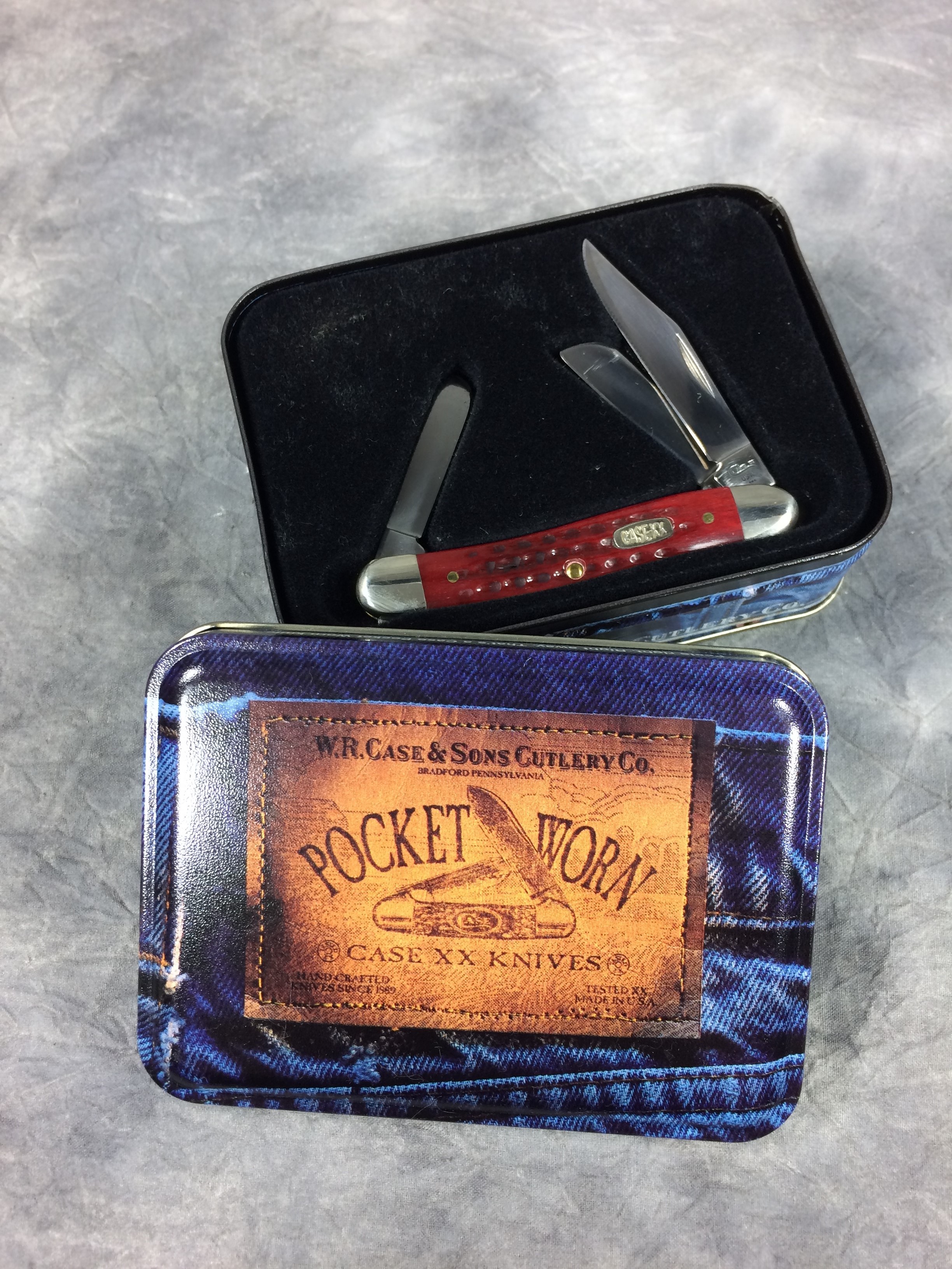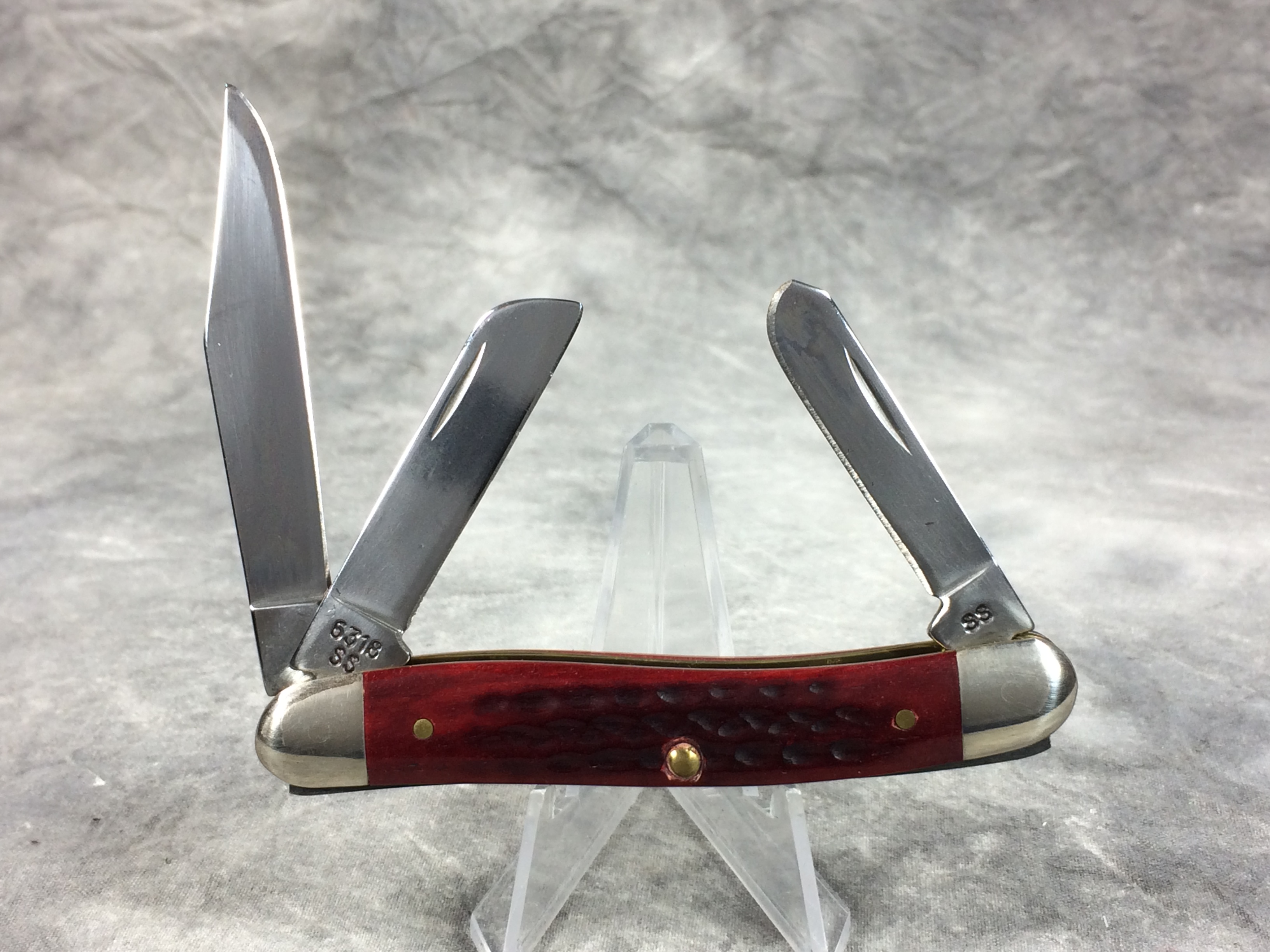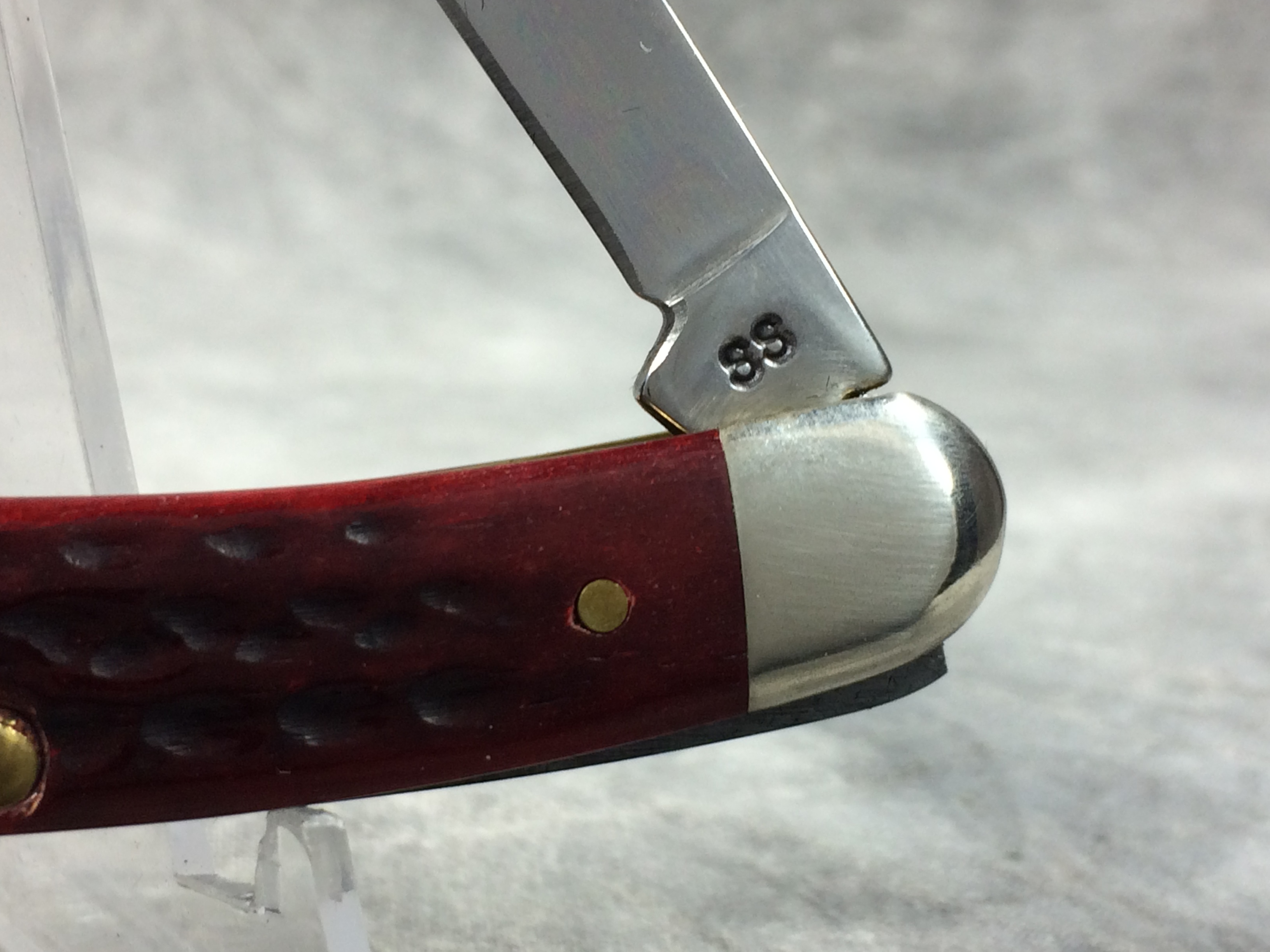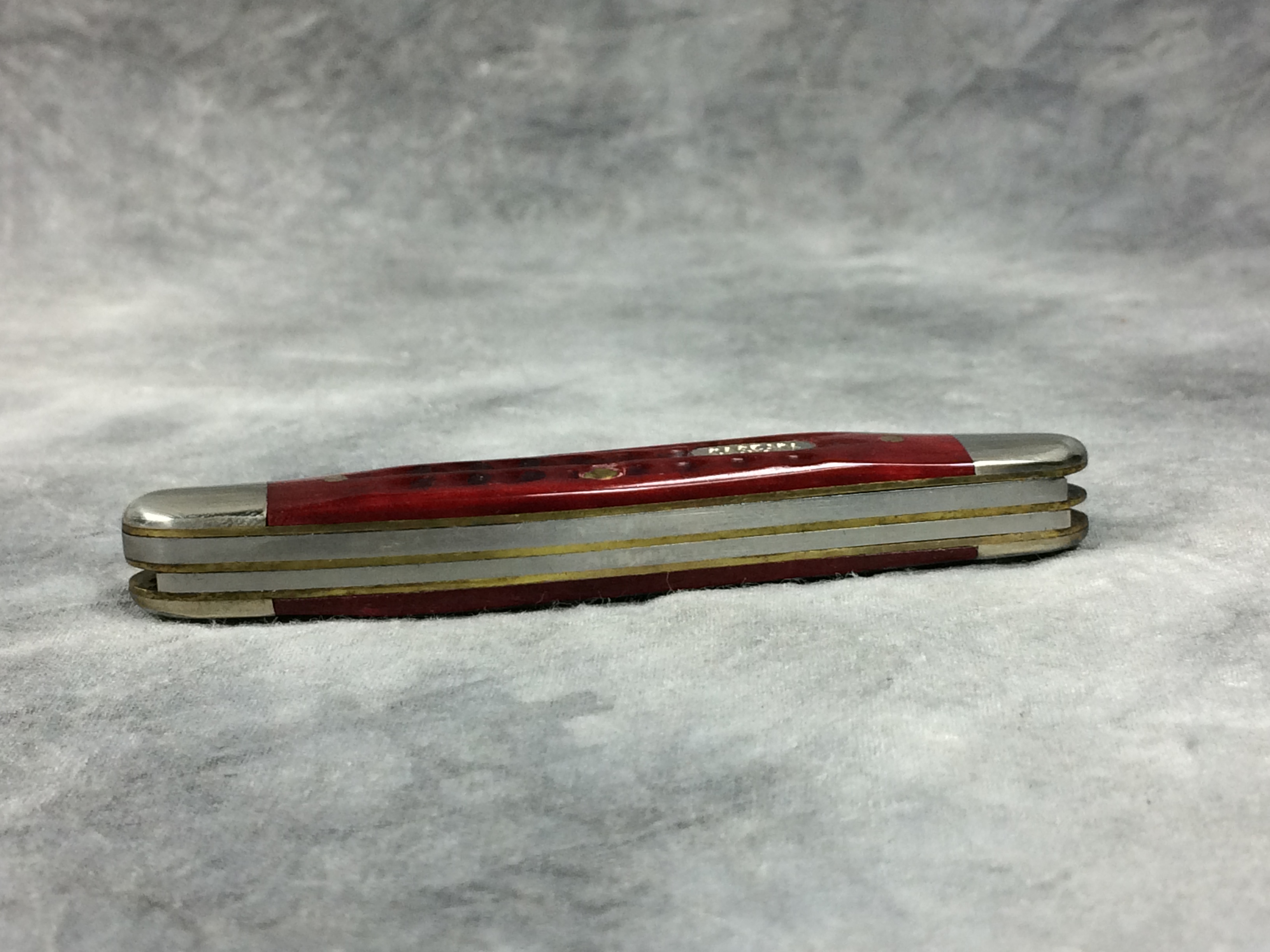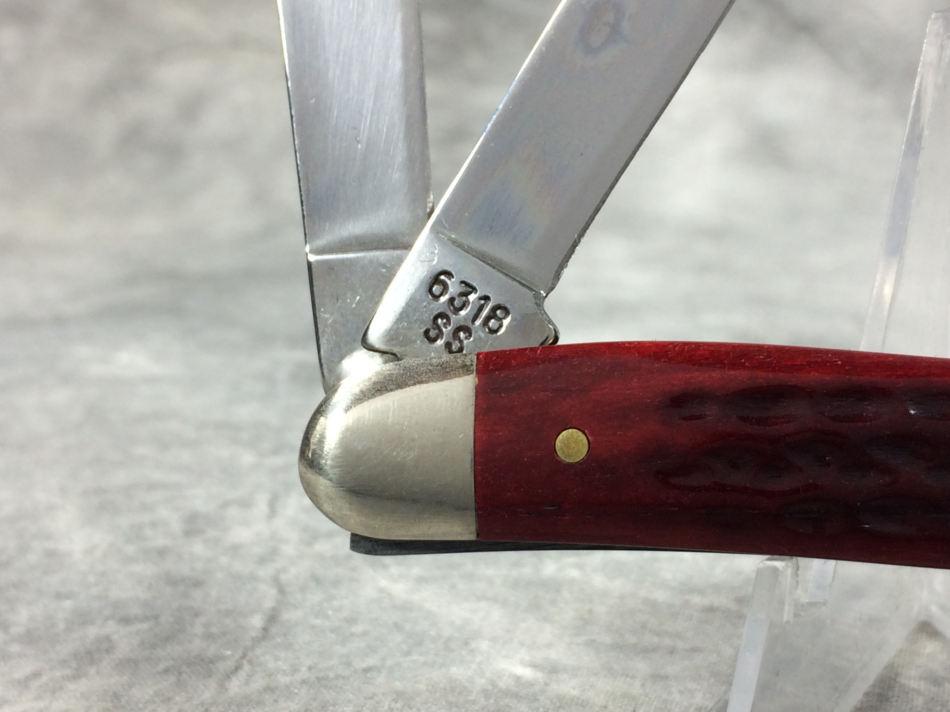 November 03, 2025 - 3-5/8 inches closed. 6-1/8 inches open. Made in USA. "CASE XX USA ***  " (3 dot with lightning bolt S), "SS", and "6318 SS" tang stamps. Oval Closed-C CASE-XX shield. Stainless steel blades. Red Jigged Bone handle. Nickel Silver bolsters. Brass liner.