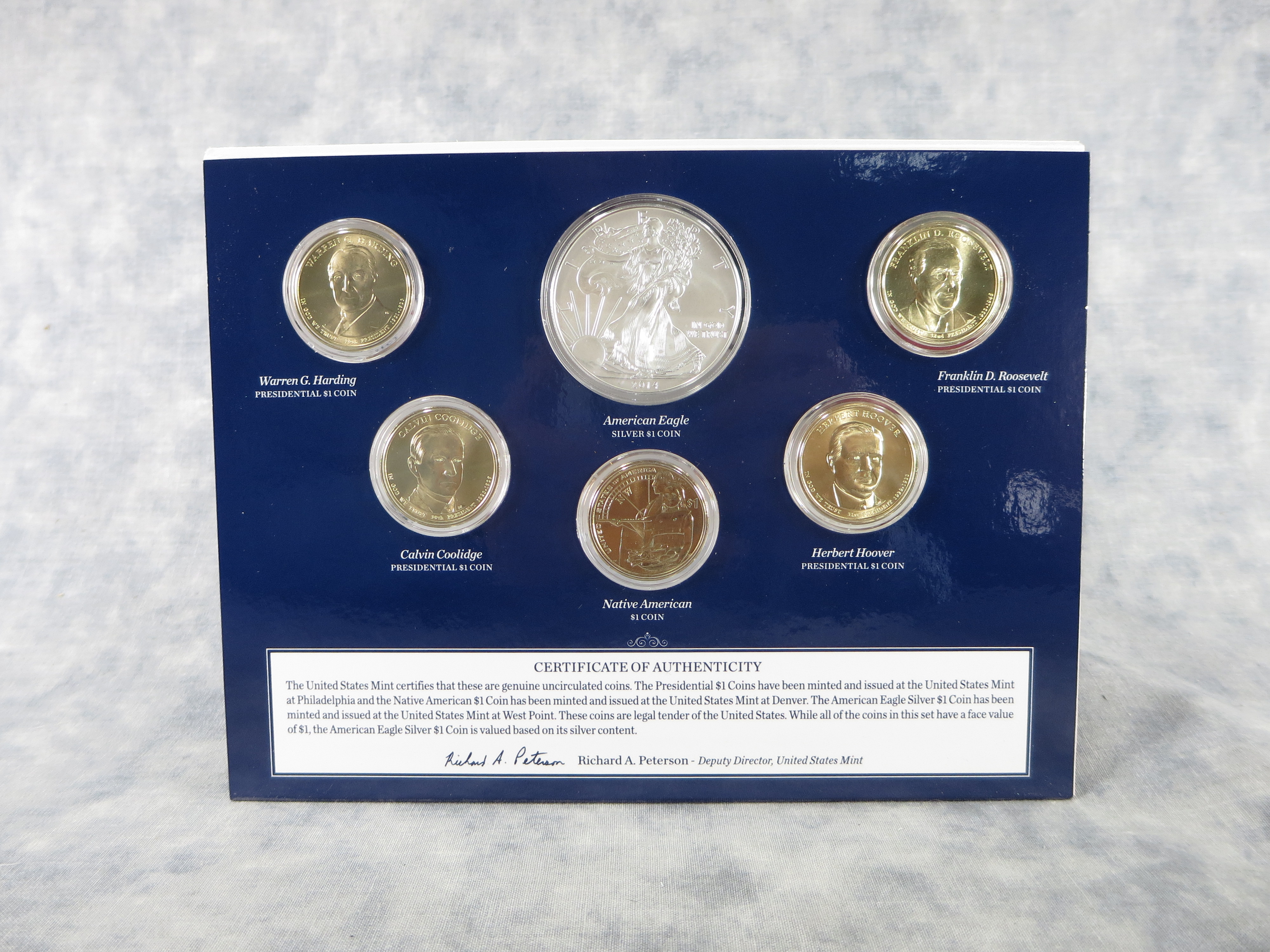 March 23, 2026 - Includes original U.S. Mint display card with attached certificate of authenticity and sleeve. Uncirculated coins include the 99.9% silver American Eagle and 5 clad dollars: Warren Harding, Calvin Coolidge, Herbert Hoover, Franklin Roosevelt and Native American.
