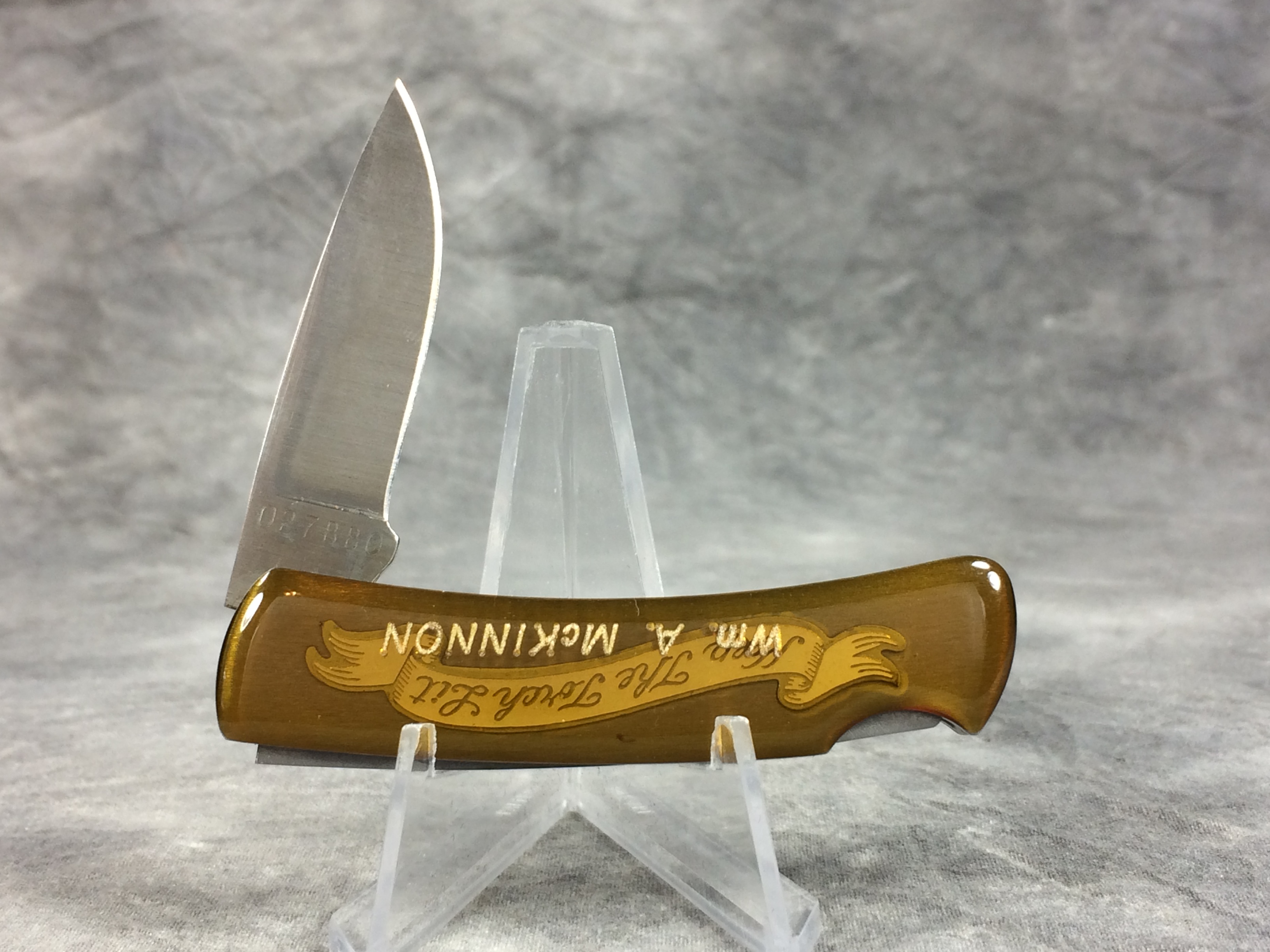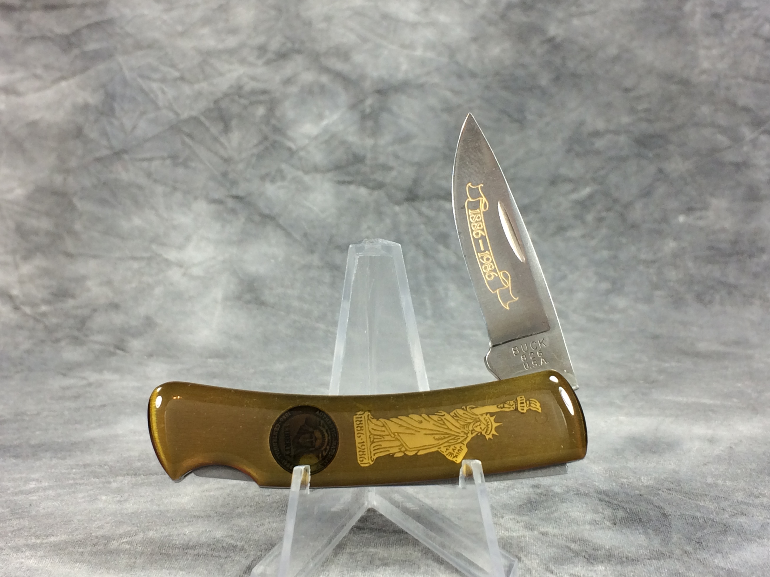 December 22, 2025 - 2-7/8 inches closed. 4-5/8 inches open. Made in USA. "BUCK 826 U.S.A." and serial tang stamps. Stainless Steel blade etched in gold with a banner that reads "1886-1986". Gold colored composite handle features and Statue of Liberty emblem and a copper medallion made from materials taken from the Statue of Liberty. The back handle features a banner that reads "Keep The Torch Lit". Etched with a name on the back handle.