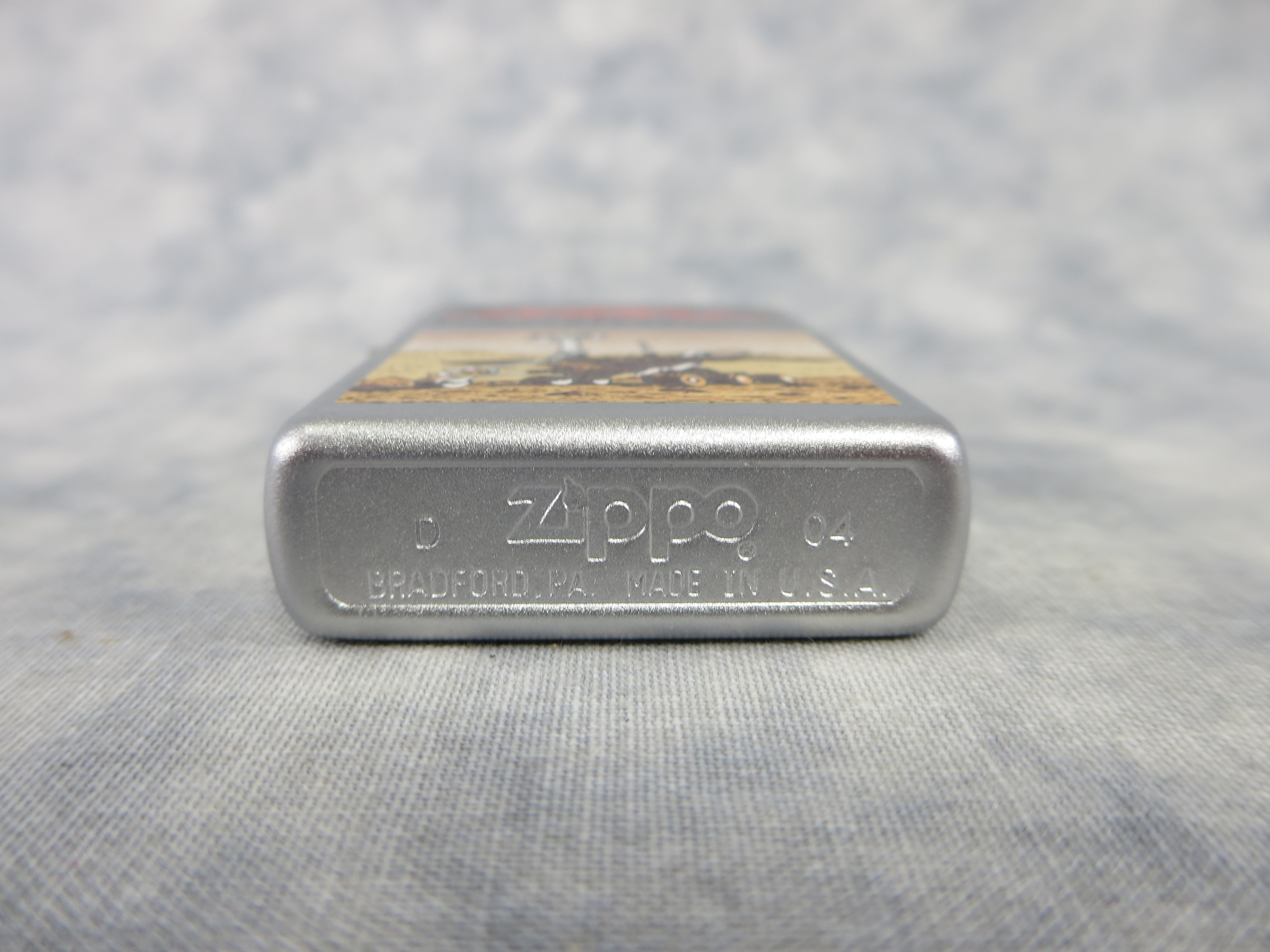 December 28, 2025 - ZIPPO M2K4 lighter manufactured in 2004. Satin Chrome finish over solid Brass with color printed front design. Standard size 1-7/16 inches wide by 2-1/4 inches high. Bottom of lighter reads D Zippo 04 Bradford, PA. Made in U.S.A. Includes original insert.
