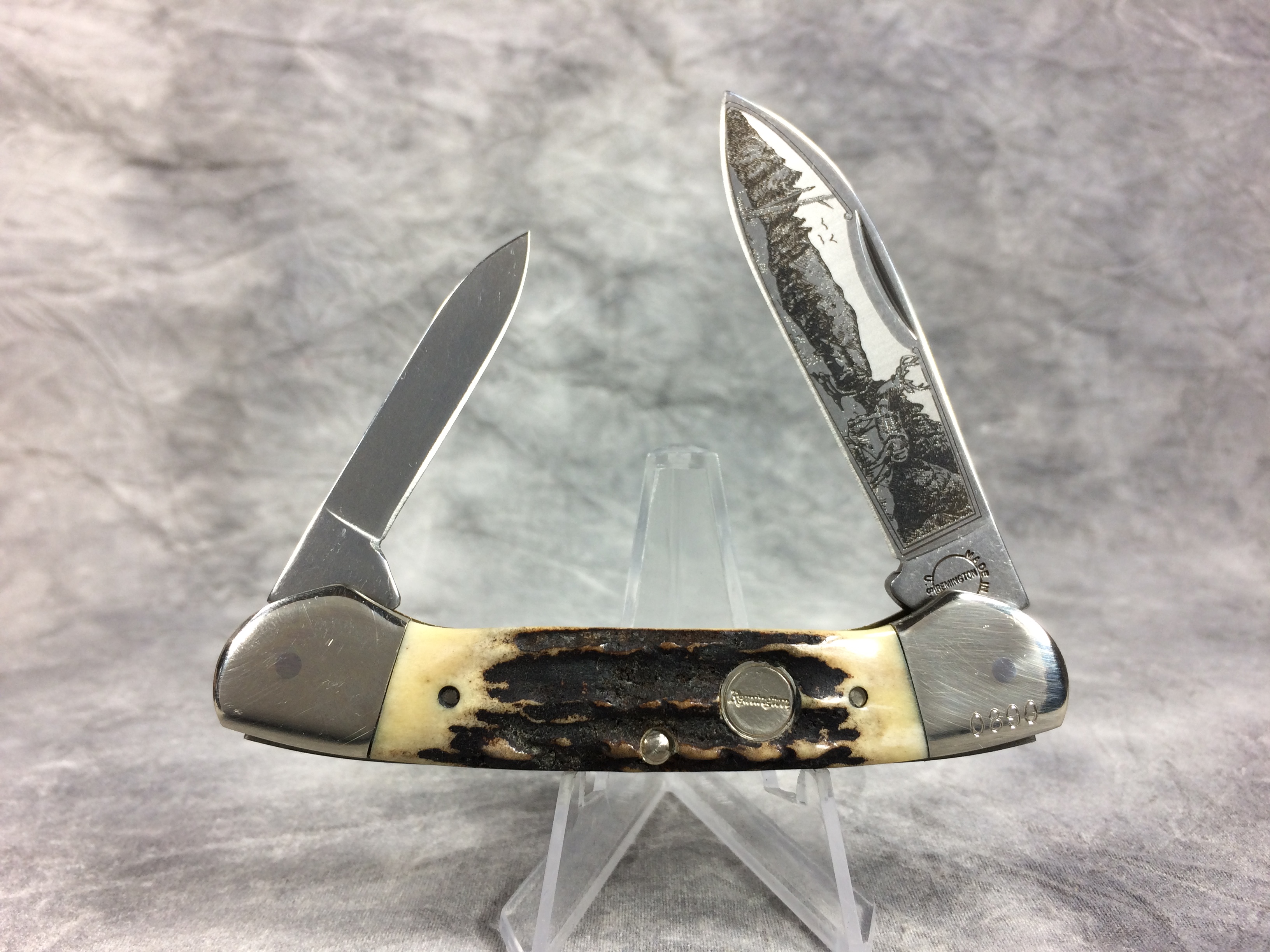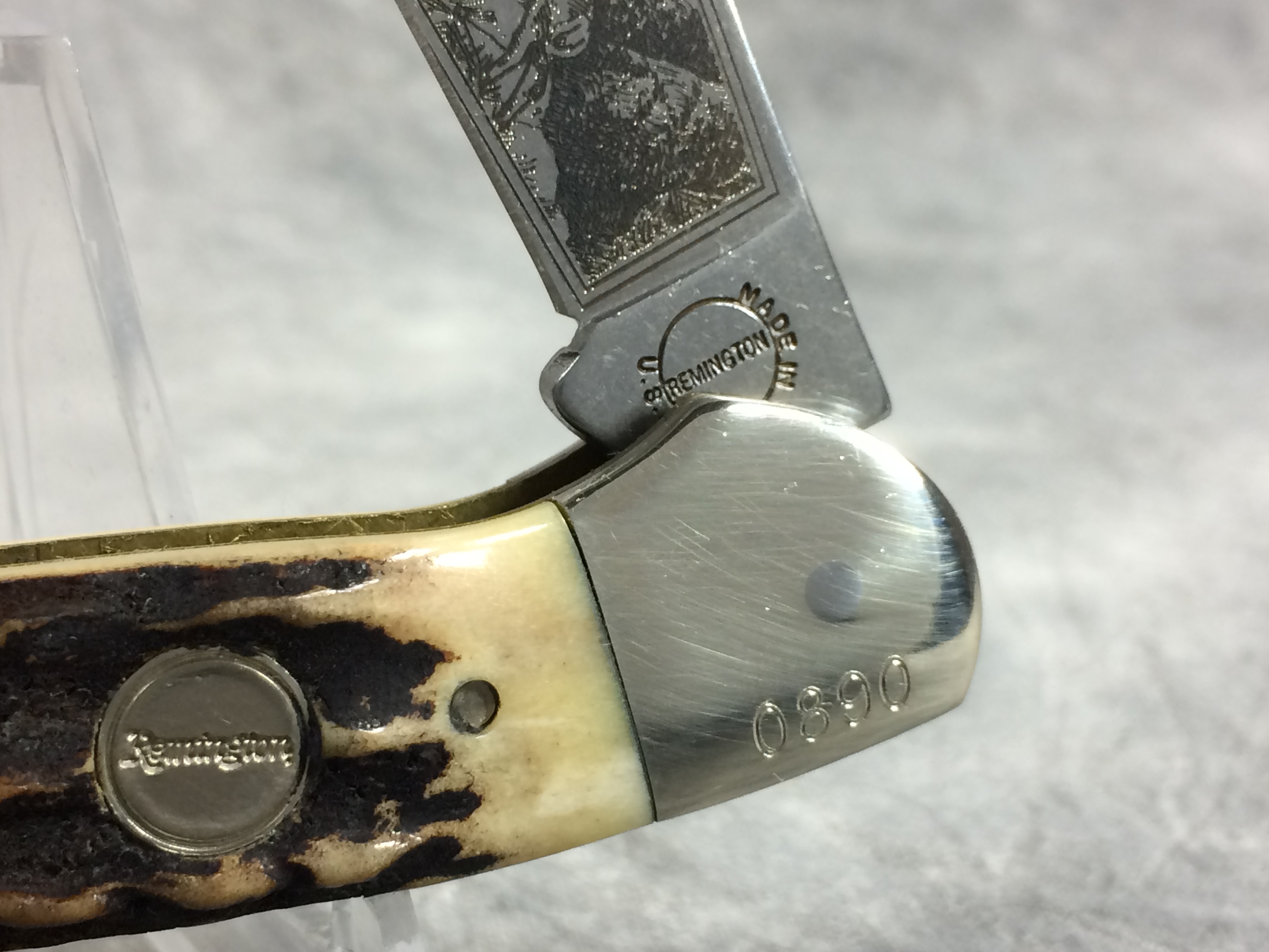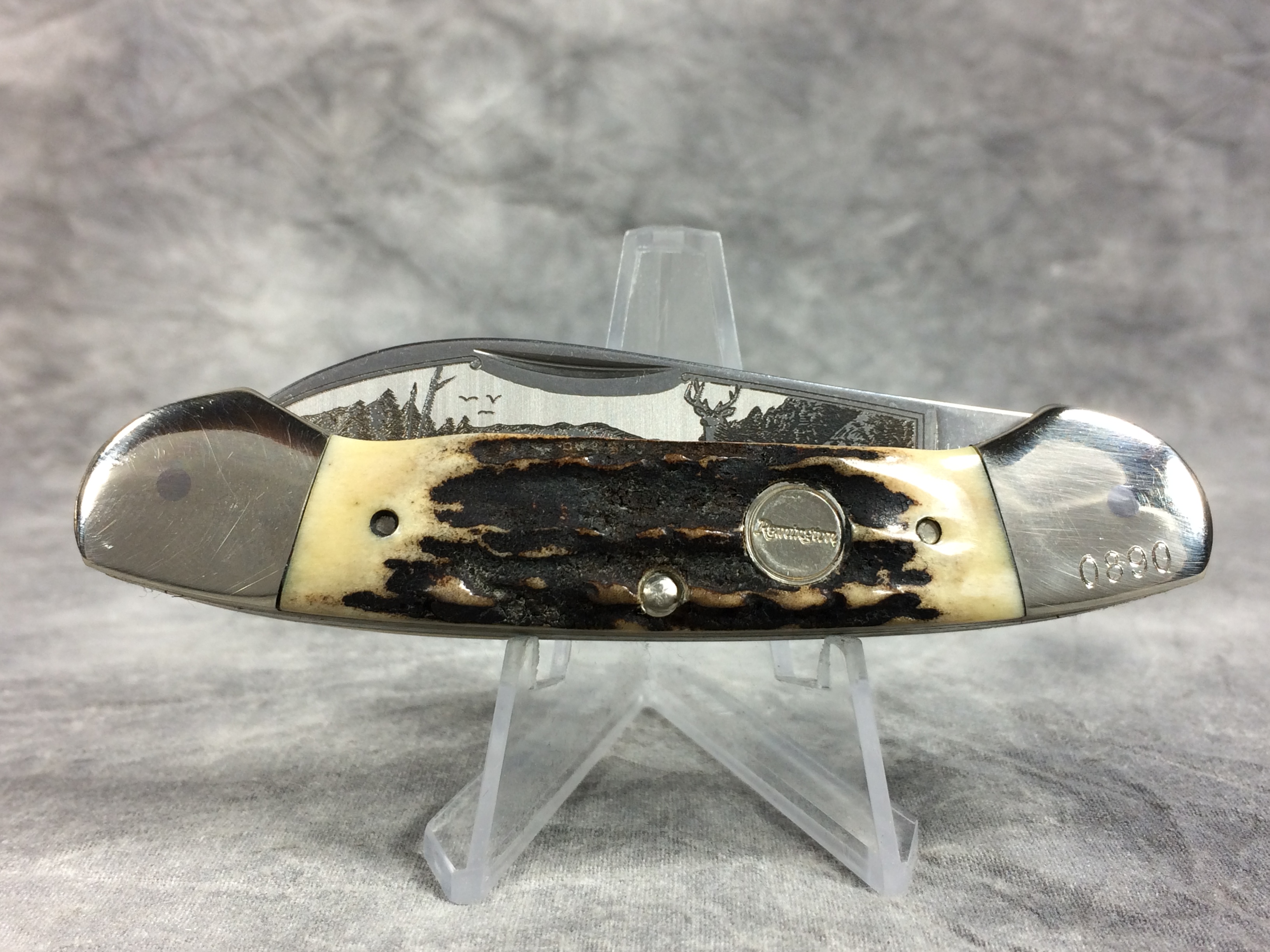 April 10, 2026 - 3-5/8 inches closed. 6-1/8 inches open. Made in USA. Circle "Remington" with "MADE IN U.S.A." around the circle and "1996" tang stamps. Circle "Remington" shield. Stainless Steel blades. Main blade etched with deer scene on front. Stag handle. Nickel Silver bolsters. Front right bolster etched with serial #0890. Brass liner. With original box and paperwork.