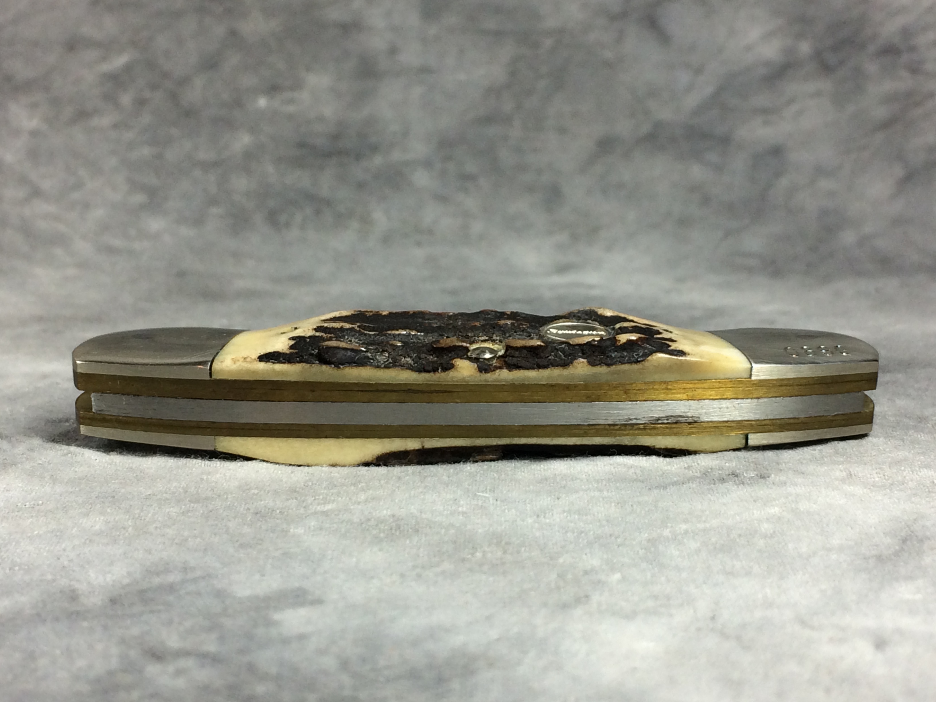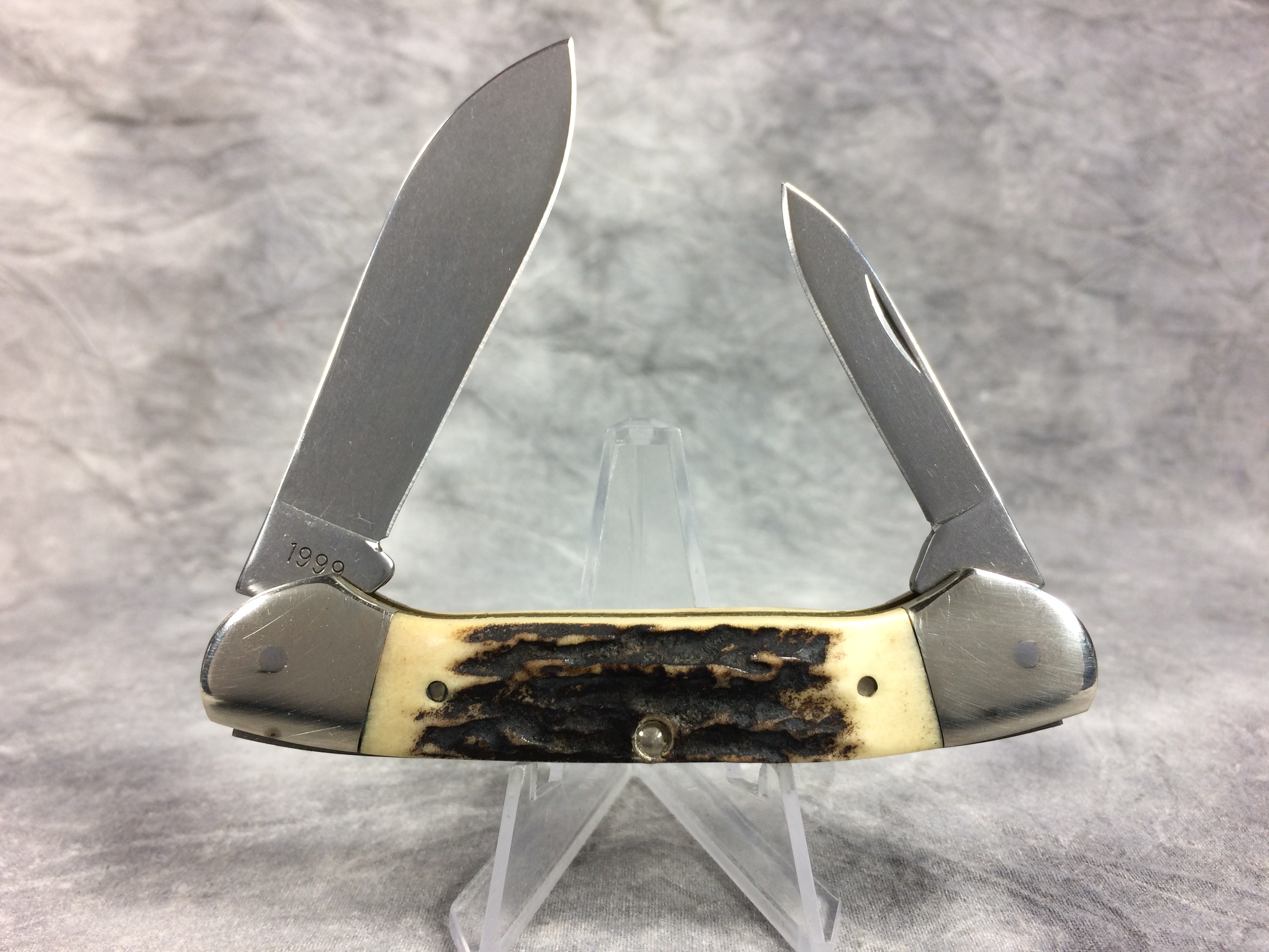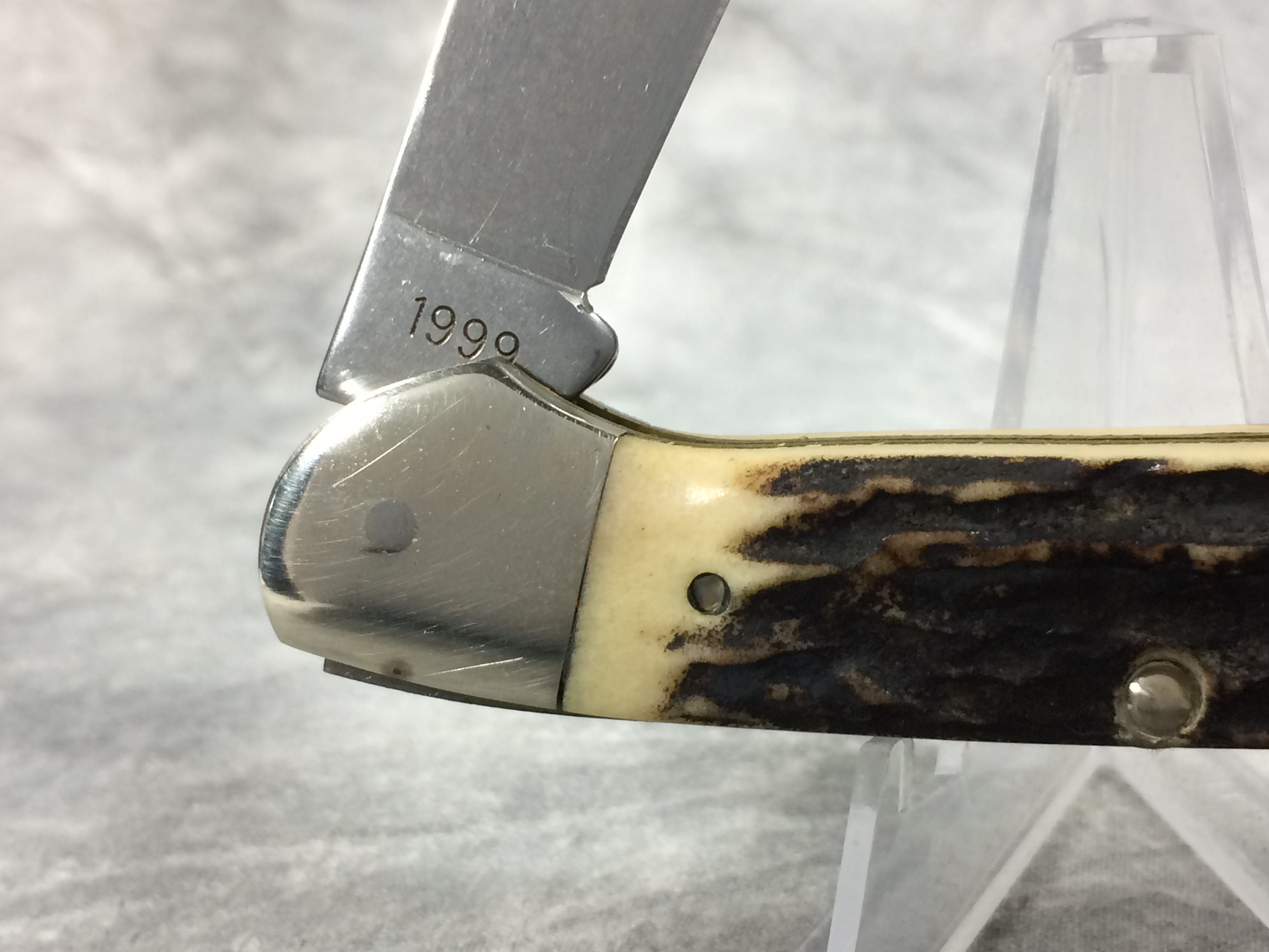 April 10, 2026 - 3-5/8 inches closed. 6-1/8 inches open. Made in USA. Circle "Remington" with "MADE IN U.S.A." around the circle and "1996" tang stamps. Circle "Remington" shield. Stainless Steel blades. Main blade etched with deer scene on front. Stag handle. Nickel Silver bolsters. Front right bolster etched with serial #0890. Brass liner. With original box and paperwork.