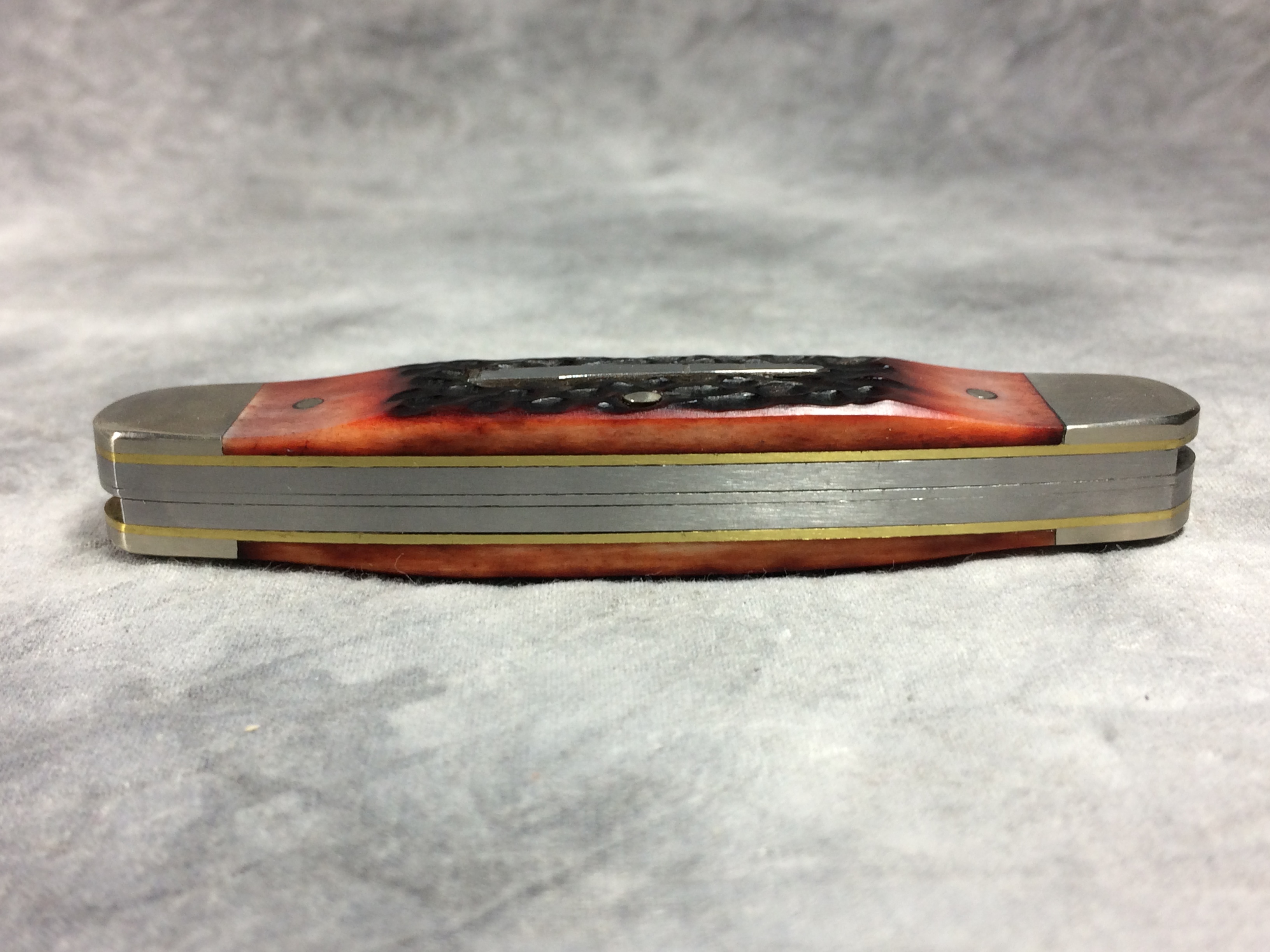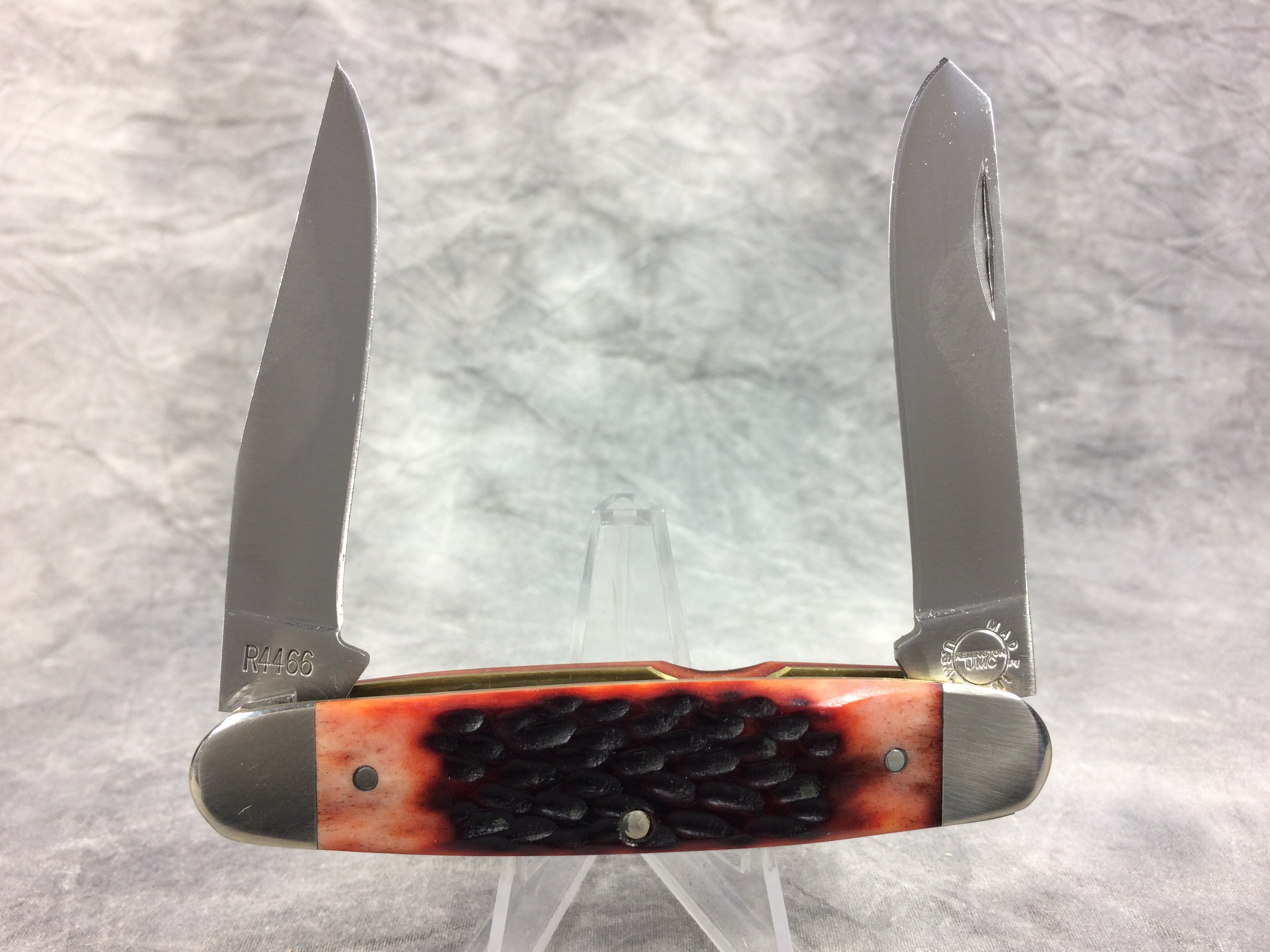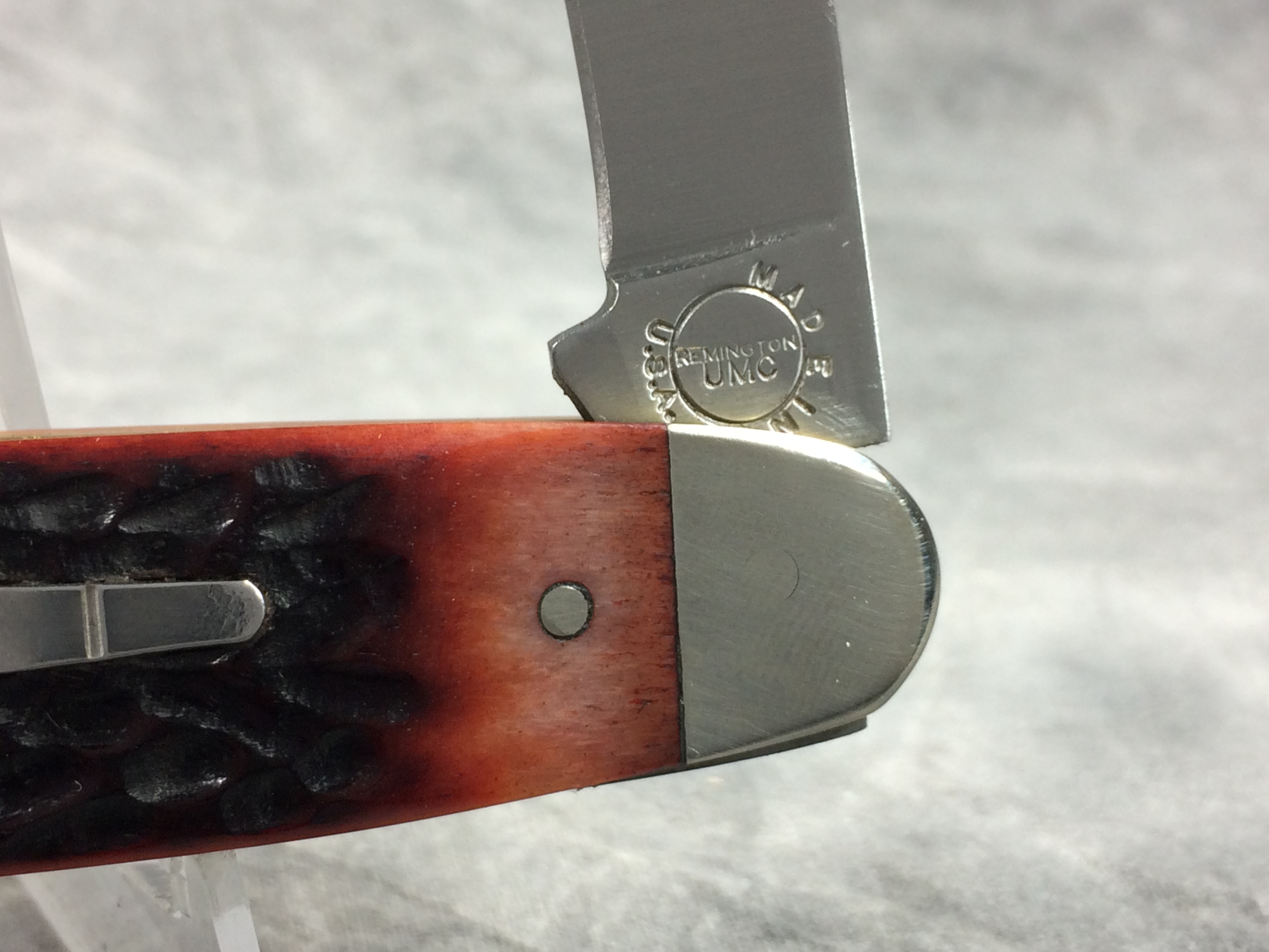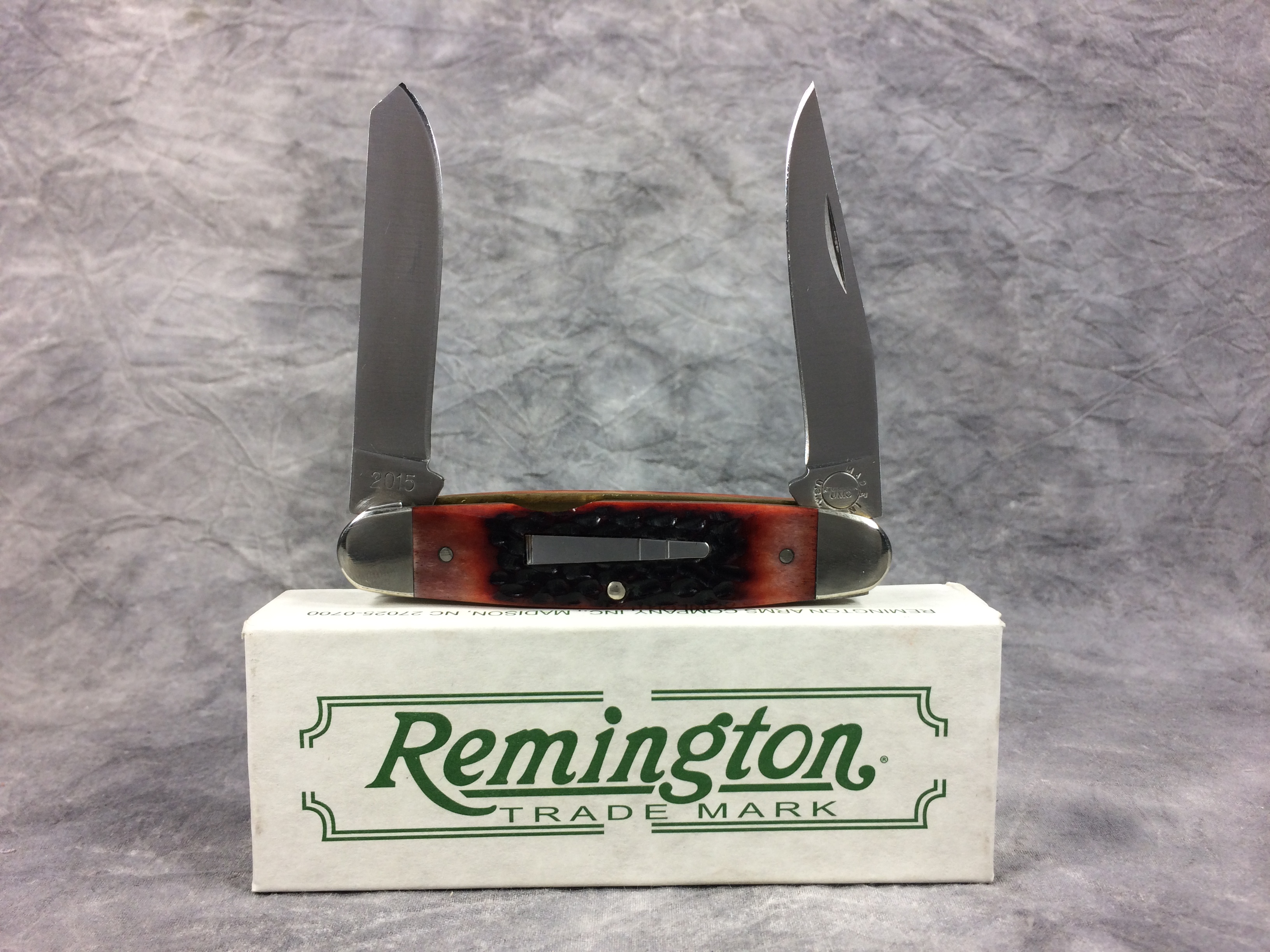 December 07, 2025 - 2-Blade Cliffhanger Bullet Knife. 3-3/4 inches closed. 6-1/2 inches open. Made in USA. 'Remington UMC Made in USA' and 'R4466' and '2015' tang stamp. Bullet shield. Stainless steel blades. Amber jigged bone handle. Nickel silver bolsters. Brass liner. With original box and paperwork.