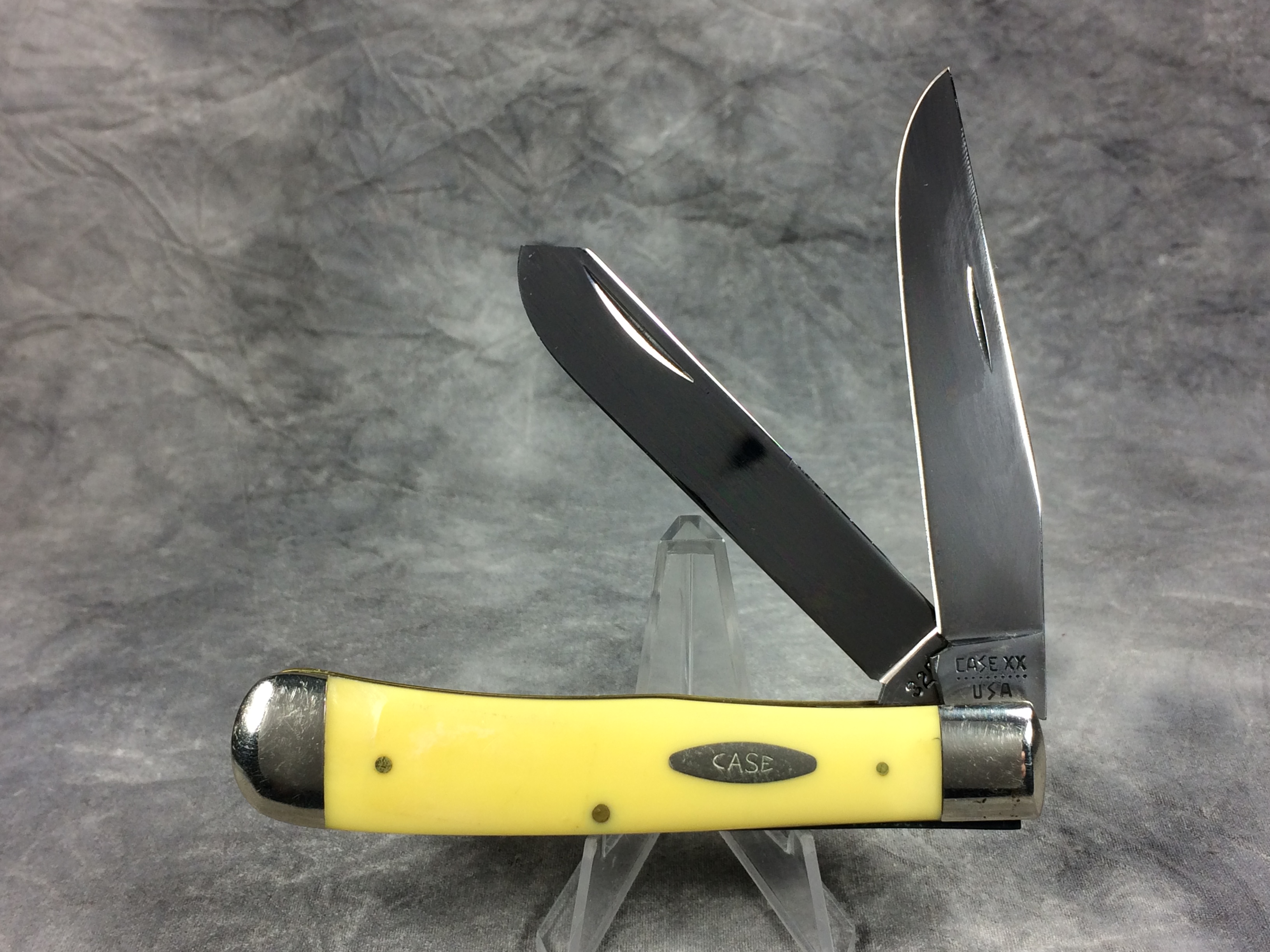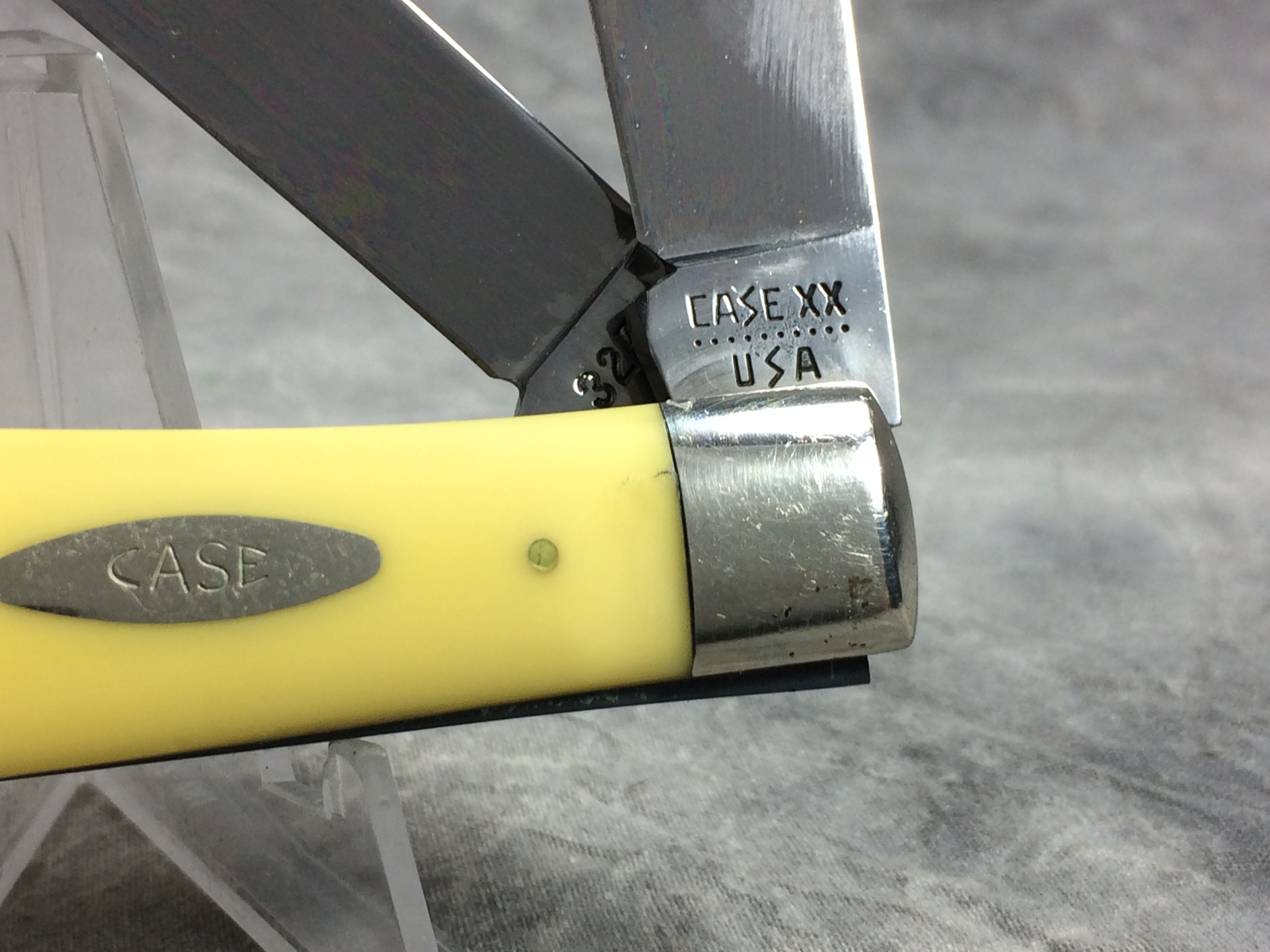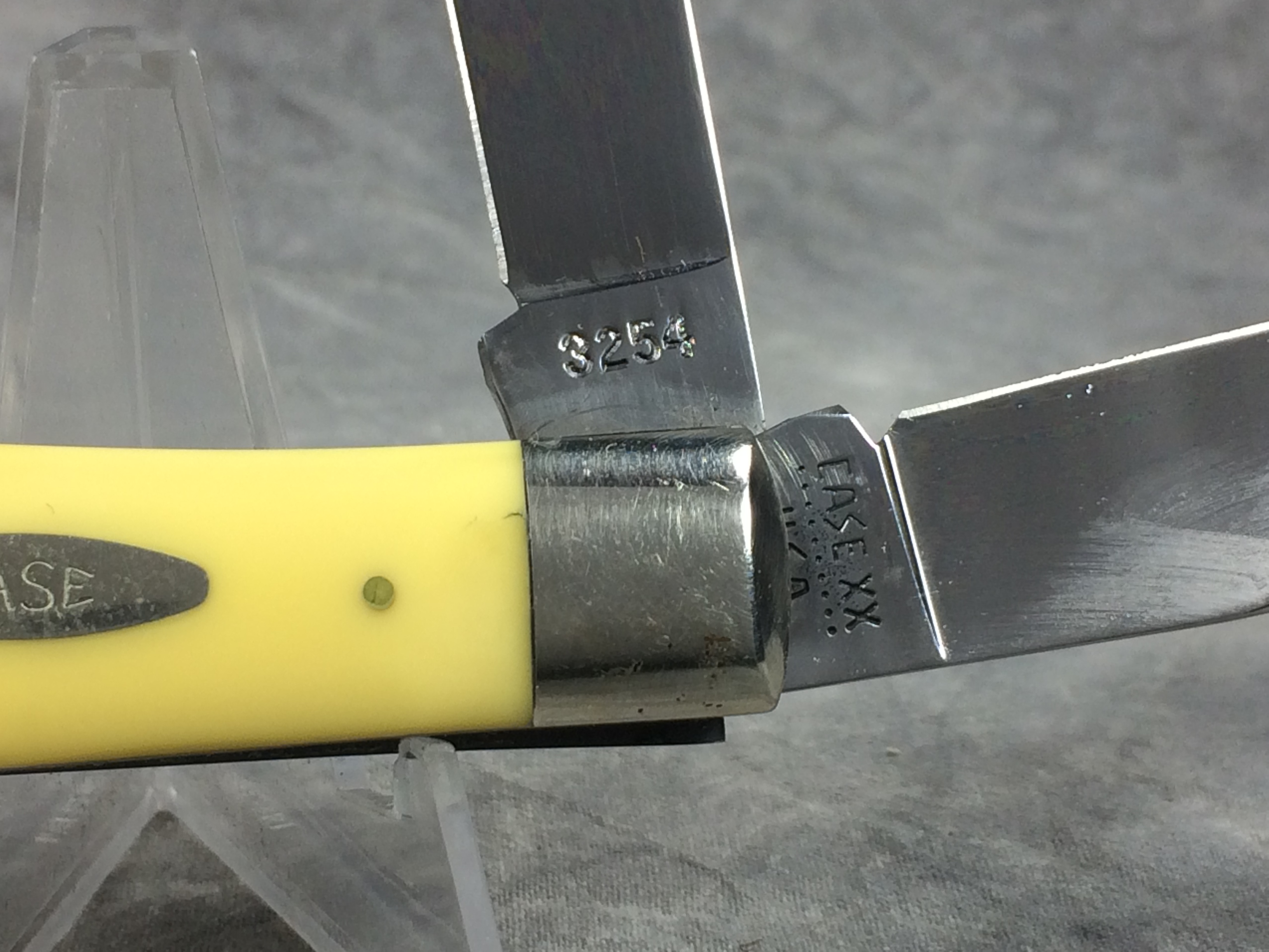 November 06, 2025 - 4-1/8 inches closed. 7-3/8 inches open. Made in USA. 'Case XX ********** USA' (10 dot with lightning bold S) and '3254' tang stamps. Single-oval open-C "CASE" shield. Chrome vanadium blades. Yellow Composition handle. Nickel Silver bolsters. Brass liner.