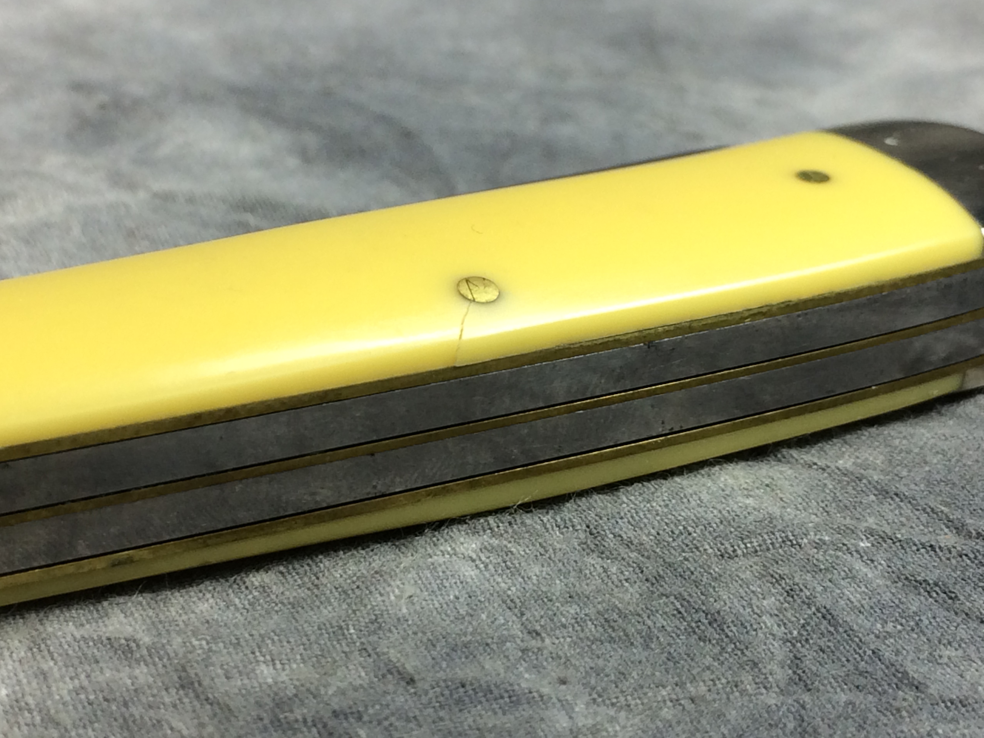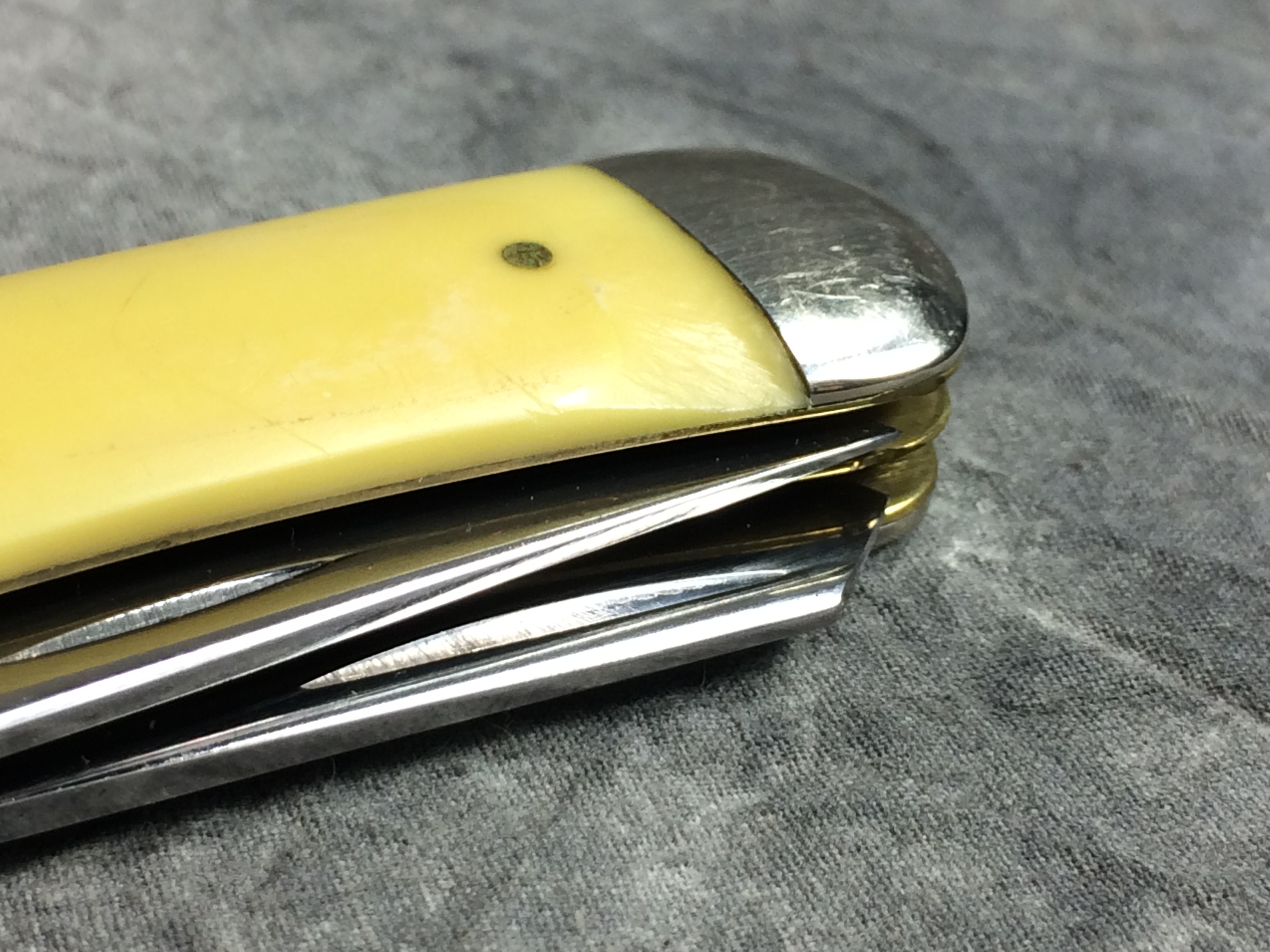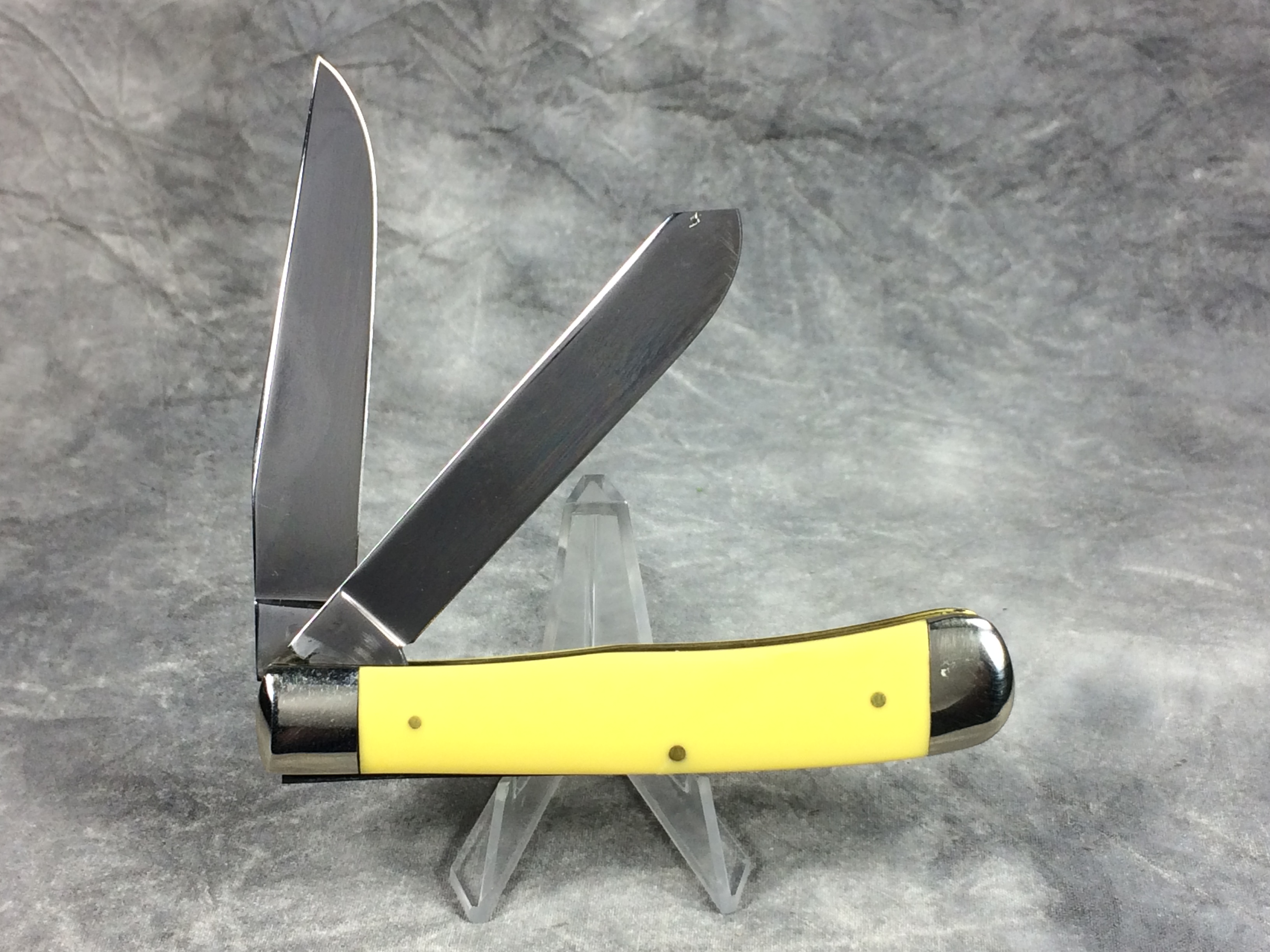 November 06, 2025 - 4-1/8 inches closed. 7-3/8 inches open. Made in USA. 'Case XX ********** USA' (10 dot with lightning bold S) and '3254' tang stamps. Single-oval open-C "CASE" shield. Chrome vanadium blades. Yellow Composition handle. Nickel Silver bolsters. Brass liner.